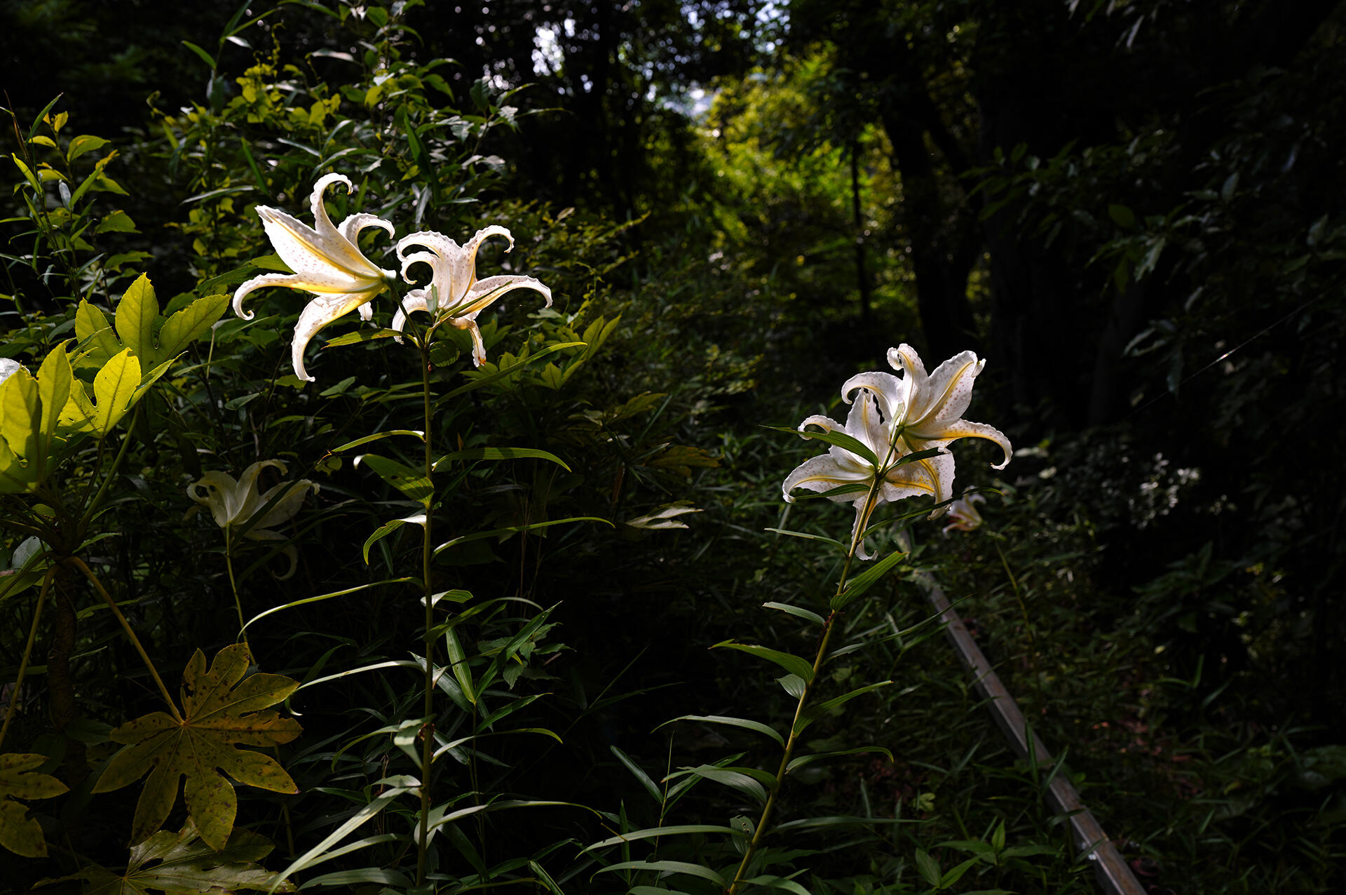 森の整備のためのモノレールとハイキングトレイル間の草むらに咲いたヤマユリの花。花の正面からではなかったが、午後の光が透過光になりいい光景だった。