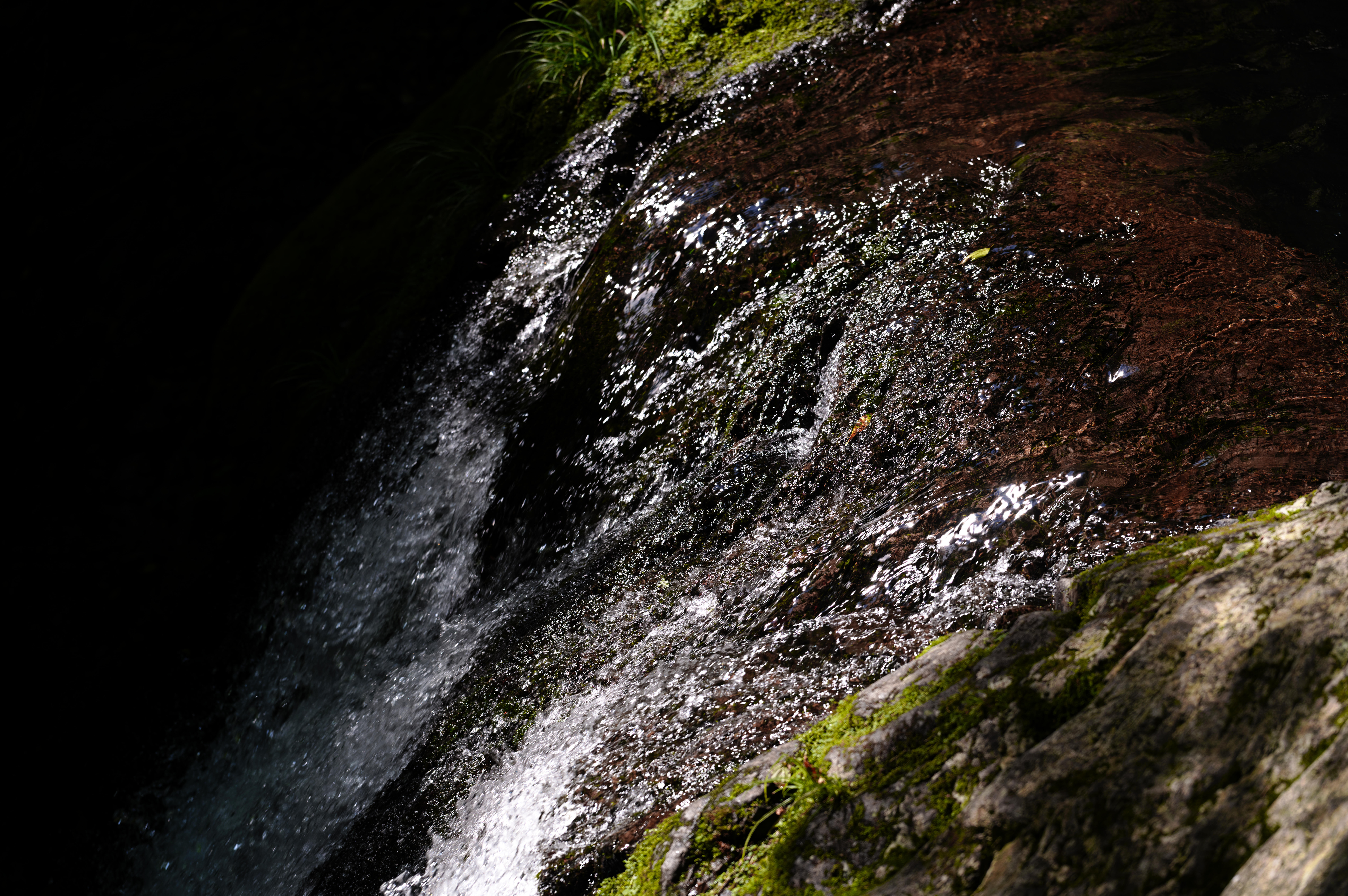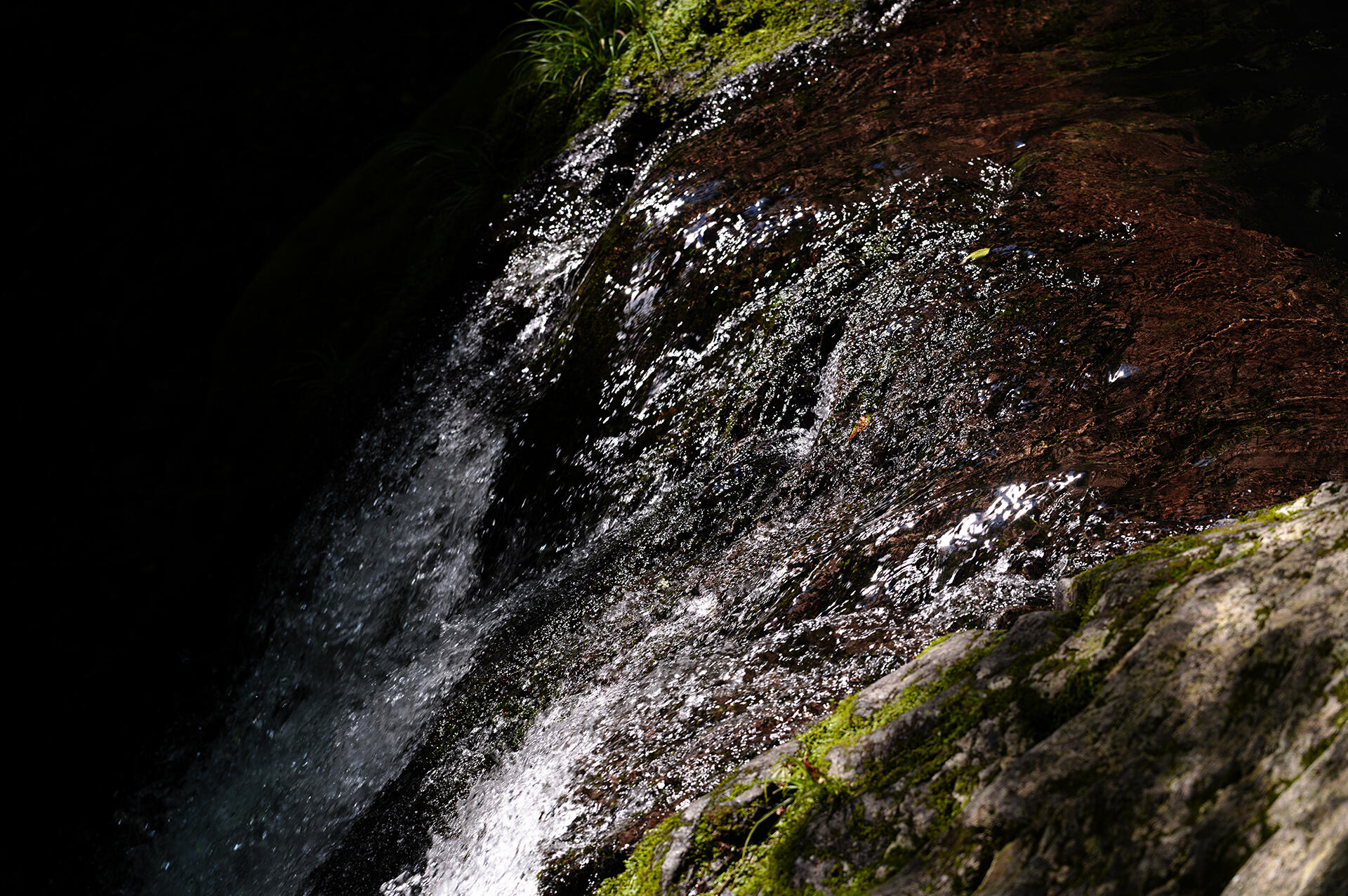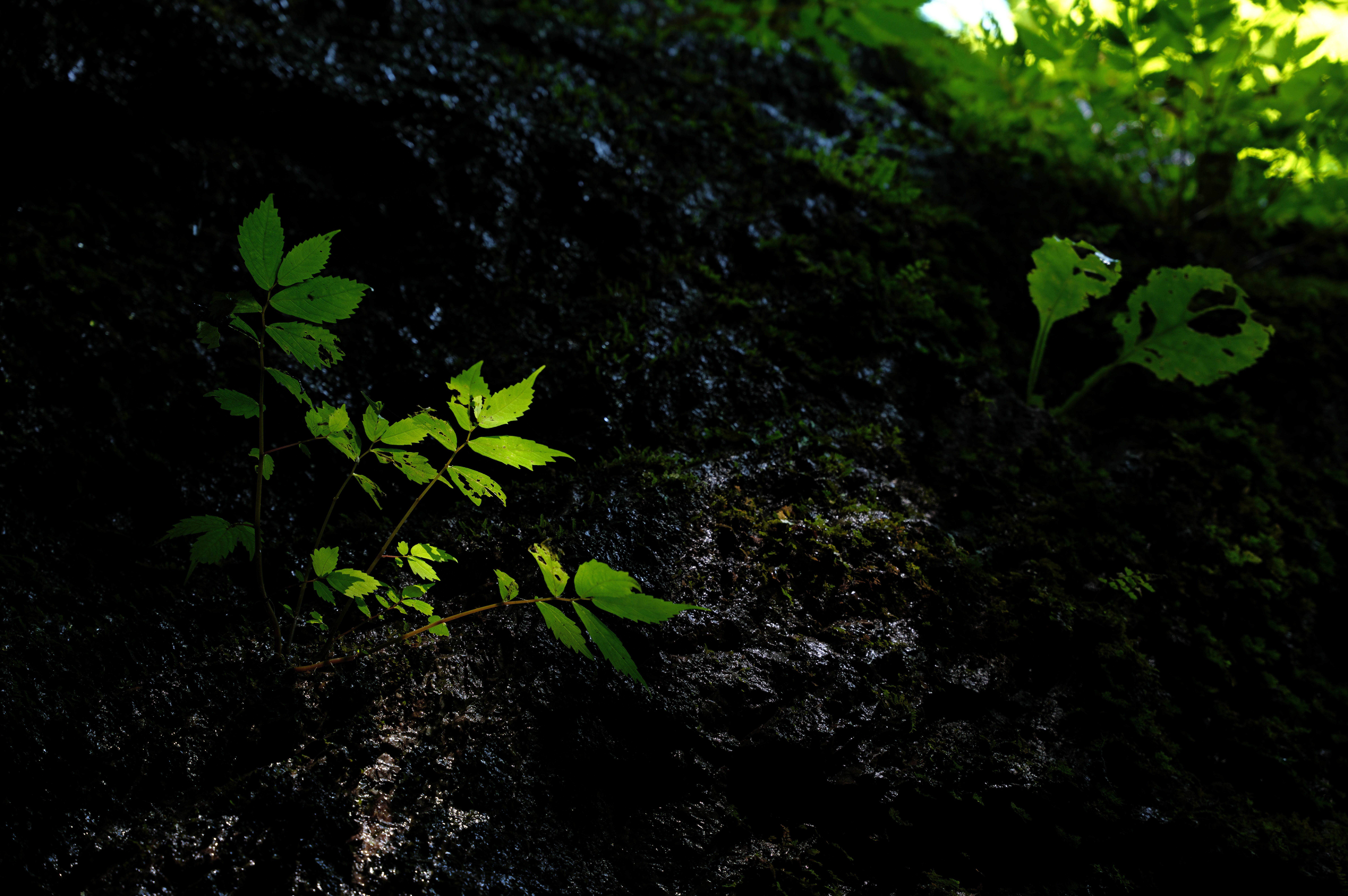 「ネジレノ滝」は暗い岩の間を流れ、滝壺周辺も暗かった。ふと見上げると、朝の木漏れ日が岩壁に生息する植物を照らしていた。