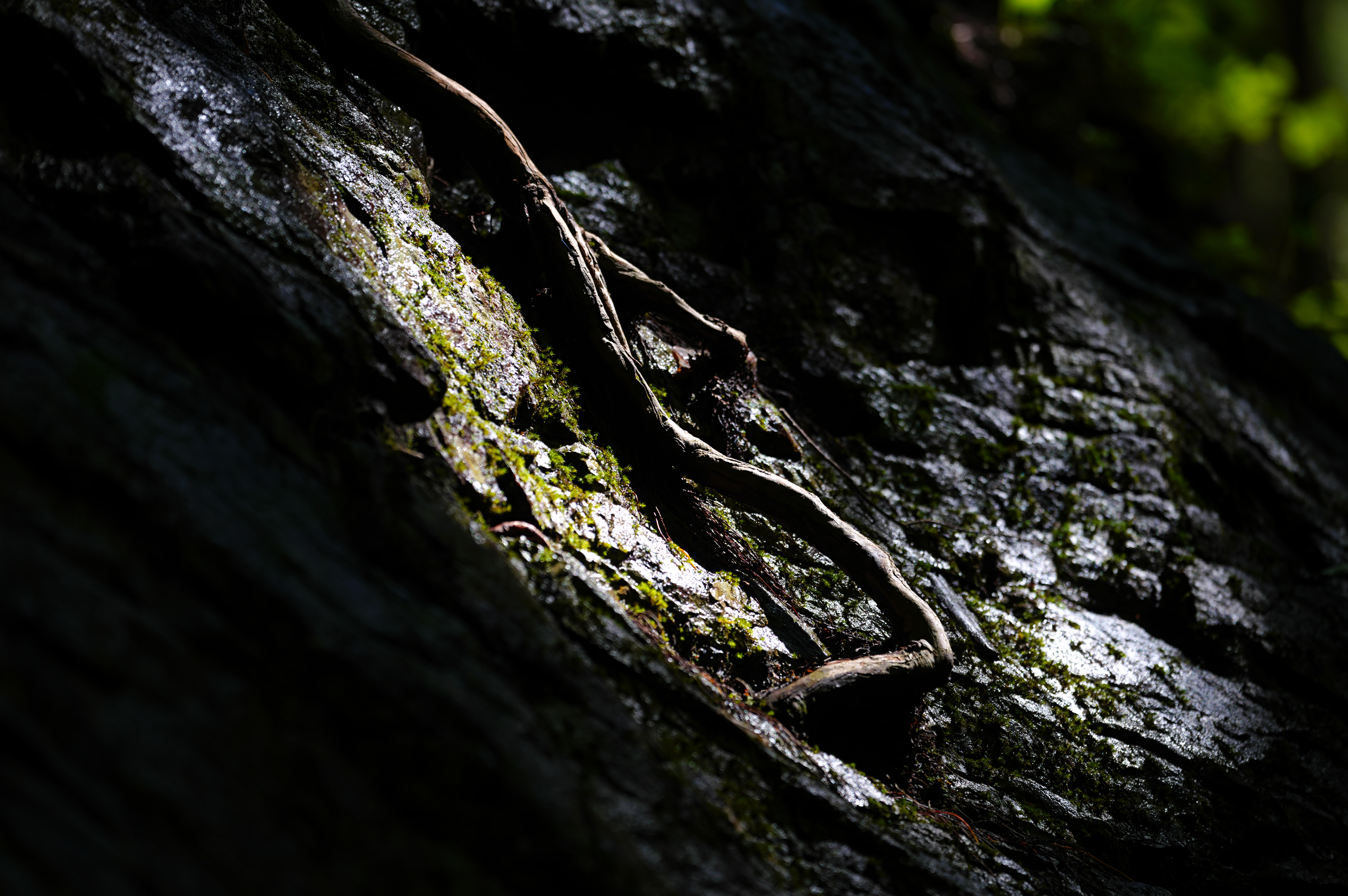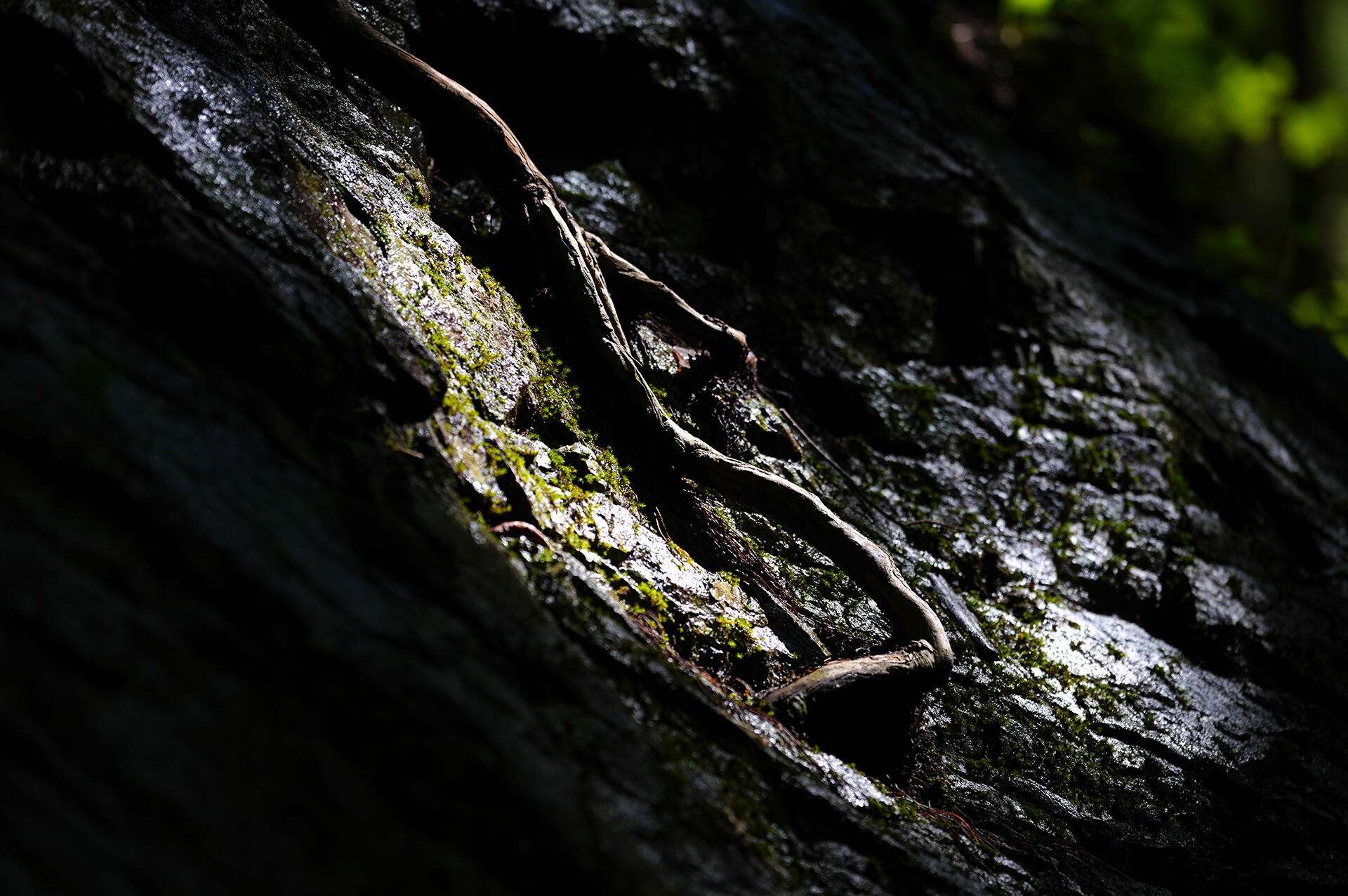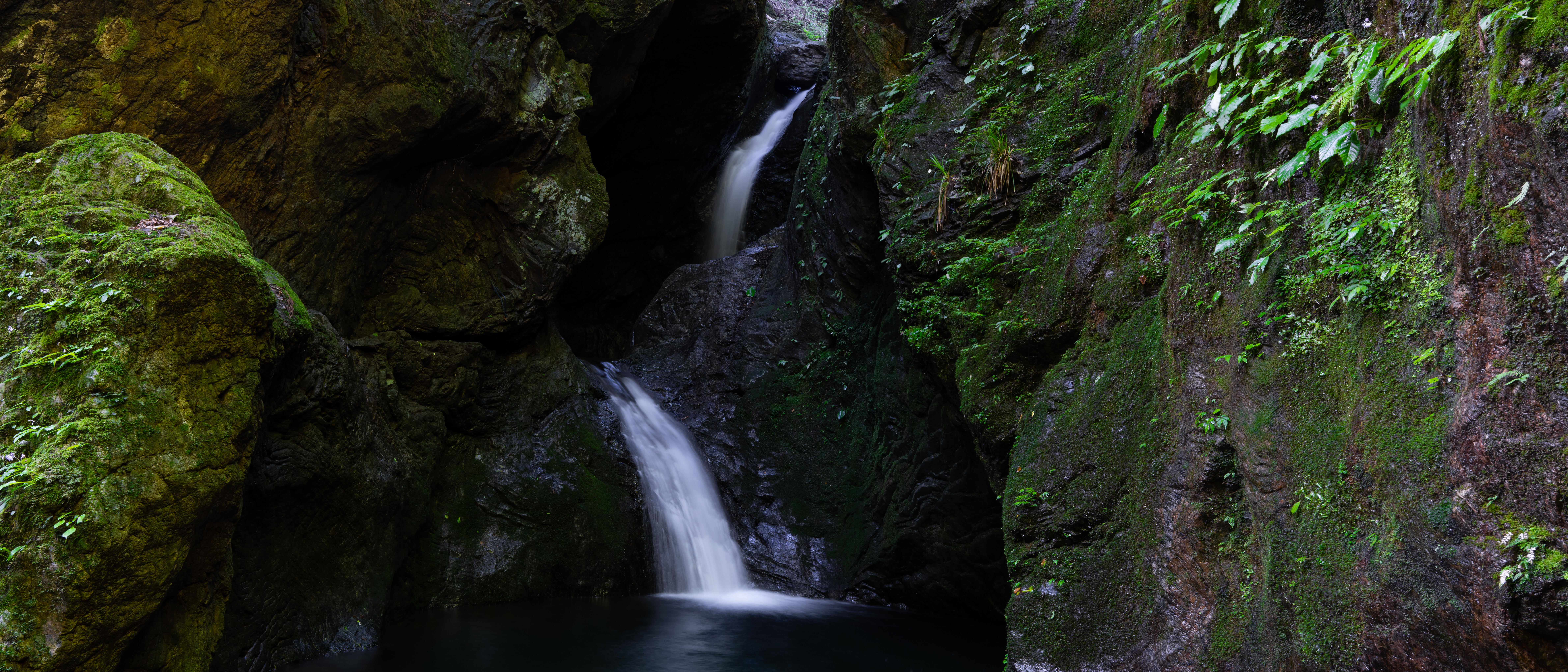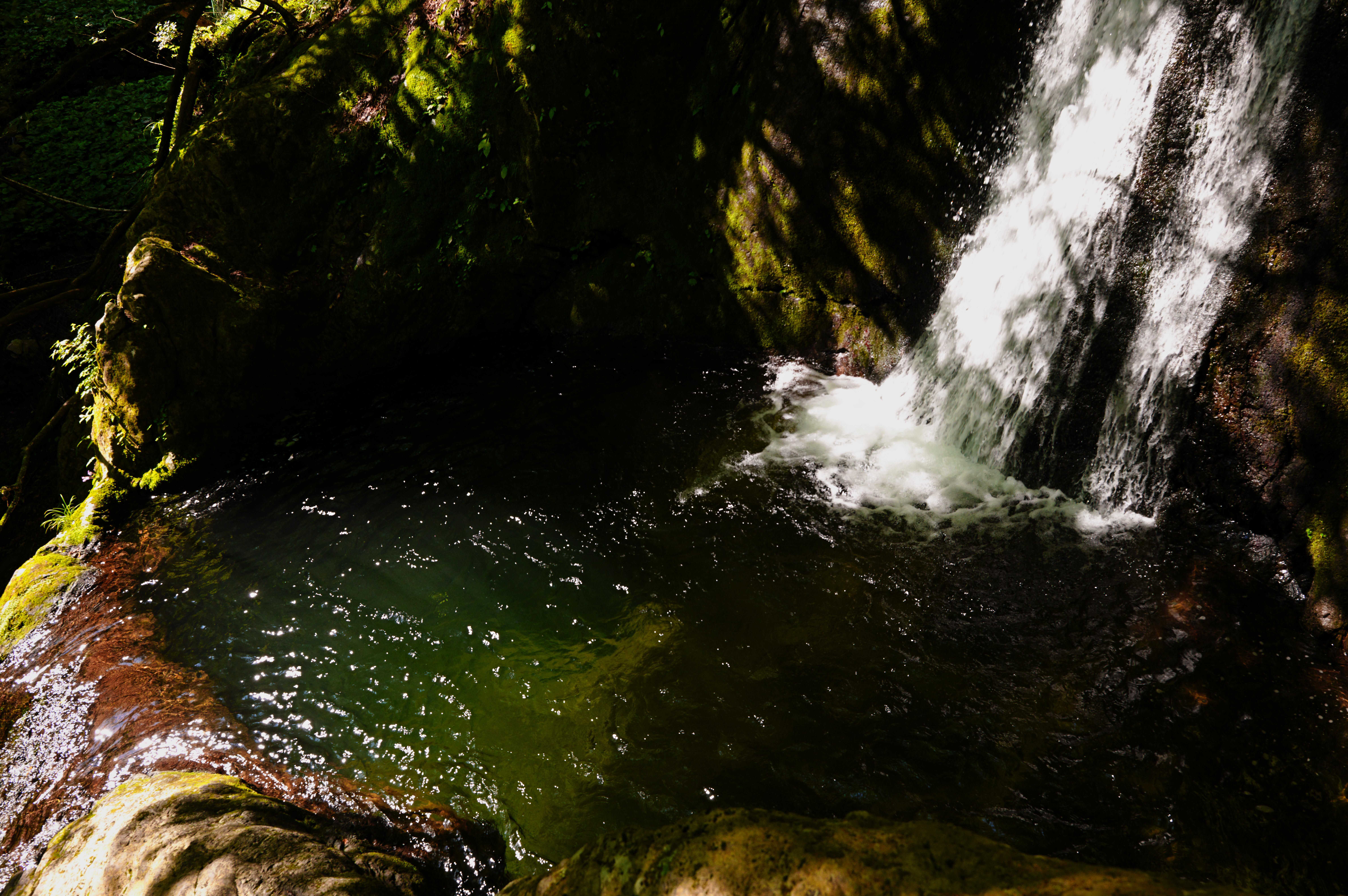 「ネジレノ滝」は暗い岩の間を流れ、滝壺周辺も暗かった。ふと見上げると、朝の木漏れ日が岩壁に生息する植物を照らしていた。