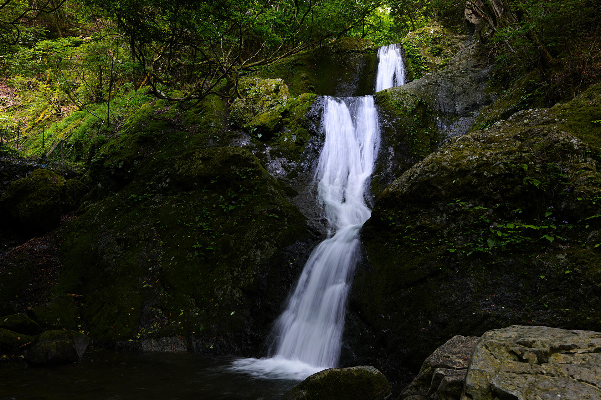 岩の間を流れる滝に向かい、カメラを三脚に据え、構図をしっかり決めた。東京都西多摩郡奥多摩町海澤の海沢渓谷にある上と下がねじれた2段の滝は、上段は北向きで落差 6m、下段は北西向きで落差3m。その形から「ネジレノ滝」と呼ばれ、とても絵になる滝だ。