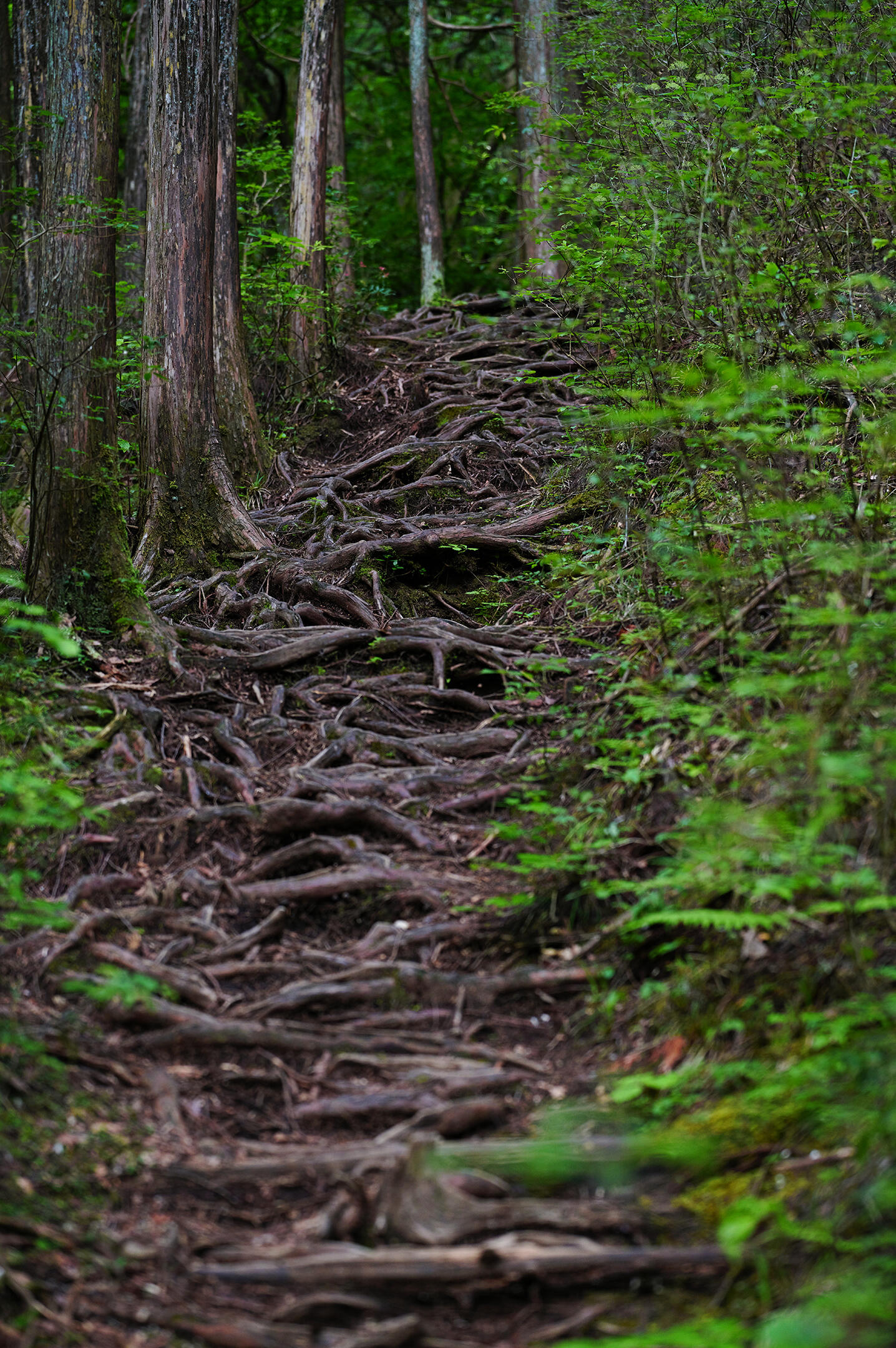 至る所に張り出した木の根。岩の上は滑りやすく、根を手がかりに上り下りした場所もあった。