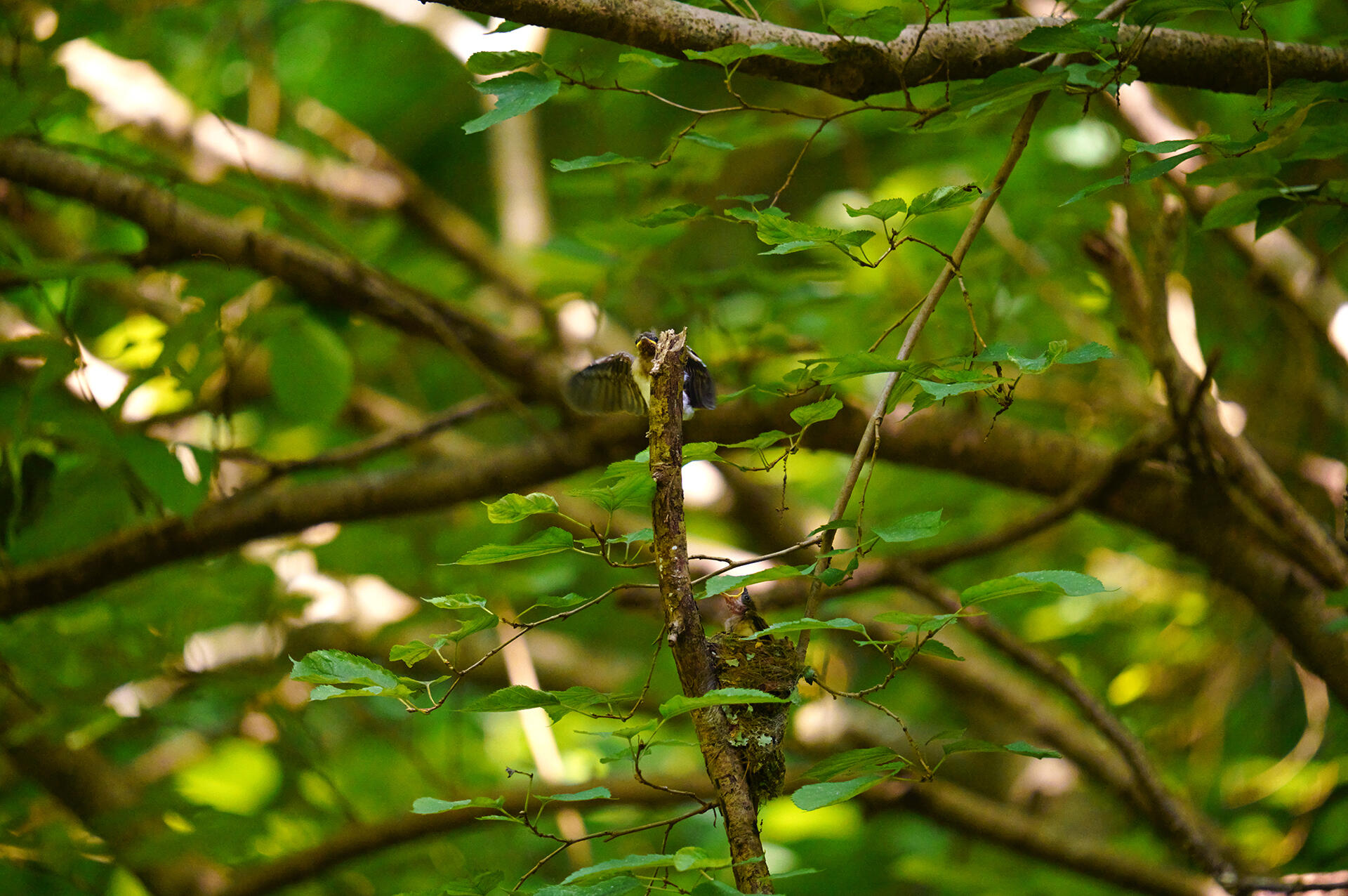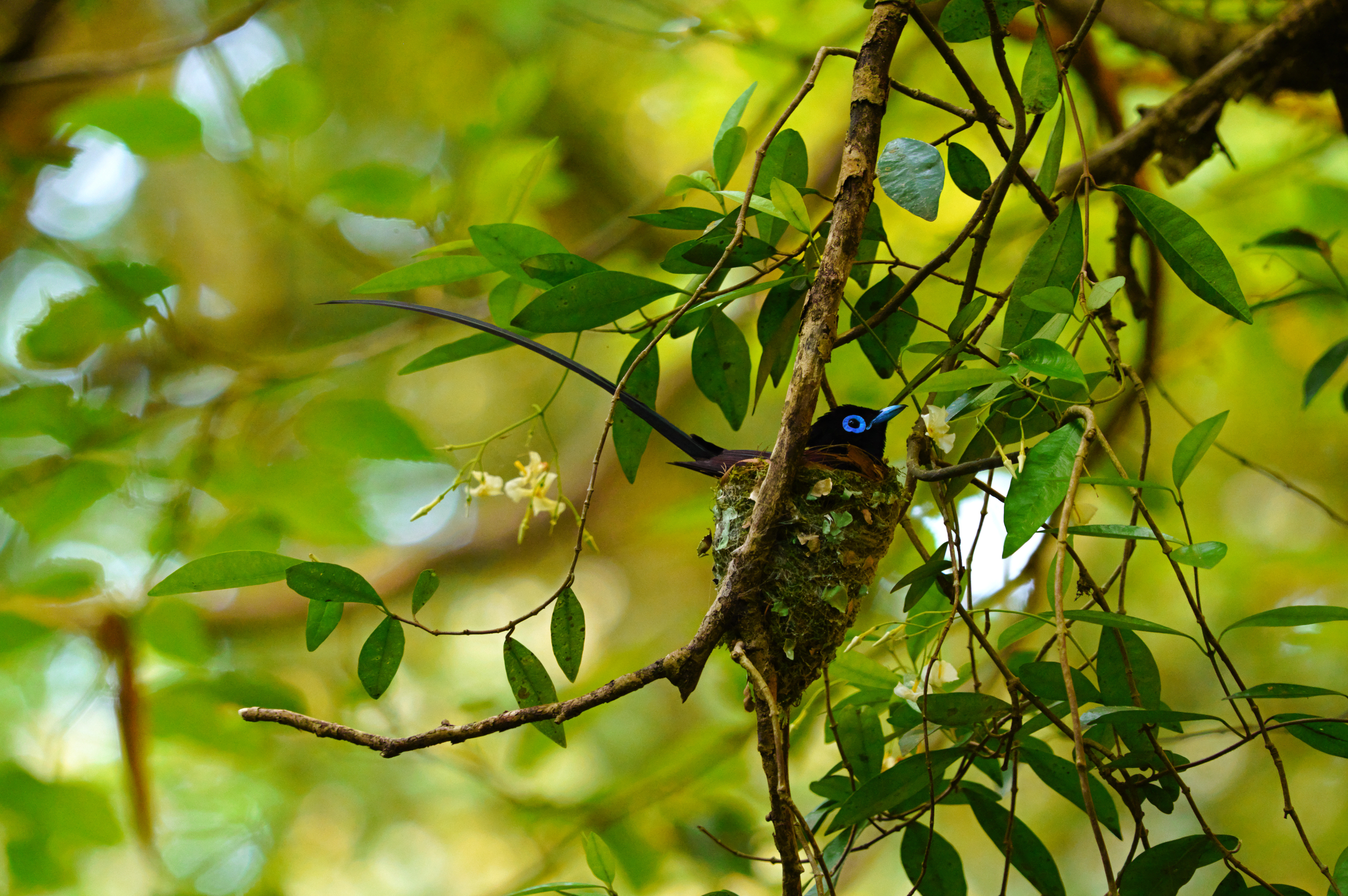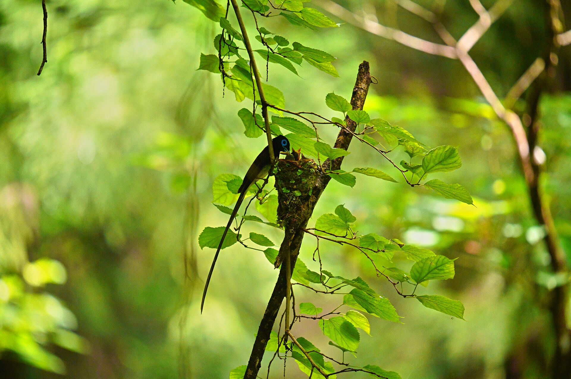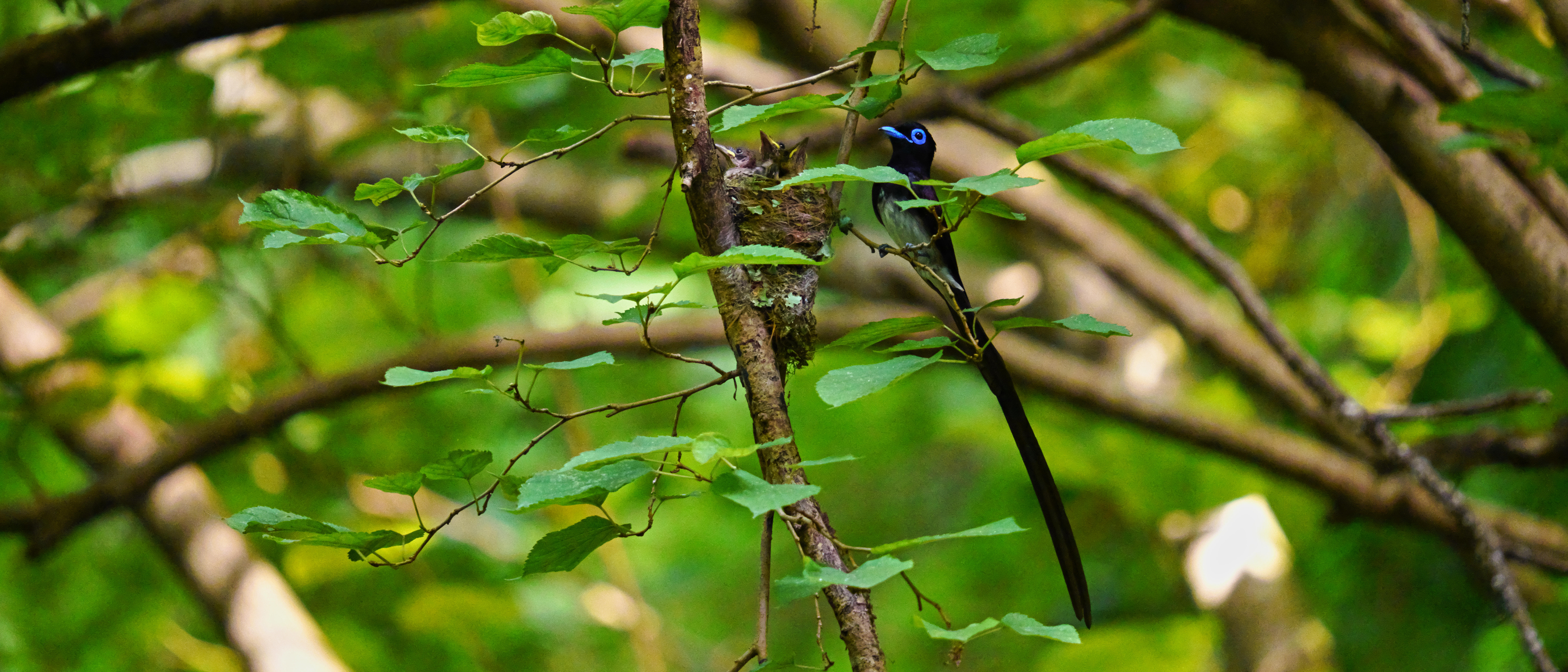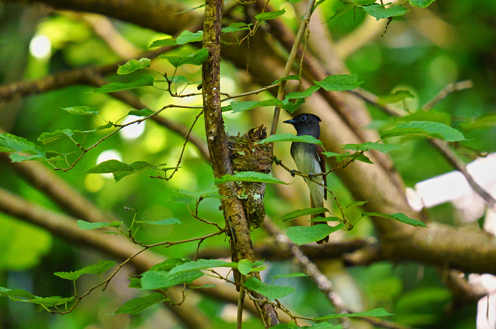 ヒナに餌を持ってきたサンコウチョウのオスが、餌を与えた後、巣を見張るようにしばらく小枝に留まっていた。巣から顔を出している4羽のうち1羽は、この30分後に巣から飛び出し、残りの3羽もこの日無事に巣立ちした。