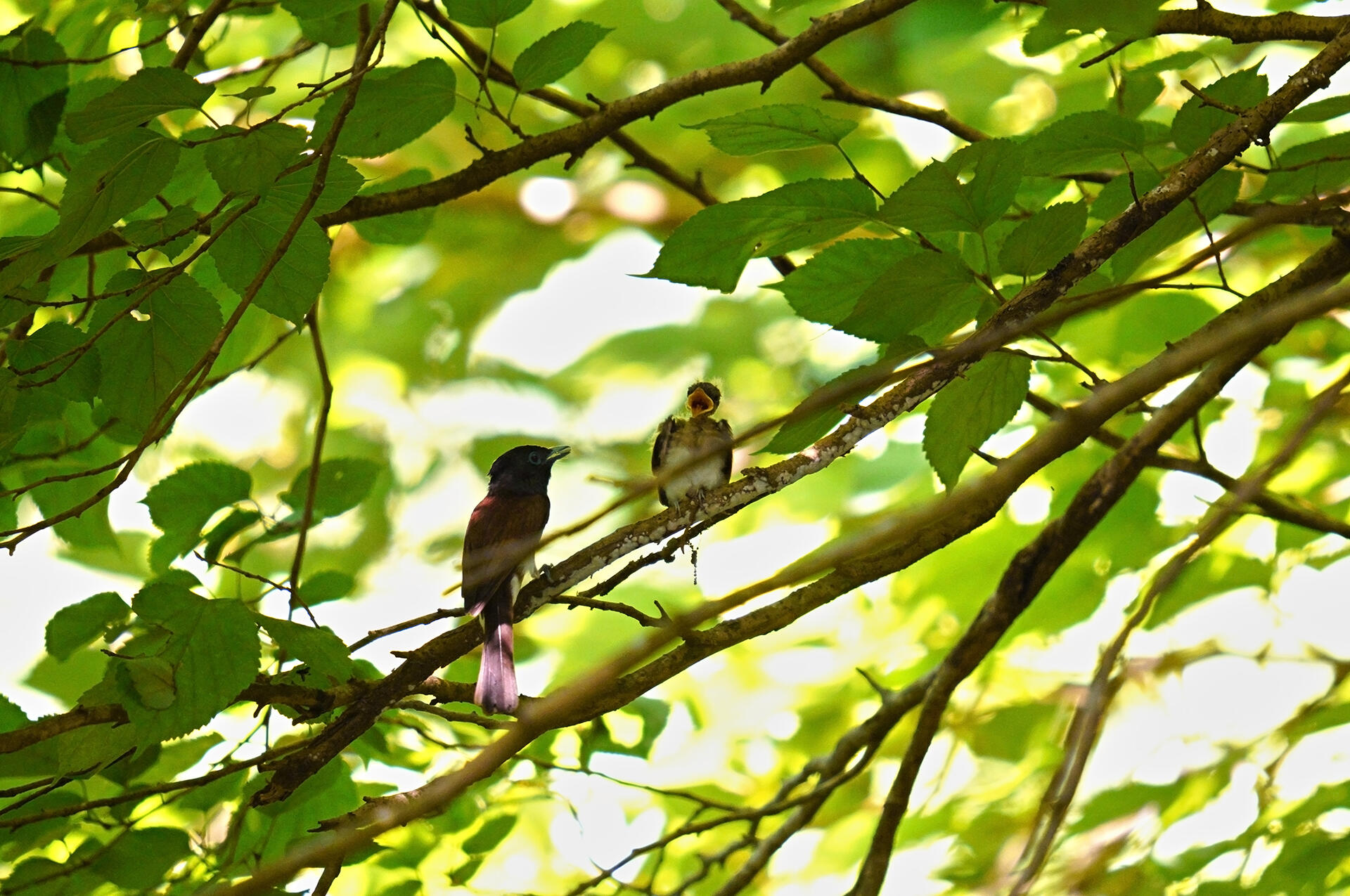 巣立ったヒナは巣から5,6mほど離れた枝に飛んだ。そして、まだ餌が取れないヒナのもとに餌を加えたメスがすぐに飛んで来た。APS-Cサイズにクロップ(35mm概算で918mm)して撮影、高画素が有り難い。