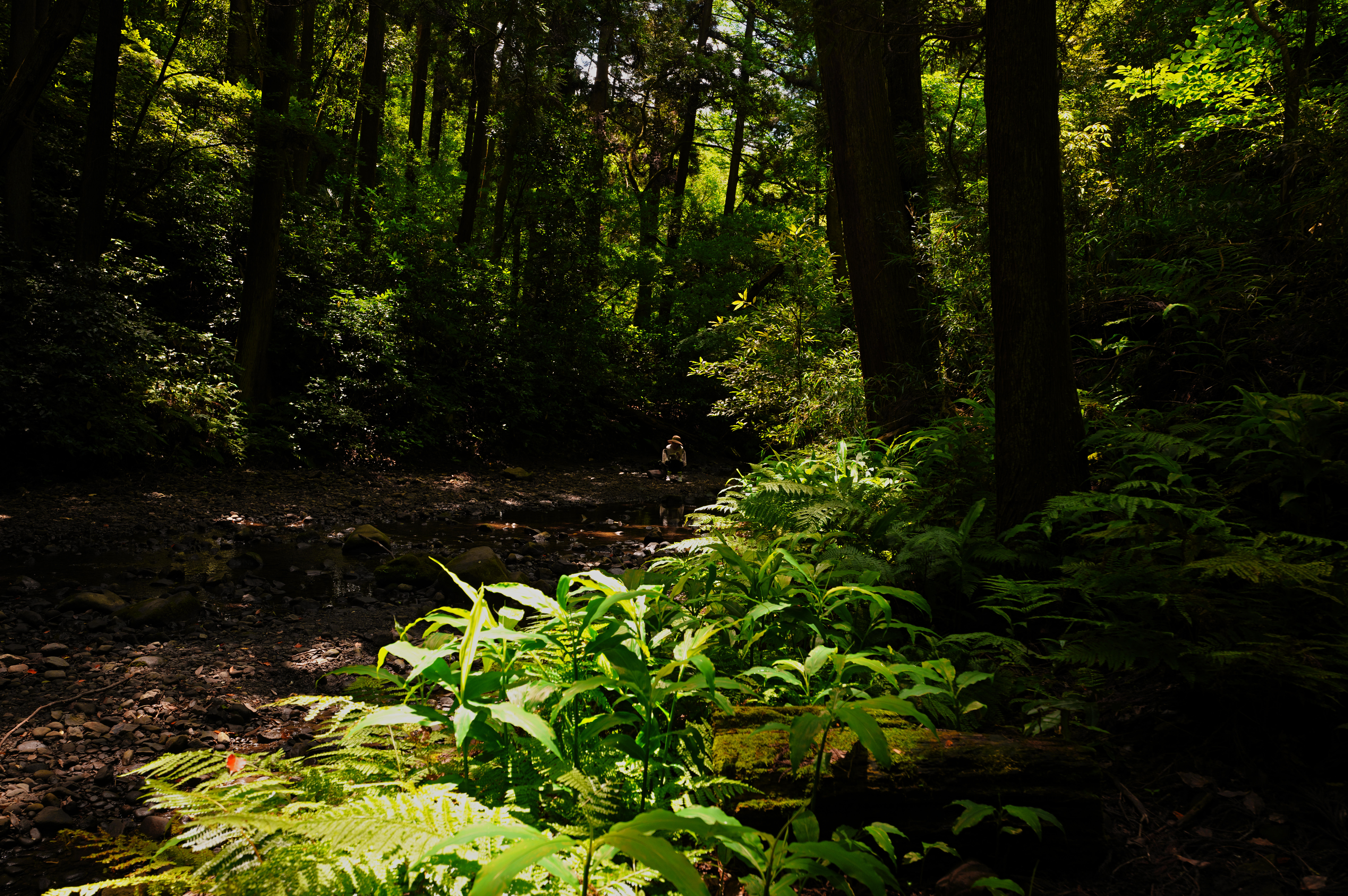 6月12日朝の7時半を過ぎると鳥目当ての人も増え、逆光気味の朝陽がきつくなったので撮影を切り上げる。林道の奥にもサンコウチョウを見かけた人がいて、奥まで歩くがサンコウチョウは見かけなかった。帰り際、日陰の河原で女性が椅子に座って本を読む光景を撮影した。
