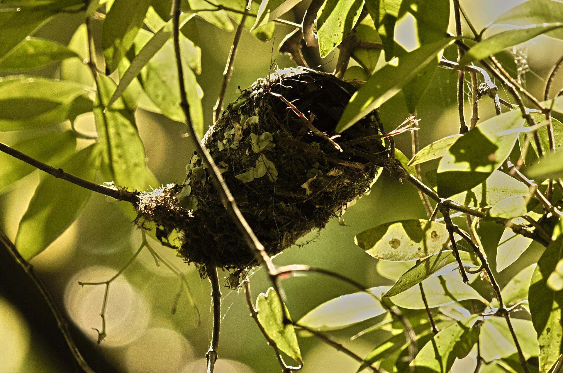 7月5日、帰り道、大雨でヒナが育たたなかった巣を林道から見上げると傾いてもうすぐ落ちそうだった。抱卵中は近づけなかった巣の近くからAPS-C サイズ(35mm概算で918mm)にクロップして撮影。
