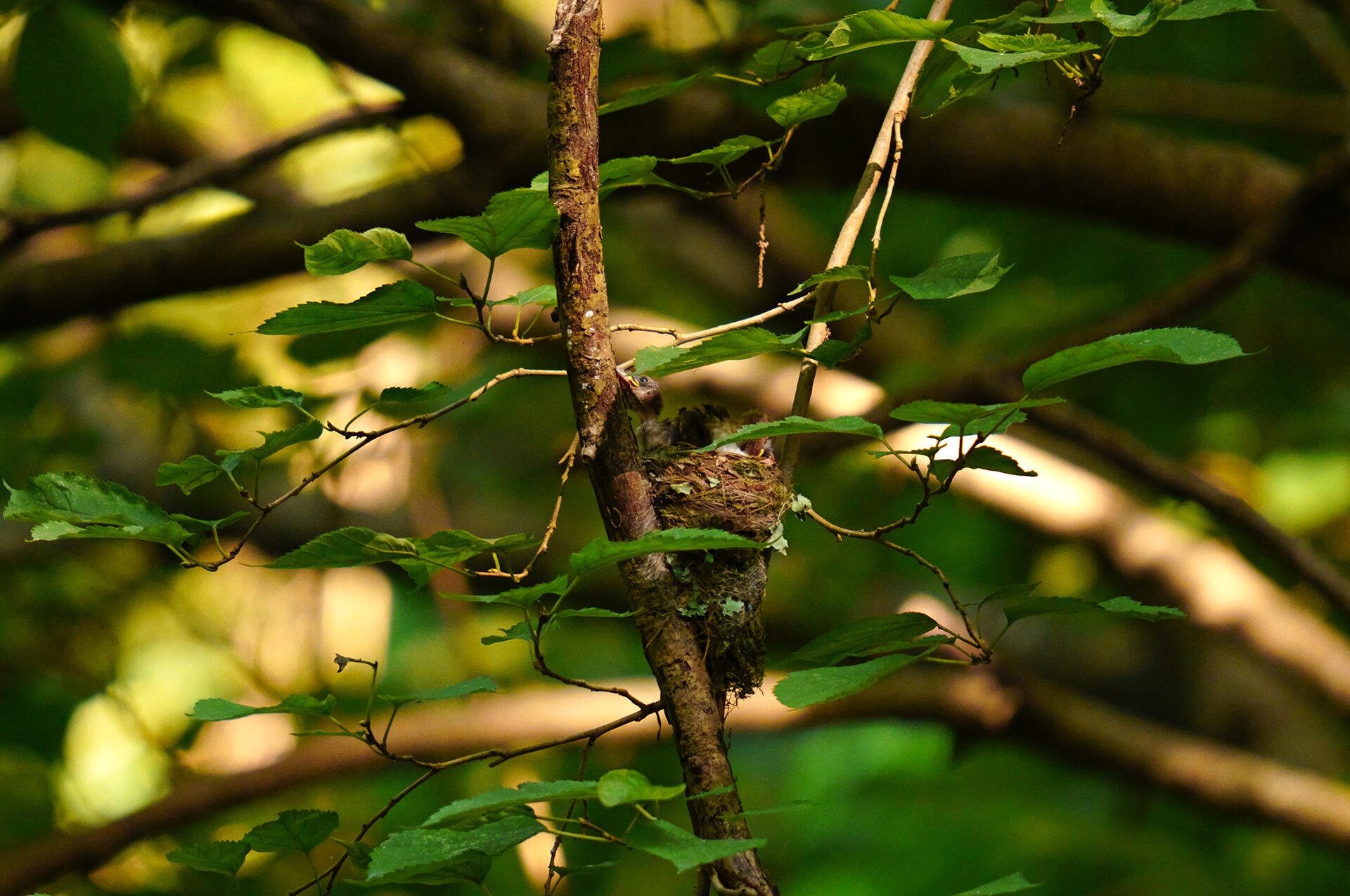 巣立ち間近で活発に動くヒナが4匹いる巣は、小枝についた葉が邪魔をし、森に陽が差しても日陰になりがちだったが、朝陽が1羽のヒナの頭を照らしてくれた僅かな時間があった。APS-C サイズ(35mm概算で918mm)