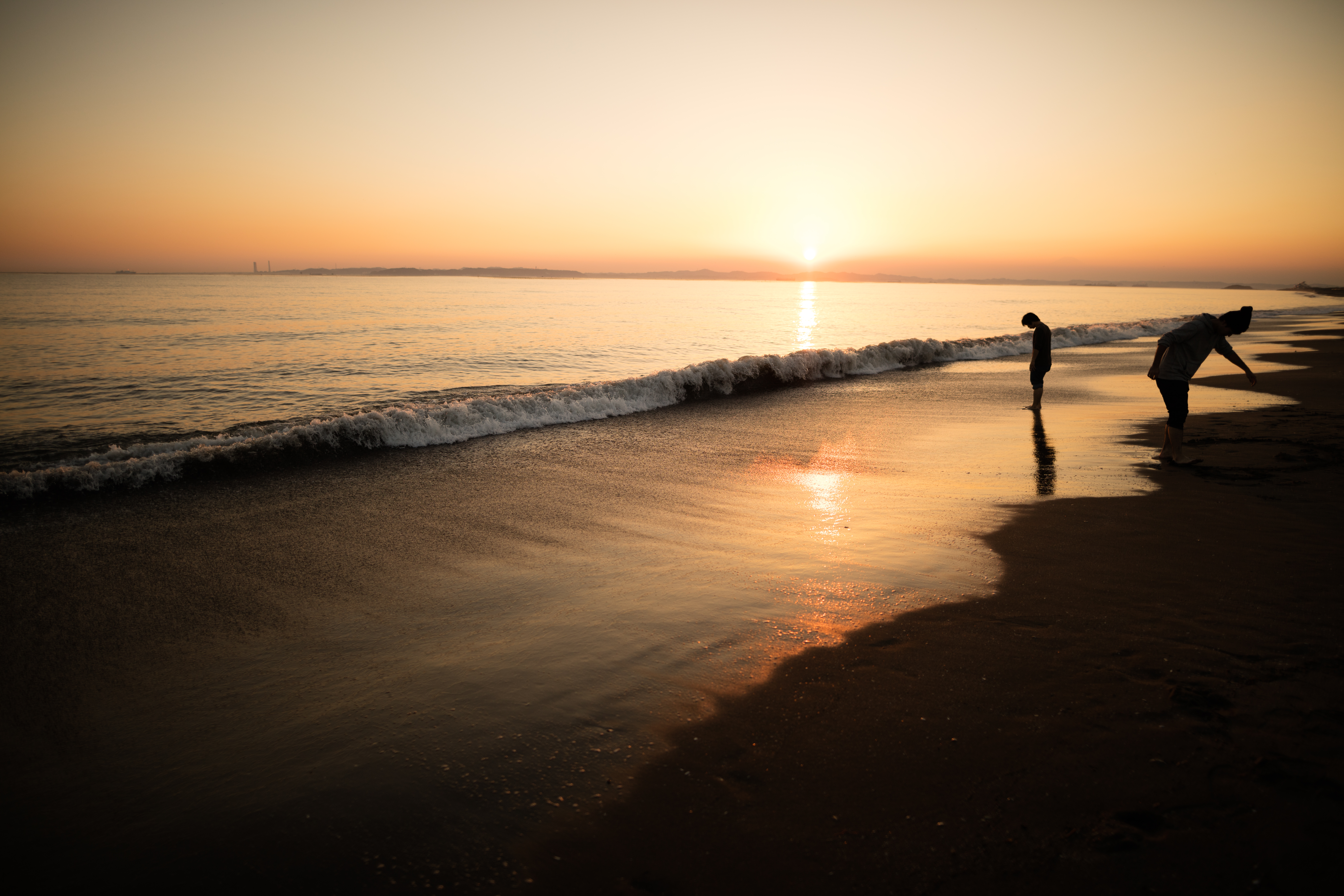 空が朱に染まり、海が仄かに青みを残すほんの僅かな時間。これをマジックアワーとはよく言ったものだ。ピントは中心付近の波の頭に合わせているが、この光量でも絞り開放ならISO100で1/1600秒が切れる。そのおかげで波は立ち上がり、細かな飛沫の一つ一つまで完全に捉えている。夏の喧噪が去り、浜辺からは人影が消える季節だが、格好の被写体がいてくれたのは助かった。脇役とは言え、彼らがいるのと、いないのとでは大違いだ。