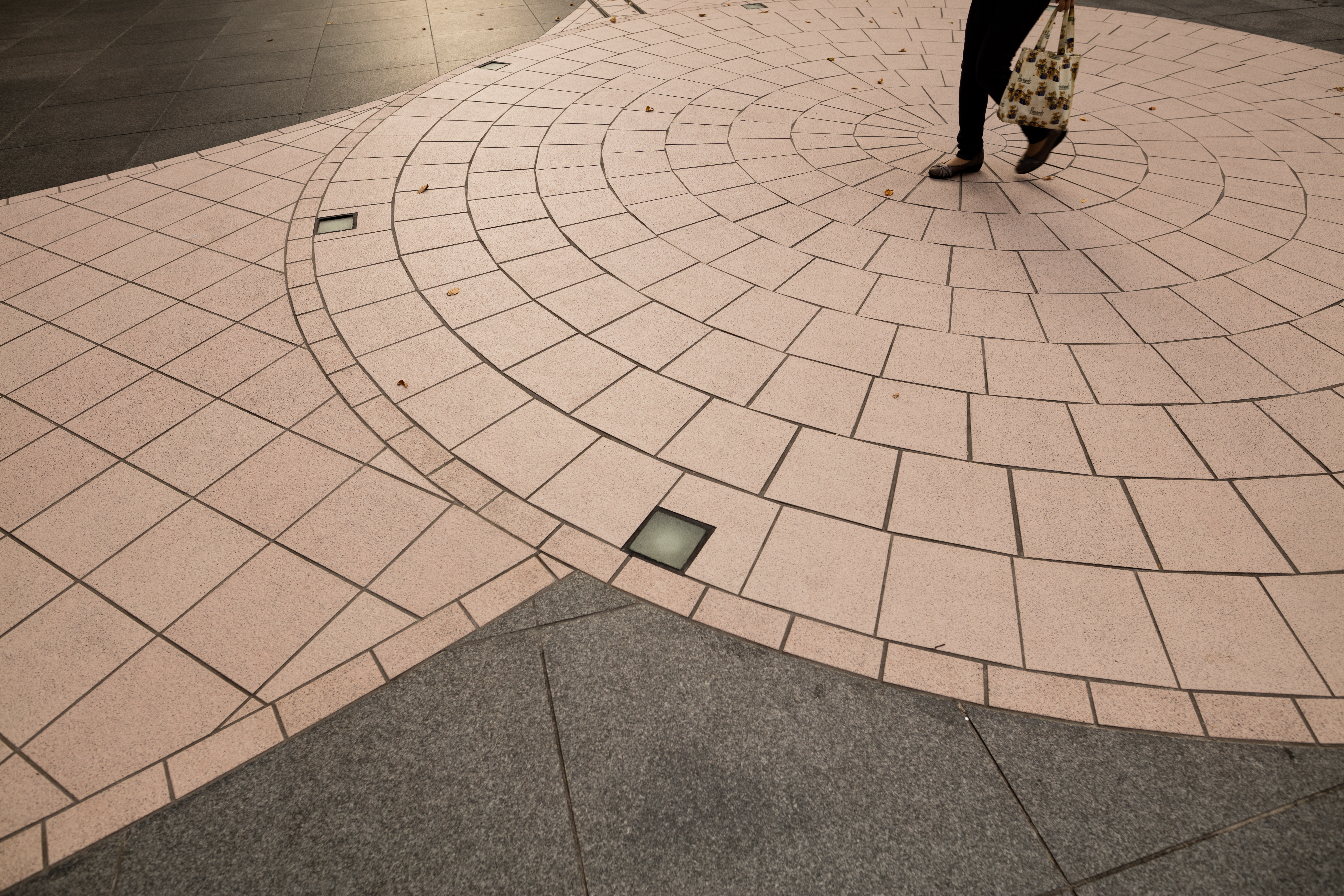 「もっと近寄れ」と、自分の中にいるもう一人の自分が言う。超広角ならではのパースペクティブを活かした絵をつくるためには、もう一歩、いや、もう二歩、三歩の勇気が必要。そうやって近寄っていった時の「光景への没入感」は、標準レンズや望遠レンズとはまた違ったリアリティを生み出す。ファインダーを覗きながらアングルを調整し、あとは円形になっているタイルの中心を人が歩いてくれるように念じた。大抵のことは、念じれば叶う。