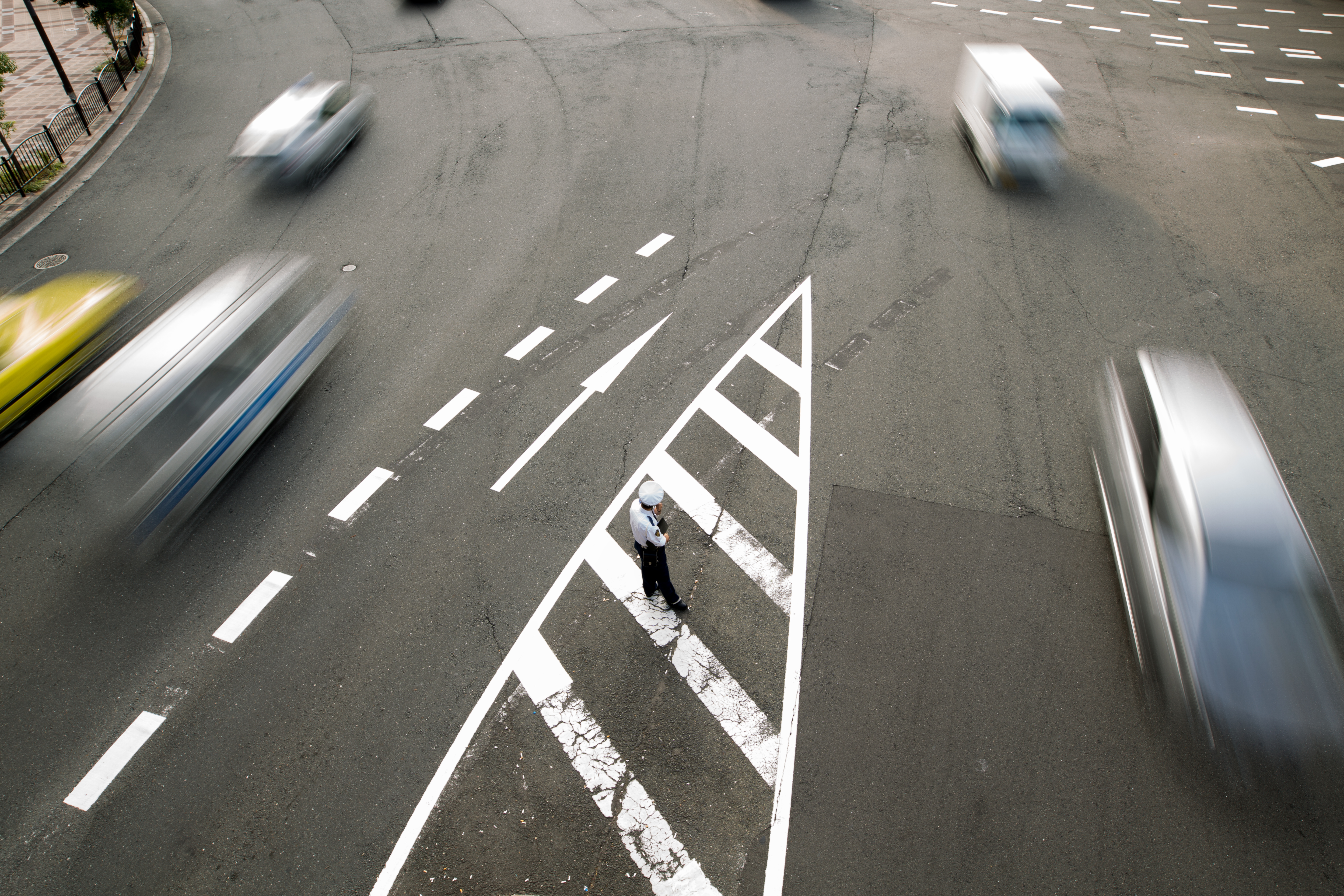 歩道橋からの光景。歩道橋を渡る時、必ず下を覗いてみることにしている。基本的にはどうってことない場所にあるのが歩道橋だが、上から見たらまったく想像外の景色が広がっていたりして、驚くこともある。せっかくの明るいレンズだが、めまぐるしく動く都市の雰囲気を表現するため、ここでは逆に目いっぱい絞り込んで、1/4秒のスローシャッター。1/8000秒のような超高速シャッターに慣れてしまうと、わずか1/4秒のブラックアウトが果てしなく長く感じる。