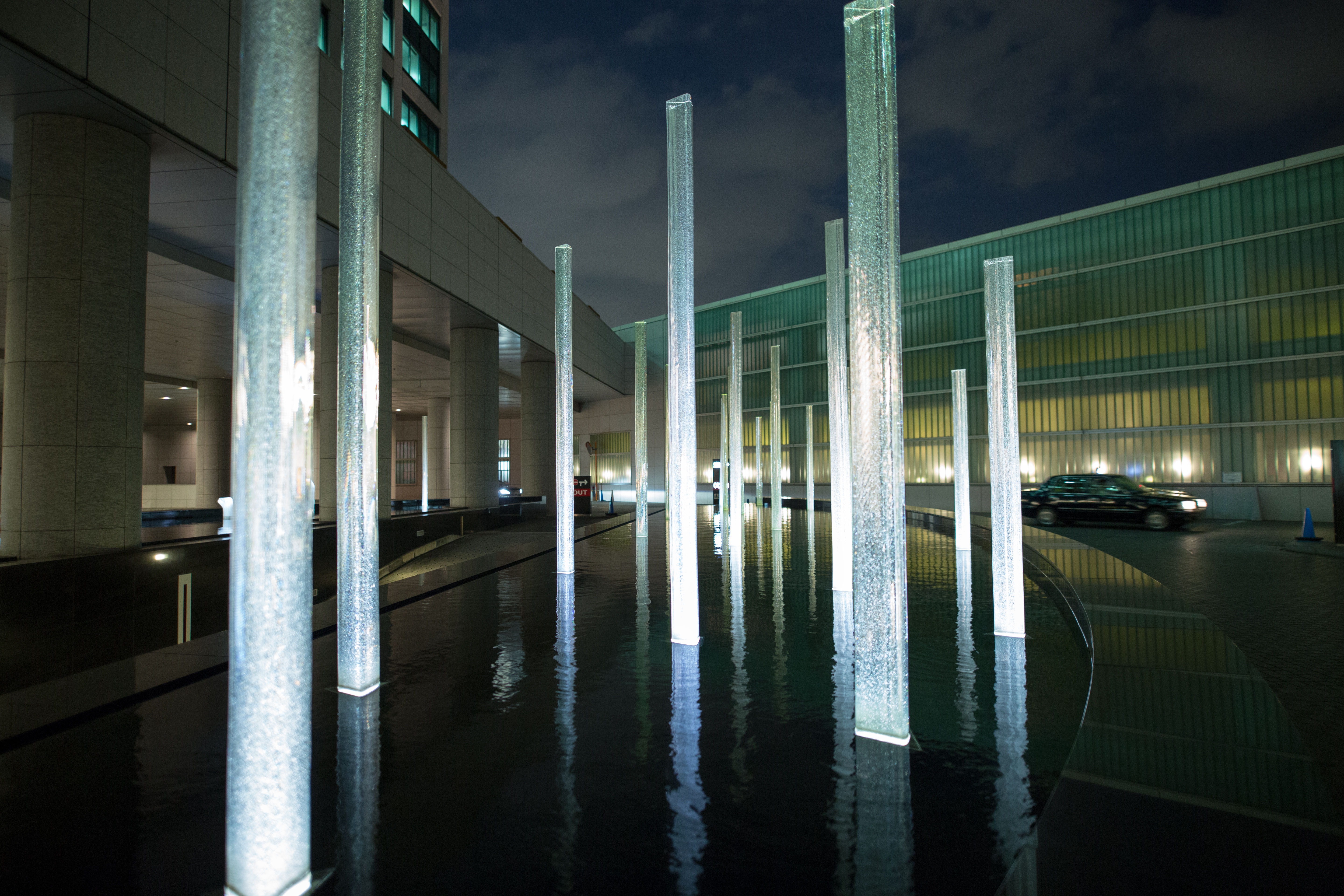 水の中から天に向かってまっすぐ突き出る光の柱。絞り開放、ピントは真ん中の柱に合わせている。手持ちで背景まできっちり写し込むにはISO感度を上げざるを得なかったが、やはりここでもレンズの明るさに助けられたのは間違いない。上下左右に加えて奥行きの表現がこのように出来るのは、いかにボケの量が大きいF1.4とは言え、このぐらい離れれば背景はじゅうぶんにシャープな像を結んでくれるからに他ならない。さらには、水面の暗さから、空に浮かぶ雲、建物の明かり、そして輝く柱に至るまでの一連のグラデーションを見ても、このレンズの素性を窺い知ることが出来る。