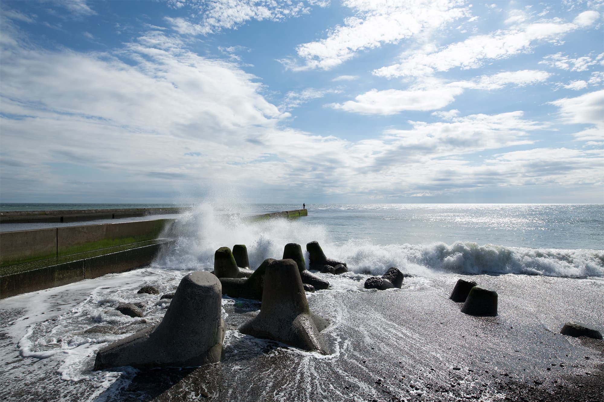 うららかな日ではあったが台風の影響で風が強い。長く突き出た堤防の先端で誰かが釣りをしている。時折、大きな波がやって来るが怖くないのだろうか?と心配しつつ、波が打ち付ける瞬間を狙ってシャッターを切った。砕ける波を原寸イメージで観察していたら、ふと富嶽三十六景の中でも特に有名な「神奈川沖浪裏」が頭に浮かんだ。あの絵に描かれた波頭のカタチとまったく同じなのだ。「波ってあんなカタチしてないよな」とずっと思っていたのだが、あんなカタチをしていたのだ。北斎恐るべし。