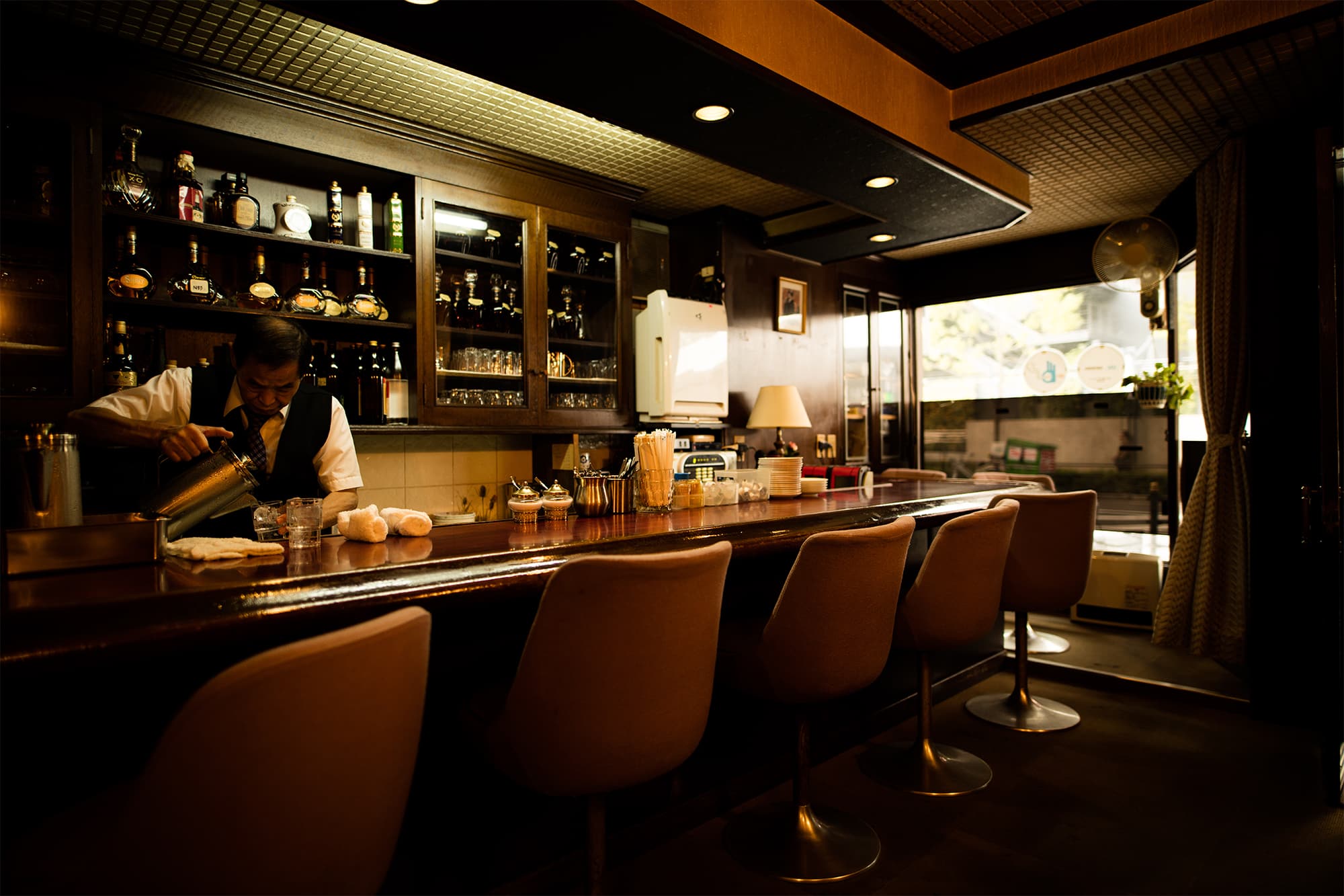 久しぶりにその街を訪ねて、あまりの変貌ぶりに驚く。すべてが整理され、作り替えられ、洗練されていく。昔の面影はまったく無い。その中で、まるでそこだけ取り残されたようにして在った古い喫茶店。夜はお酒も出すようだが、話を聞くと、朝から夜遅くまでお年を召したマスターが一人で切り盛りするのは大変な苦労があるようだ。そのマスターが何十年もかけて守ってきた空間。その「空気の蓄積」のようなものが、20mmなら写ると信じてシャッターを切る。「おしぼりだってな、ウチのはそのへんの安もんとはちゃいまっせ。分厚いやろ。ええ匂いもつけてるしな」。はい、確かに。