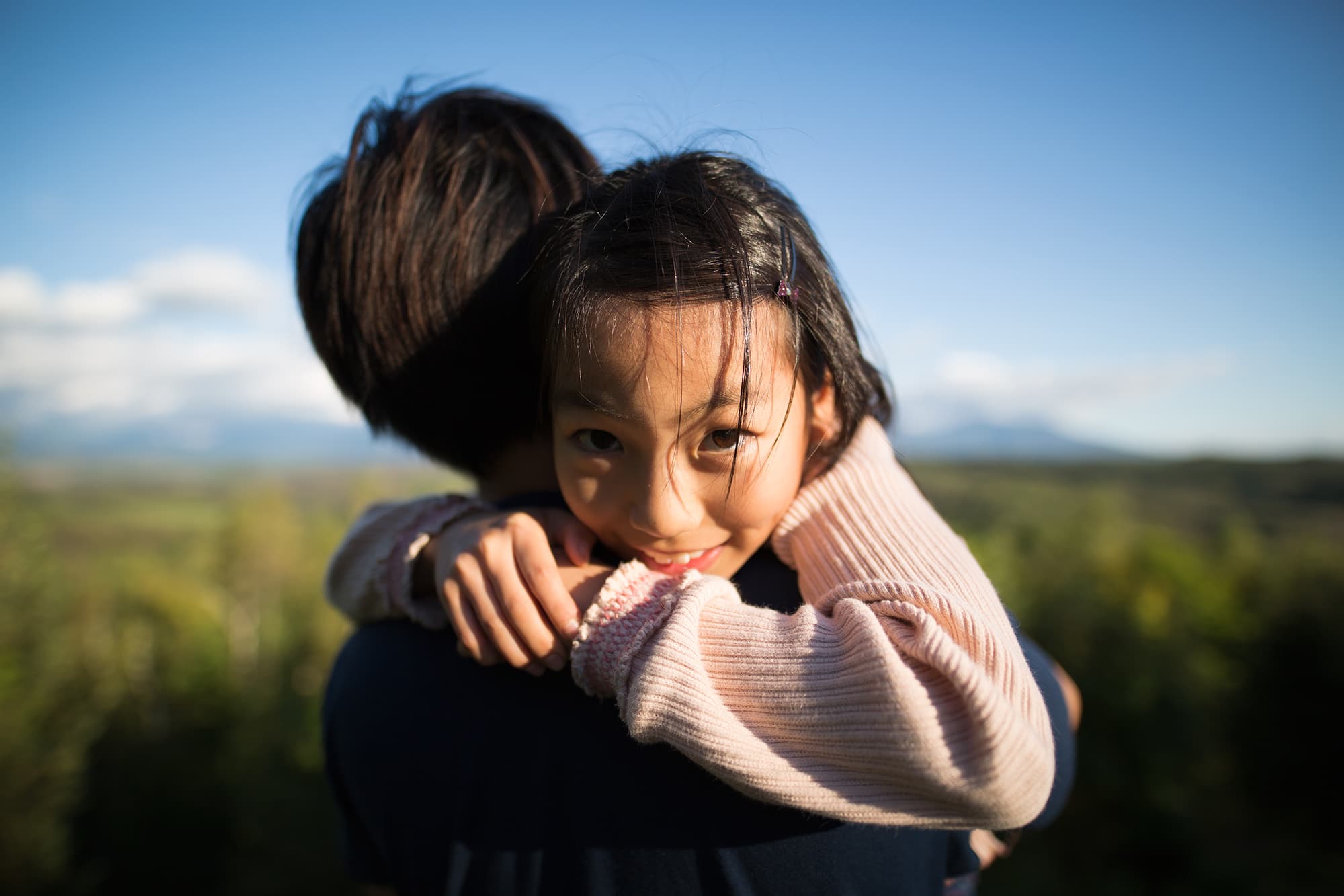 北の大地の、果てしなく続く森を見下ろす高台の家で、その家族は暮らしていた。広大な景色の中へずーっとクローズアップして、最後には十数センチまで近づいて、とうとう捕まえた2つの目。撮りたかったのはこの眼差しなんだ。近接の撮影でも、20mmという焦点距離とF1.4の被写界深度は、それでしか撮れない絵を約束してくれる。彼女は小学校2年生。お父さんの首に抱きつく姿はまだまだ子供だけど、レンズを真正面からバチッと見据えるその目はなぜか大人びて見え、ファインダーを覗きながら少しうろたえた。