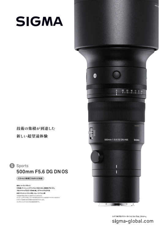 SIGMA 500mm F5.6 DG DN OS | Sportsは、500mmの超望遠と高い描写力を、驚くほど小型軽量なボディに凝縮したミラーレス専用超望遠単焦点レンズです。加工難度の高い大口径の特殊低分散ガラスを複数枚採用することで、回折光学素子を使用することなくレンズ構成の大幅なコンパクト化に成功。同時に、500mm単焦点レンズへの期待に応える高い解像力も実現しました。高精度なエンジニアリングプラスチックパーツを中心に構成されたレンズボディは、小型ながらも優れたビルドクオリティと防塵防滴構造※など高い耐候性を備えています。豊かな描写力と、焦点距離からは信じられないほどのコンパクトさを持つハンディサイズの500mmが、野生動物から飛行機、鉄道といったあらゆるシチュエーションにおいて全く新しい撮影体験を提供します。
