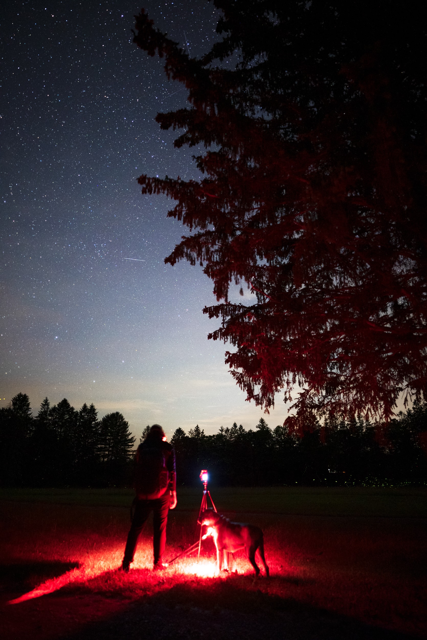 私はKonaの写真を何枚か撮影すると、数日に及んだ冒険の旅の記念として、天の川が絶好の位置まで移動するのを待ちました。Konaは赤色灯ヘッドランプを付けていたため、F1.4でレンズを使用しながら簡単に焦点を合わせ、さらにミラーレスカメラのライブビューを利用することができました。またこの長い露出時間の間、動かずに待っていることを学んだKonaの賢さにも驚かされました。今回の撮影では、Konaではなく、私が動いて台無しにしてしまった写真の方が多いに違いありません。