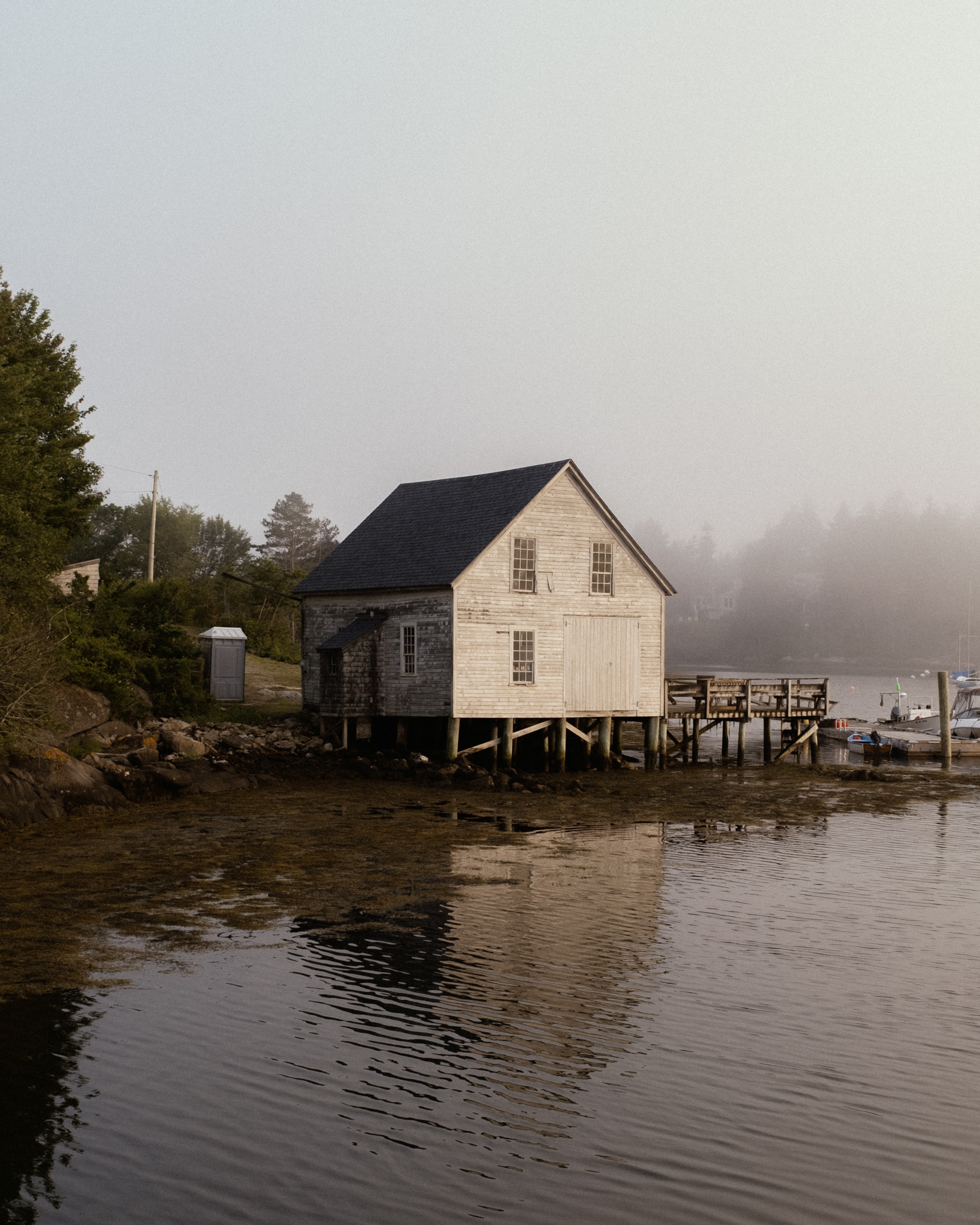 翌朝、私はサウスポートランドのフィッシャーマンズ・ポイントに車を走らせ、この3つの古い漁師小屋を撮影しました。漁師小屋には、毎年撮影しても飽き足らない何かがあると感じています。それはきっと、素朴な風貌と、海風にさらされた木造の小屋が見せる質感のせいでしょう。
