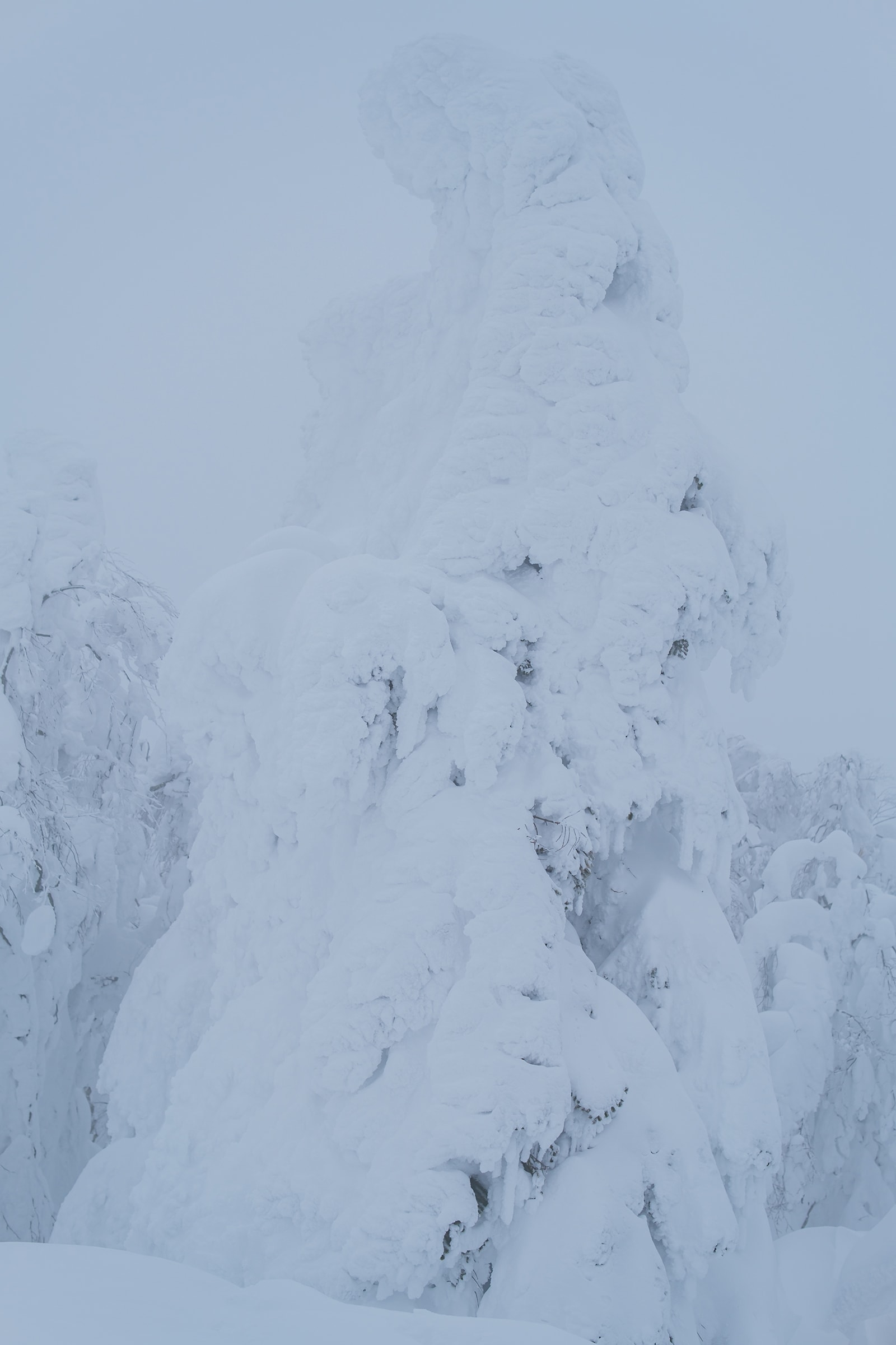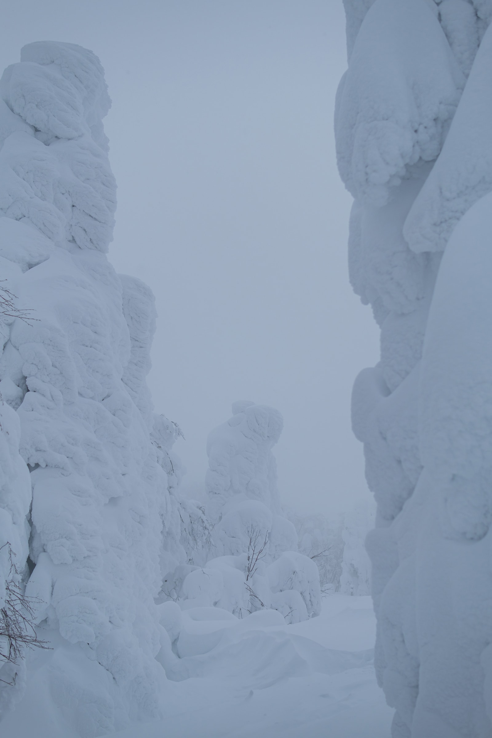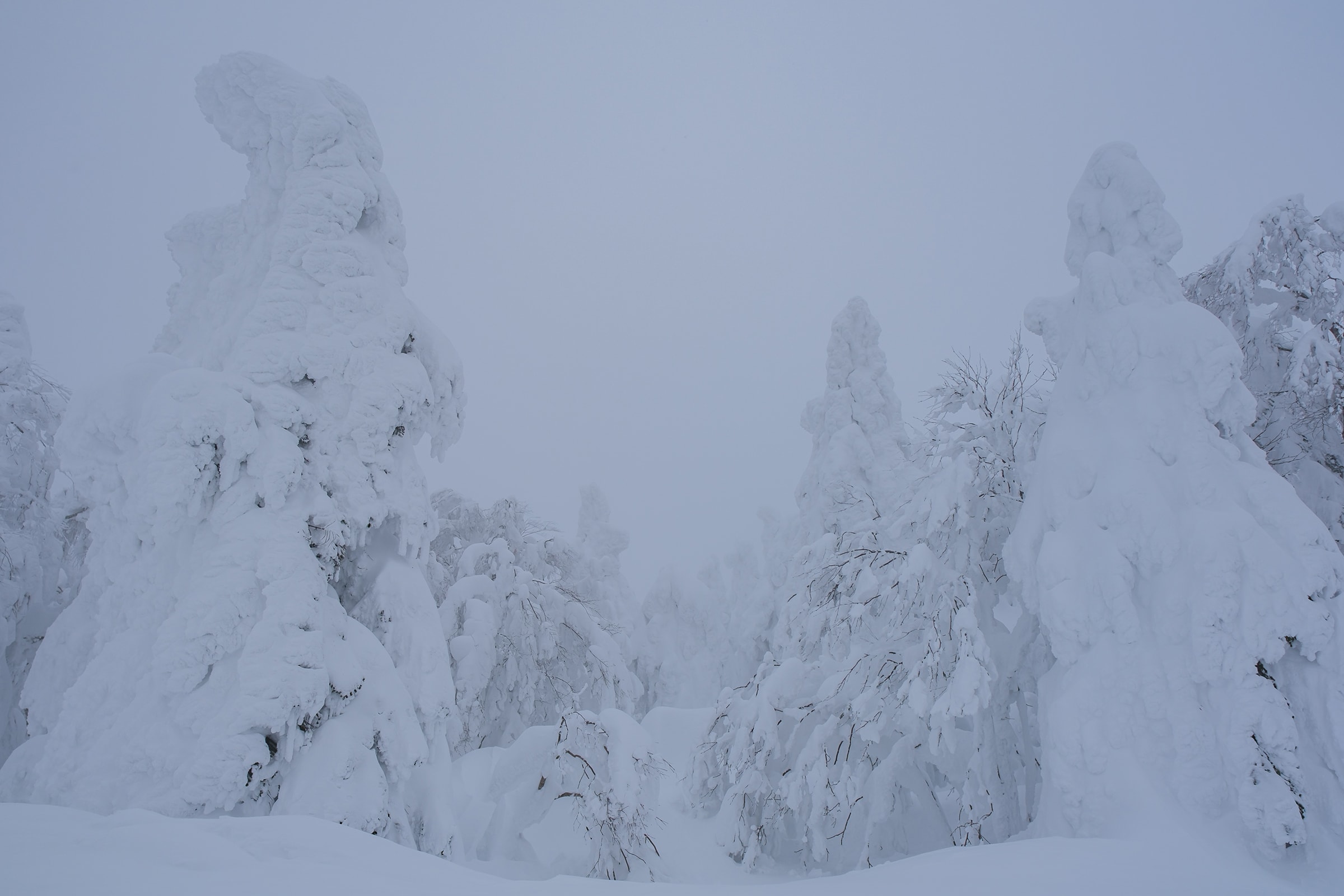 蔵王山では冬の間、シベリアから吹く氷のように冷たい風が、木々を非現実的なおかしな形のモンスターに変身させます。この現象は気候変動とともに消え去ってしまうかもしれませんが、この冬はこのモンスターにとって良い条件が整っており、ふわふわとした巨大な雪玉に覆われた巨人が立ち並ぶ、壮観な自然を撮影できました。