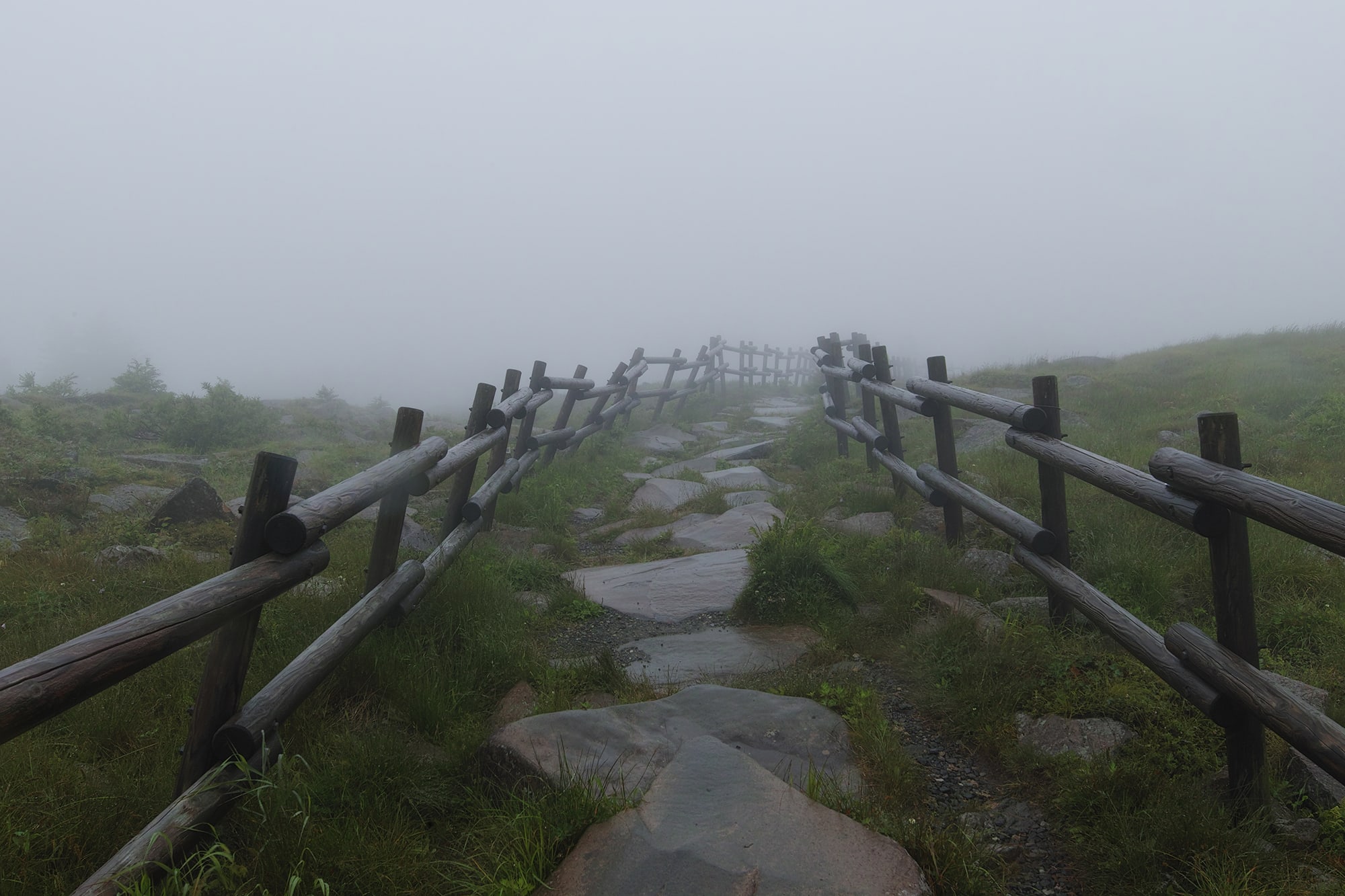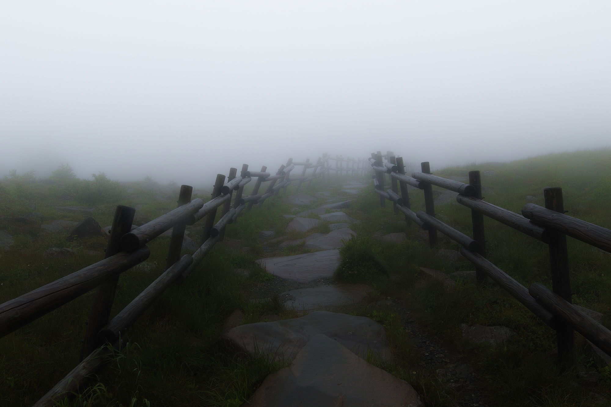 濃い霧の中に消えてゆく道。オリジナル画像のどこが気に入らないか。霧の白さを出す露出にしたので当然なのだが、細部までいろんなものが見え過ぎている。見せたいのは濃い霧と、そこに道がふっと消え行くさま、その結果としての荒涼とした雰囲気なのだが、他の要素に引きずられて主題としての存在感が希薄になり、結果的につまらない写真になっている。隅から隅まで全部見せる必要はまったくない。そこで脇役を減らすことで相対的に主役を引き立たせることにする。ここでもX3 Fill Lightの登場だ。スライドバーをマイナス方向へ。調子にのってどんどん下げる。それだけでは飽き足らず、シャドウも下げる。X3 Fill Lightを大きく下げたことにより、拡大してみると柵の消失点あたりでは柵の輪郭にやや不自然な線がつき始めているが、気にならなければ良しとしよう。最後にハイライトを上げて石の表面の反射を強調。下半分を暗くしたため、この処理がポイントとなる。