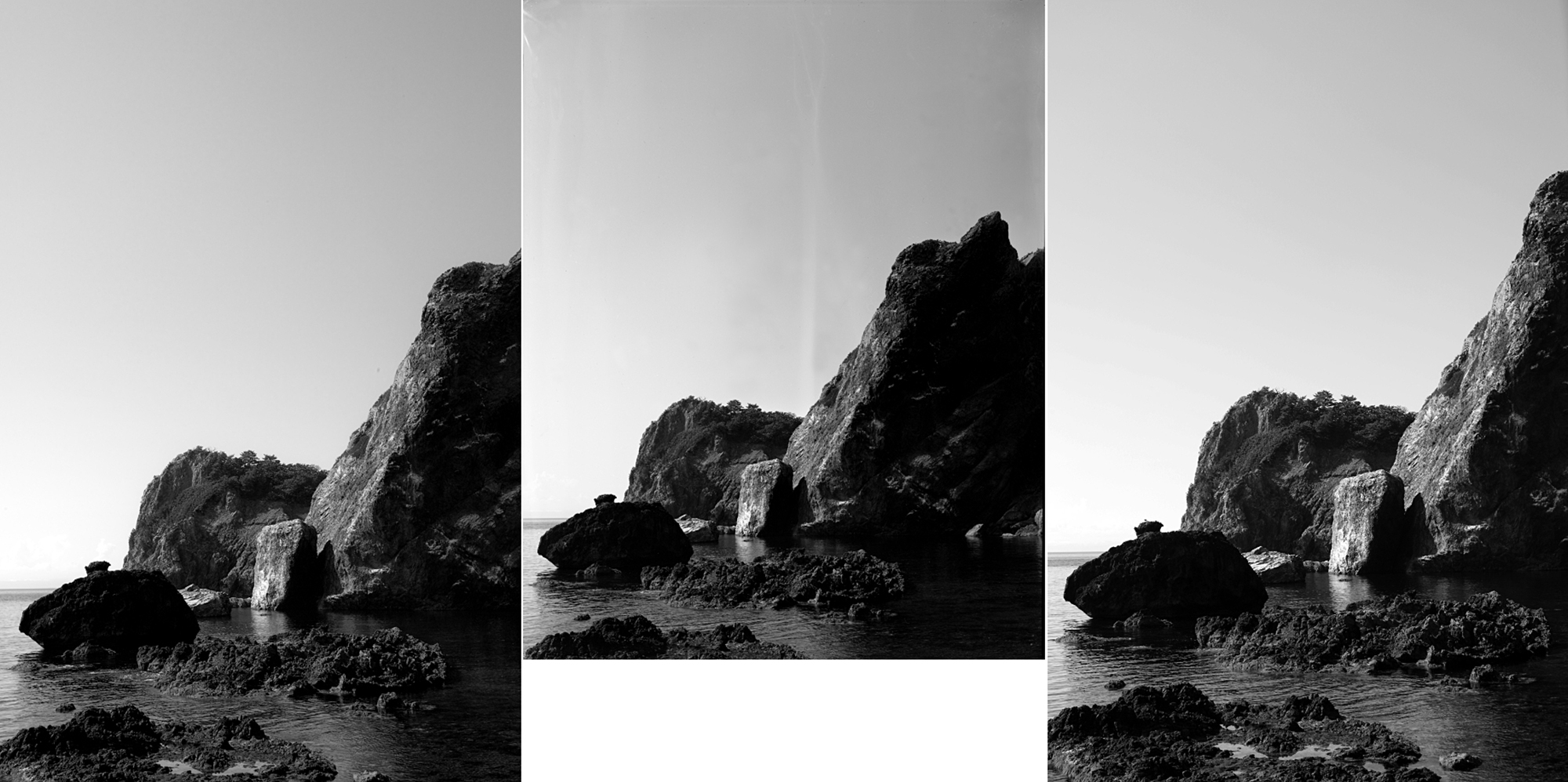 ここで話は元に戻る。そんな大判カメラに匹敵するクオリティの写真が手持ちで簡単に撮れてしまうのがシグマのカメラだと、私は常々感じていた。であれば実際に大判カメラの写りと比較してみるのも、単なる下世話な興味を超えて、多少なりとも意味のあることではなかろうか? というのが今回の目論見である。ここに同じ被写体を写した3点のカットがある。左からsd Quattroで写したもの、8×10の大判カメラで写したもの、そして最後に、同じデジタルカメラの比較対象として5000万画素を誇る一眼レフカメラで写したものである。そもそもそれぞれの成り立ちが全く違い、本来であれば比較するようなものではないのだが、Foveonセンサーがつくり出す画がバイテンのもつ圧倒的な説得力に肉薄すると感じているわけで、それが本当にそうなのか、そして、主流である方式の同じデジタルカメラと比べてどこに魅力があるのか、そのことを紐解きたかったのである。画面構成上、大変見づらい内容となり申し訳ないが、まず各カットを並べて見てみよう。