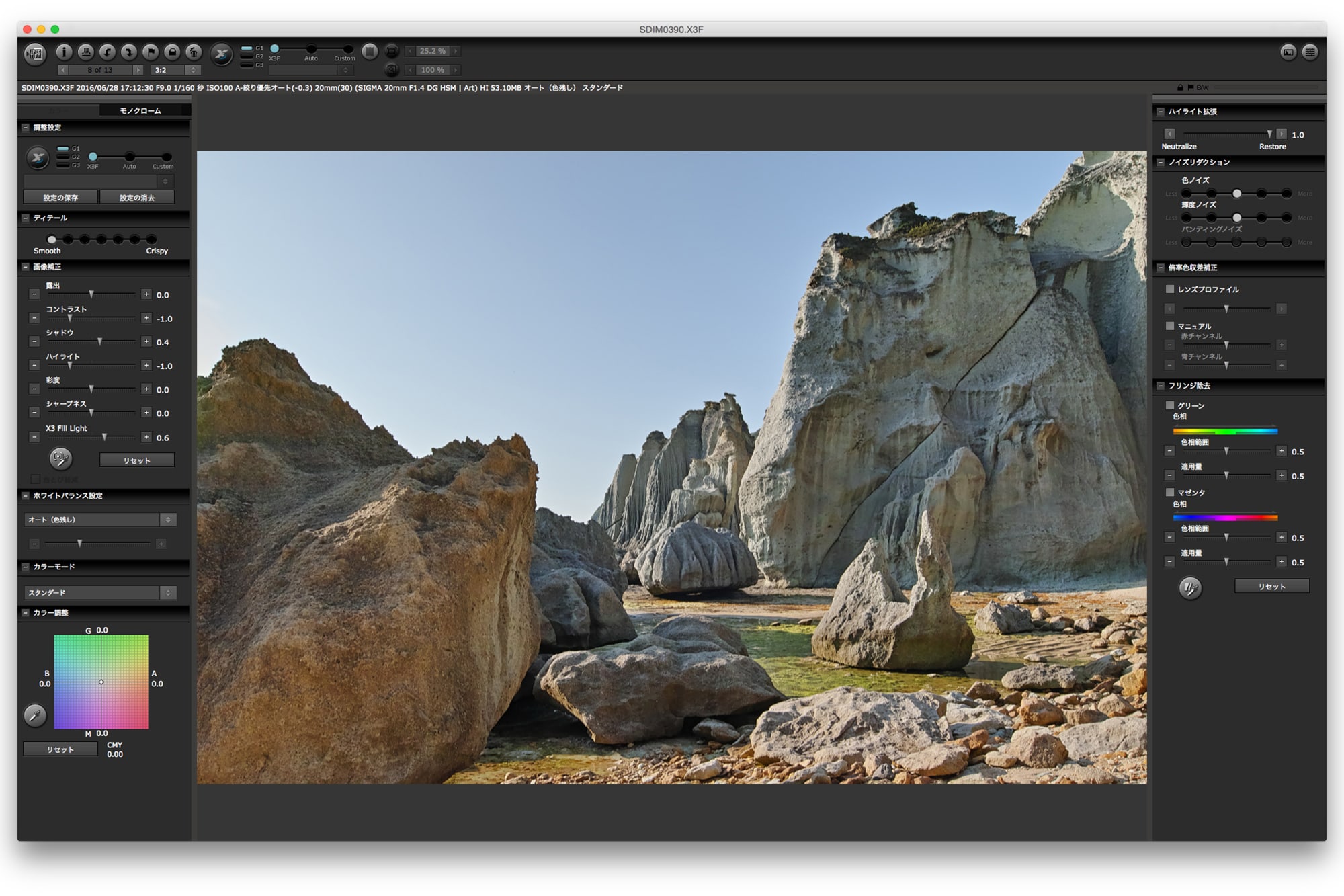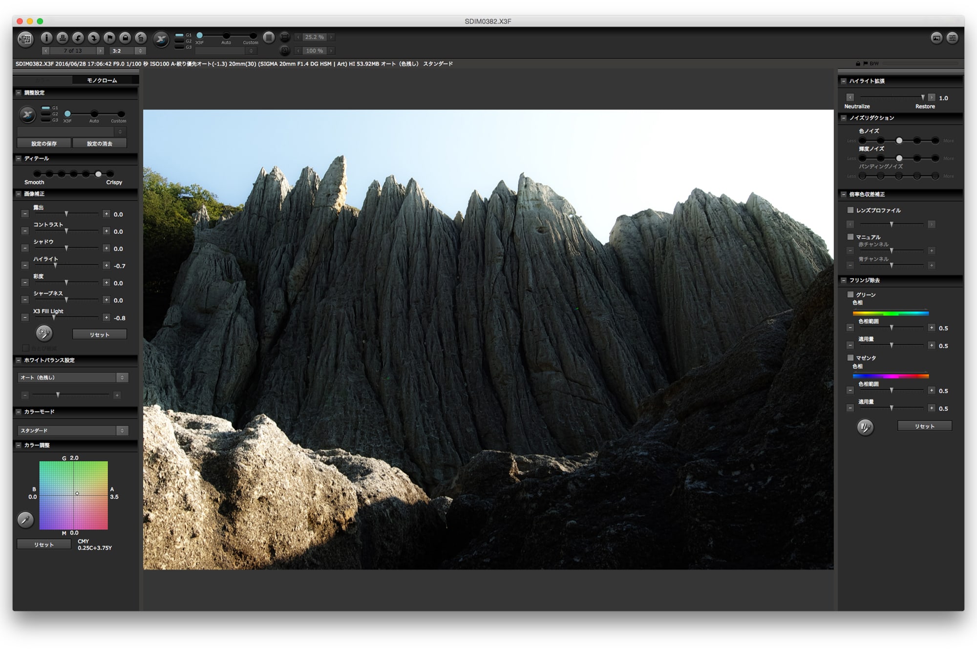 奇怪なカタチをした巨岩を、真下から捉えた。そそり立つ不気味さを表現したい。イメージは交響詩「禿山の一夜」だ。まずシャドウを落とすことを考えるが、ここではX3 Fill Lightを下げることで対応した。岩肌のディテール、特に右手前にある岩のそれが残る程度に抑えたが、もちろんこのあたりは好みだ。もっと思い切り落としても面白いかもしれない。X3 Fill Lightはなかなか使えるファンクションで、「シャドウ部の明るさを調整するもの」と考えればいい。ハイライトを少し下げているのは、画面右上のハイエスト部分の出力を考えてのもの。SPPの新機能である「ディテール」だが、このカットではCrispy側に振って固めの印象に仕上げているものの、他のカットではSmooth側に振ることが多かった。これは私の個人的な好みによるところが大きい。