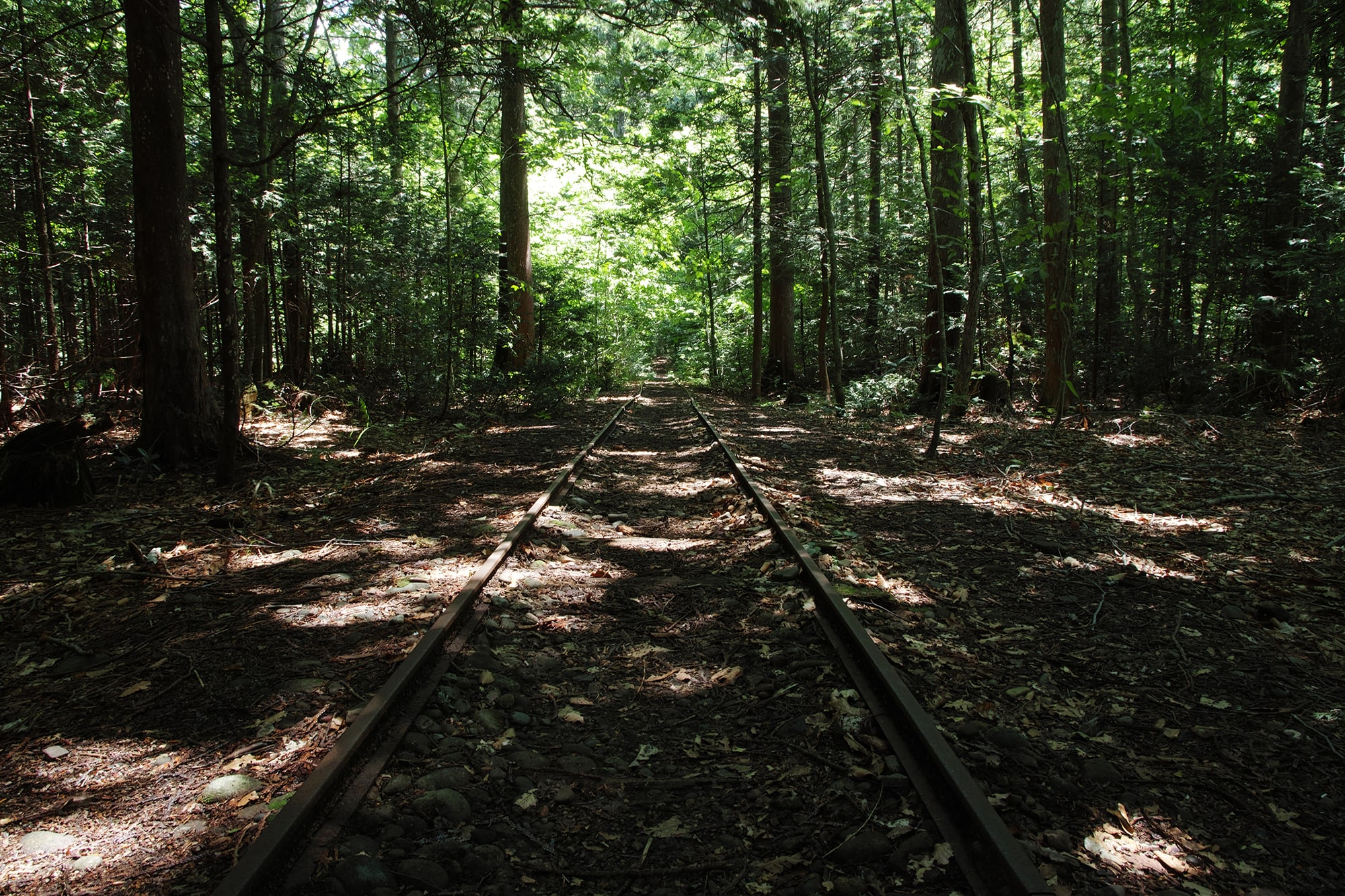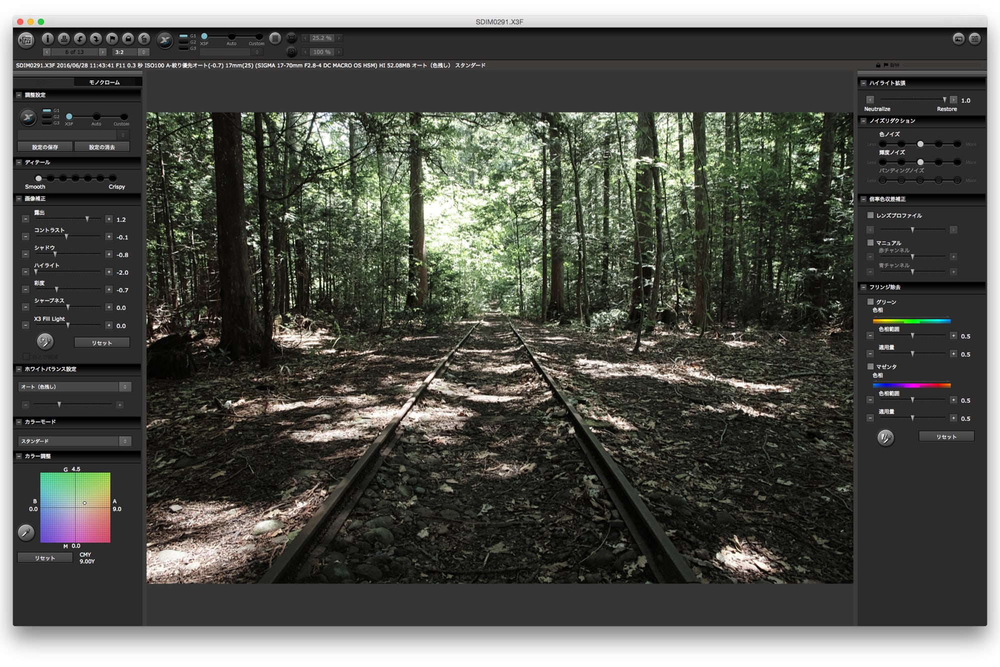 森の中に残る鉄道の遺構。薄暗い中に、スポットライトのように木漏れ日が差し込む。正面遠景にも日差しのハイライトあり。つまり、大きな明暗差が画面全体に点在する、難しいシチュエーションだ。悩んだ時にやるのがSPPのご意向を聞くやり方。「Auto」モードでいったんの設定を出し、そこから足し算、引き算でイメージに近づける。露出とハイライトの設定はAutoモードの名残り。それでもコントラストのキツさ、画面全体に漂う詰まり感が気になり、ここでは彩度を大きめに下げ、カラー調整もイエロー方向へ大きく振ってグリーンの濃さを緩和させると同時に、絵画的な味付けをしてみた。