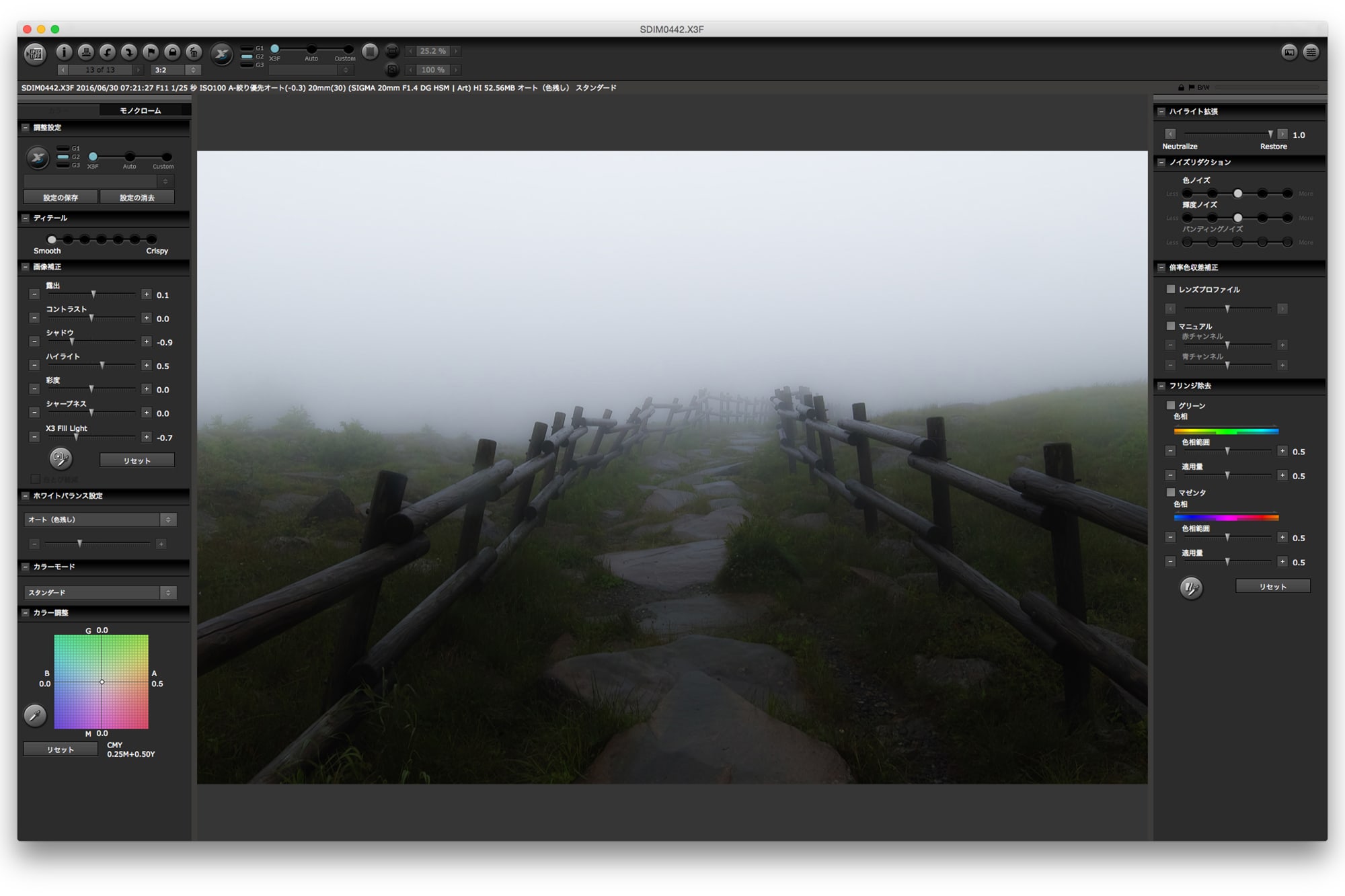 デジタル写真が持つ最大のアドバンテージが画像の加工だが、最終的な結果を明確にイメージし、それが最大限に実現されるように撮影することが大事なのは言うまでもない。「後でどうにでもならあな」という姿勢で撮られた写真がモノになることなど、まず無いと信じている。撮影の時点で、もうあらかた決まっているのだ。しかしそうは言っても、それを完成させるためには撮影後の画像処理が不可欠だし、気まぐれに何かのパラメータを動かしてみたら、自分のイメージとは違うにも関わらず、「お、なんかいいかも…」となることだって、実際にはよくある。SIGMA Photo Pro(以下「SPP」)という現像ソフトウエアは、シグマのRAWデータであるX3ファイル専用設計だけあってなかなか奥が深い。実際の現場ではPhotoshop等の画像編集ソフトを併用することが多いのだろうが、ここではSPPだけでどこまでのことが出来るのか、SSPの各設定パラメータとともに、オリジナル画像と最終的な画像を見比べてもらうことでSPPのポテンシャルが伝えられればと思う。