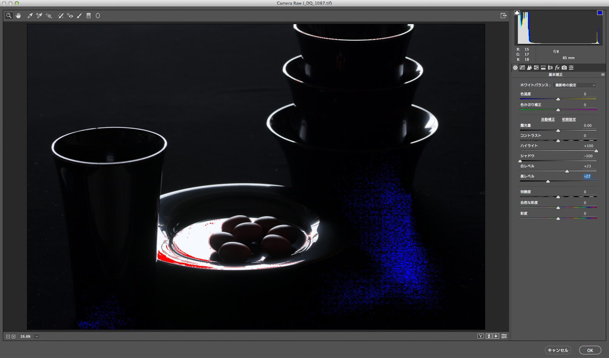 撮影したSFDのデータがどのようなダイナミックレンジを持っているかを確認するためにPhotoshopのCamera Rawフィルターを使用してみた。ハイライト、シャドウともにとても広いことが分かる。