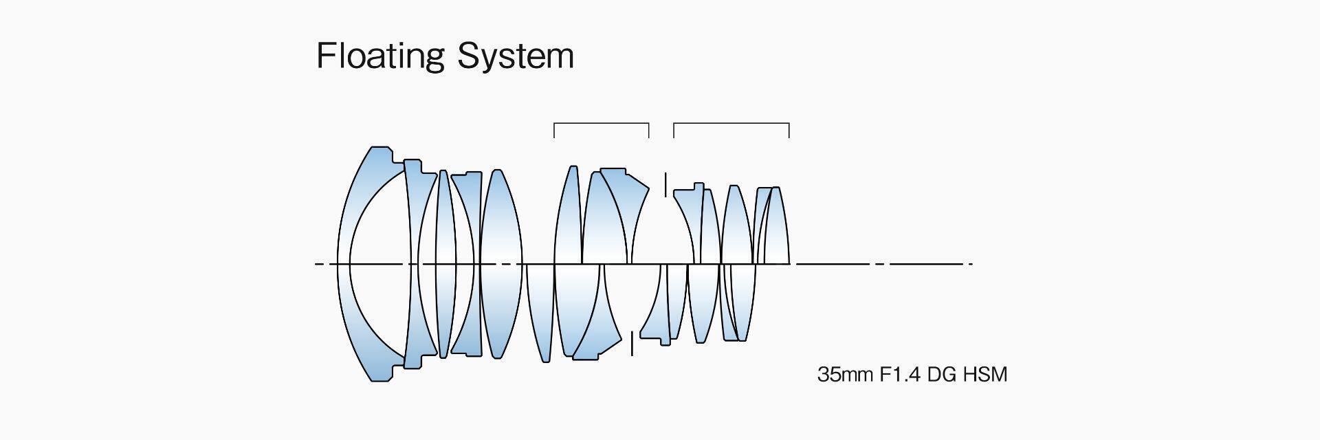 光学系内部のいくつかのレンズ群を、それぞれ異なる繰出し量でフォーカシングするのがフローティングシステムです。これにより撮影距離の変化による収差変動や、繰出し量を少なくすることができ、撮影距離の変化が大きいマクロレンズ、レンズ構成が非対称な一眼レフ用広角レンズにおいて特に効果を発揮します。 -