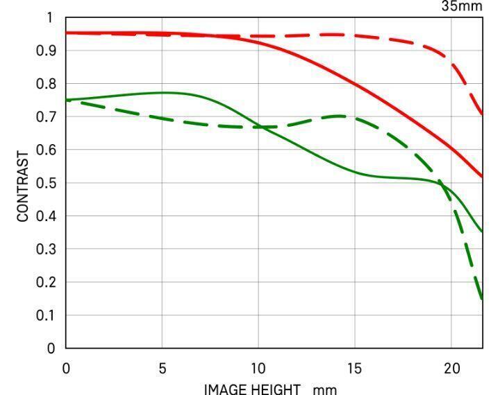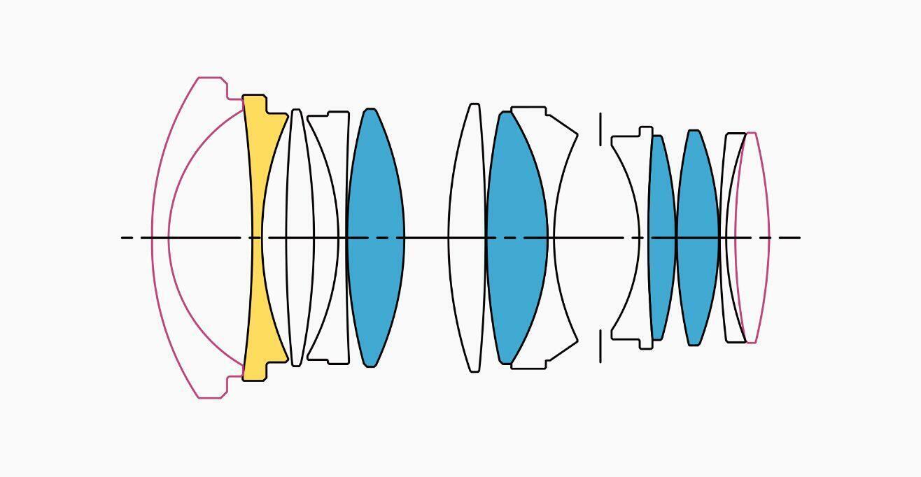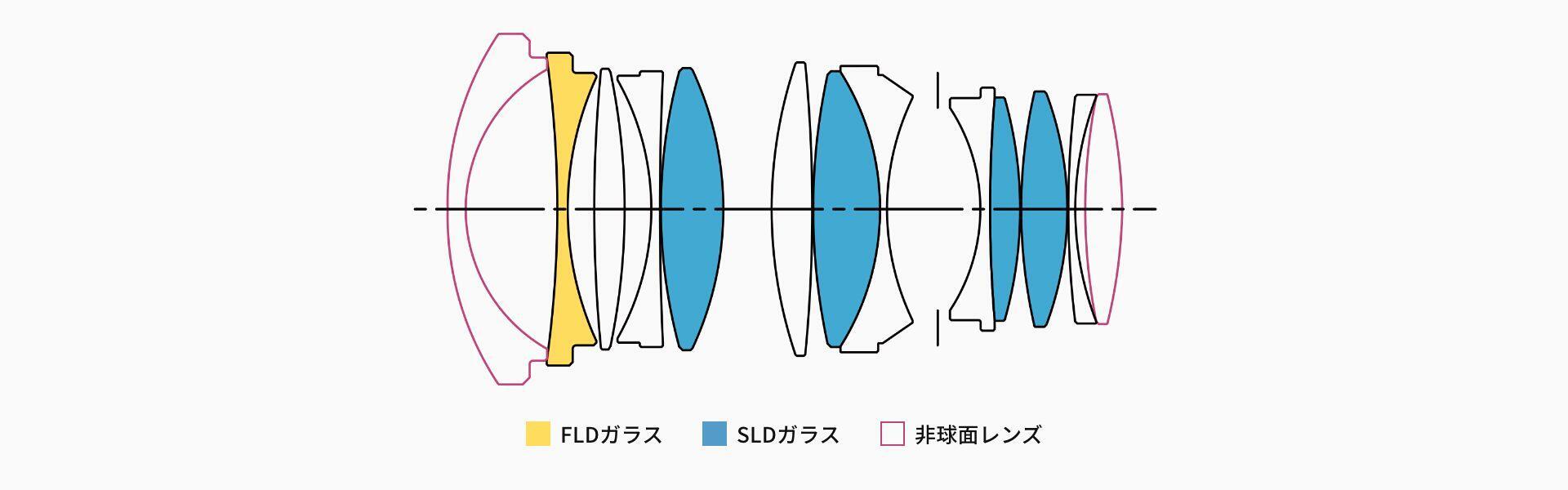レンズの描写に影響を与える収差のなかでも、高い描写性能の実現に欠かせない要素のひとつが色収差の補正です。色収差には、軸上色収差と倍率色収差があり、倍率色収差は画像処理で補正することができますが、軸上色収差は画像処理での補正が困難です。本レンズでは、蛍石と同等の性質を持つFLD(“F” Low Dispersion)ガラスと、SLD(Special Low Dispersion:特殊低分散)ガラスを採用し、レンズのパワー配置の最適化を行うことで、倍率色収差と同時に、ピントが合った位置からその前後のフォーカス位置におよぶ軸上色収差をも十分に補正しました。また、非球面レンズを適切に配置することにより、非点収差と像面湾曲の補正を実現。画面周辺まで解像力の高い描写を実現しています。