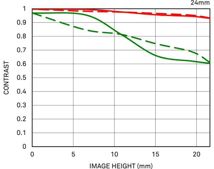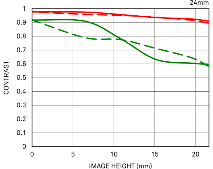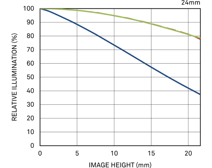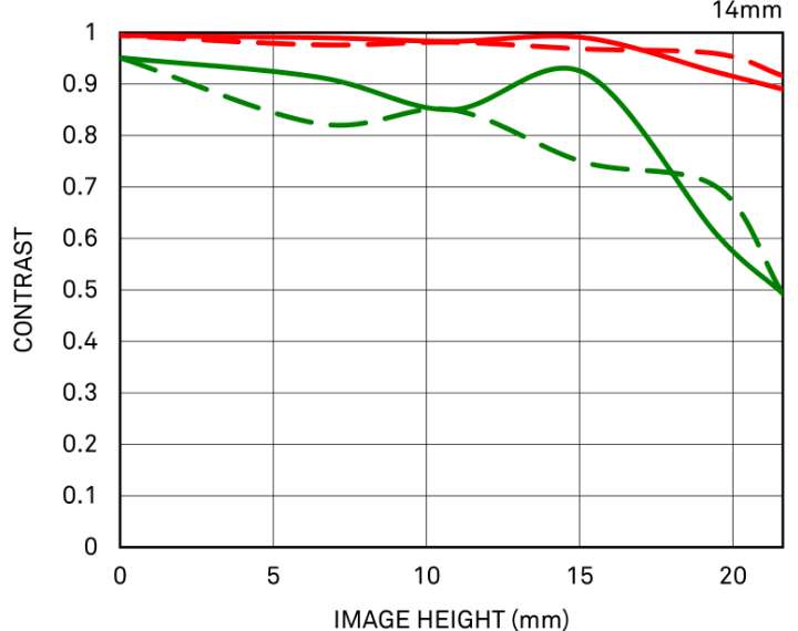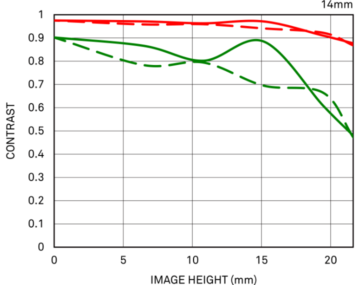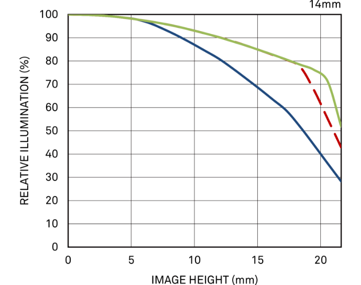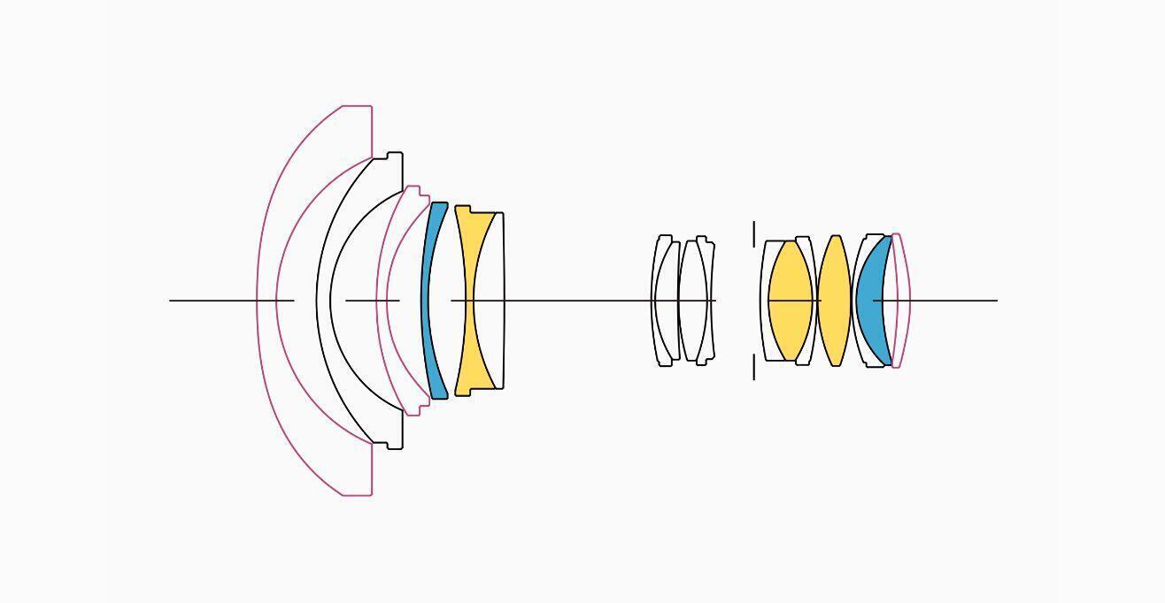 5000万画素を超える高画素機での使用を前提に、ズーム全域で周辺まで高い性能を実現するため、FLDガラス3枚、SLDガラス3枚に加え、大口径非球面レンズをはじめとした非球面レンズを3枚使用。高屈折率ガラスの効果的な配置により、FLDガラス、SLDガラスの補正効果をさらに高め、倍率色収差などの諸収差を良好に抑えつつ、解像感の高い画質を実現しました。レンズ第一面の大口径非球面レンズなどレンズパワー配置の最適化により、歪曲収差は1%以下 ※ に。画面周辺部まで点が点として写る性能を維持しながら、豊富な周辺光量を確保しました。フレア・ゴーストについても設計時からシミュレーションを行い、超広角レンズとしては高いレベルで補正しています。