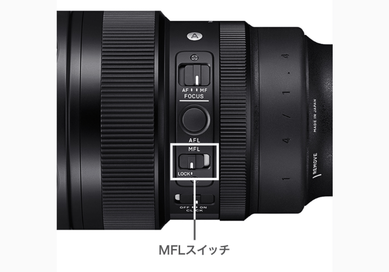 「LOCK」にするとフォーカスリング操作が無効となるスイッチ。フォーカスリングの意図しない操作によるピントずれを防ぎます。フォーカスを固定して撮影する長時間露光撮影などで役立ちます。