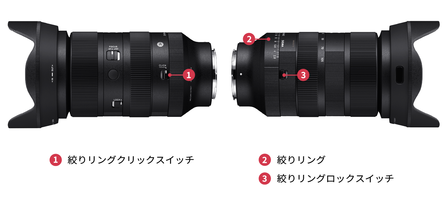 絞りリングを搭載。絞りリングクリックスイッチ、絞りリングロックスイッチも備えており、撮影用途に合わせた絞り操作が可能です。 -
