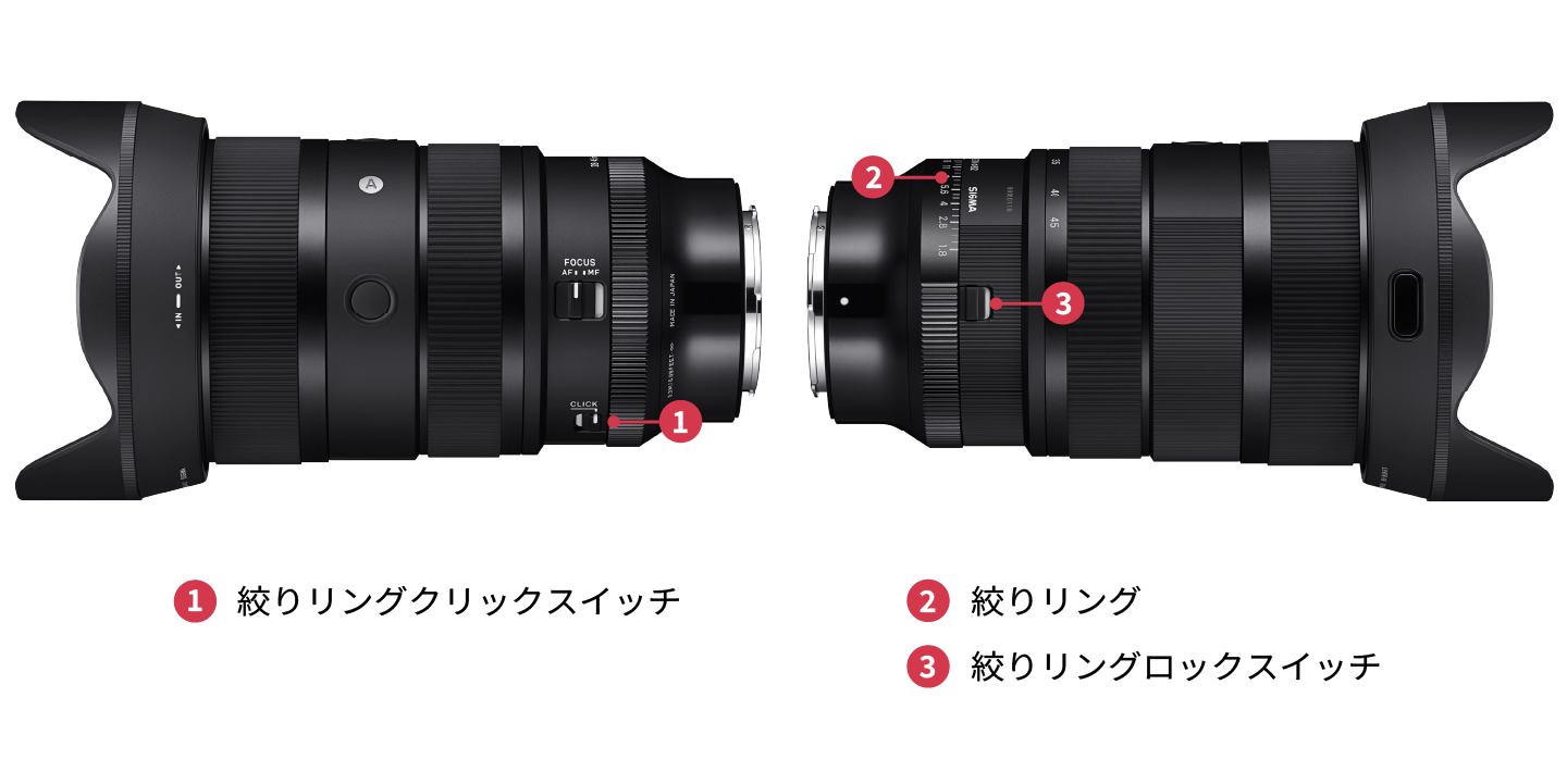 絞りリング搭載 絞りリングを搭載。絞りリングクリックスイッチ、絞りリングロックスイッチも備えており、撮影用途に合わせた絞り操作が可能です。