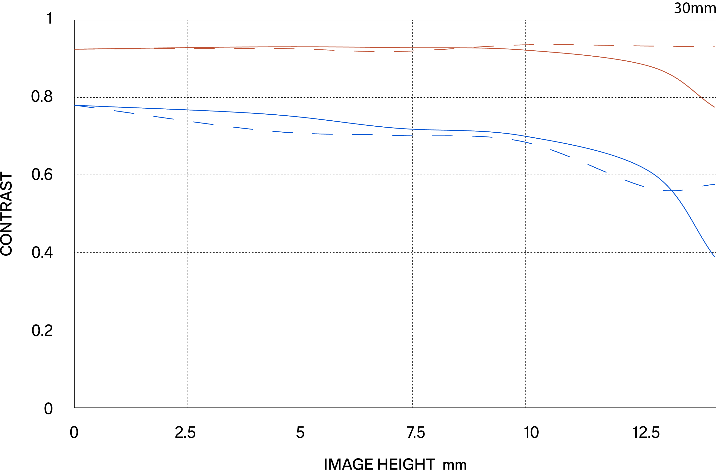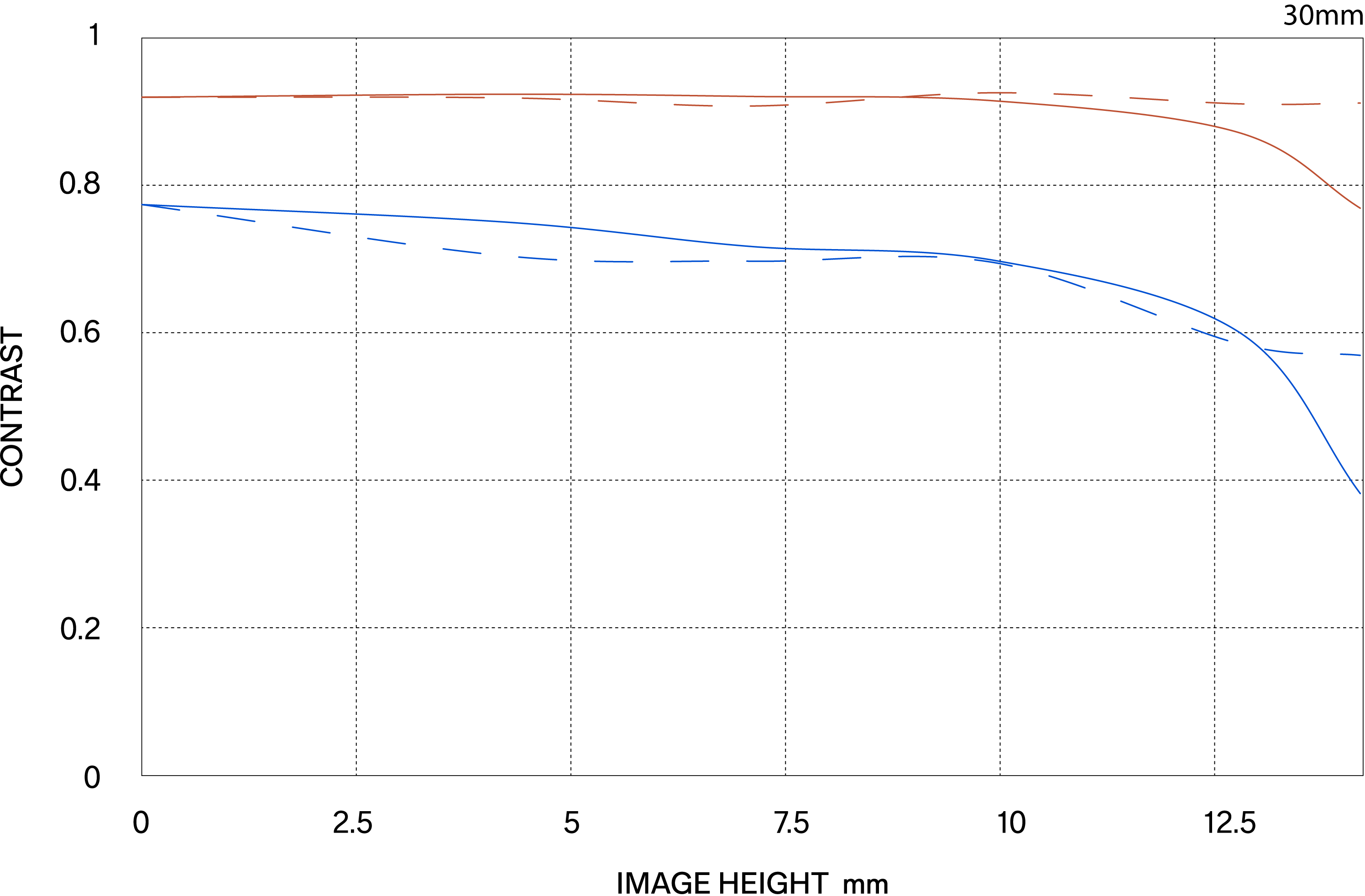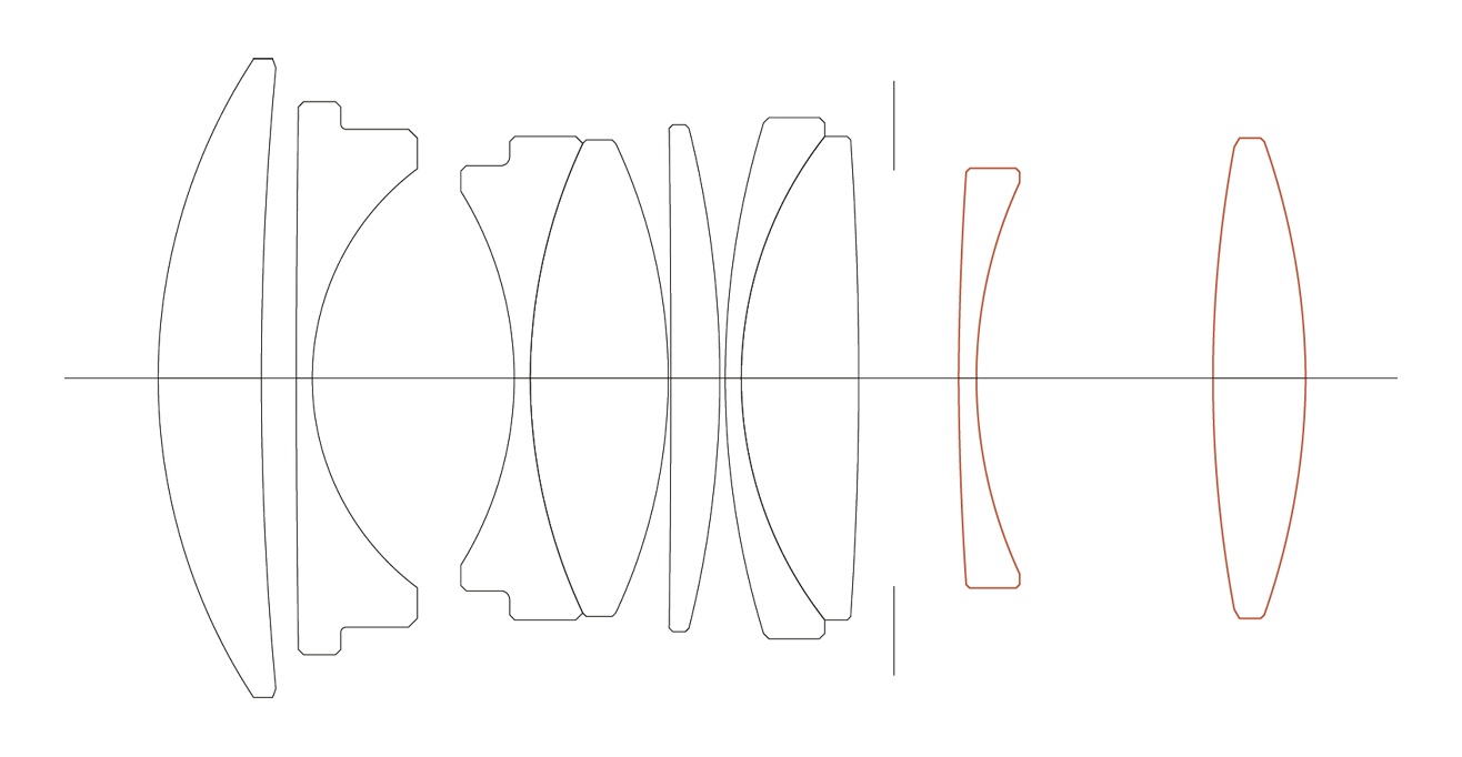 レンズ構成、パワー配置を考慮しながら、両面非球面を含む非球面レンズや異常部分分散性の高い高屈折率高分散ガラスなどを効果的に使用することで、周辺光量の低下を抑え、倍率色収差を補正。歪曲補正はミラーレスカメラの備わる画像補正機能 * を利用することで、光学系の持つ補正能力をシャープネスの向上に集中し、コンパクトな設計でありながらも、Artラインに匹敵する高画質を実現しました。