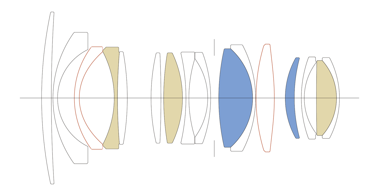 フルサイズ用大口径レンズ並みの13群16枚という贅沢なレンズ構成に、FLDガラス3枚と、SLDガラス2枚、グラスモールド非球面レンズ2枚を採用。諸収差を抑え、絞り開放から高い解像力を実現しました。特に、2枚のグラスモールド非球面レンズはレンズの表面をナノオーダーの高精度で加工することで、非球面レンズに発生しやすい渦巻き状の輪線ボケを抑制し、画面全体でクリアな描写をもたらします。また、このレンズ構成により、光を緩やかに曲げることが出来るようになり、サジタルコマフレアを最小限に抑えるなど、中心から周辺まで高い光学性能を実現。画面の周辺でも円形の美しいボケを保つため、周辺光量を多く取り入れています。 -