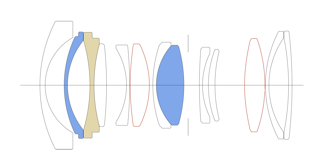 SLDガラス2枚、FLDガラス1枚を採用し、明るいレンズで特に気になる軸上色収差を中心に補正。さらに、Sigma唯一の生産拠点・会津工場の加工技術が可能にする、高精度のグラスモールド非球面レンズを2枚使用することにより、諸収差を良好に補正しながらレンズ枚数を抑制し、小型軽量化を実現しています。