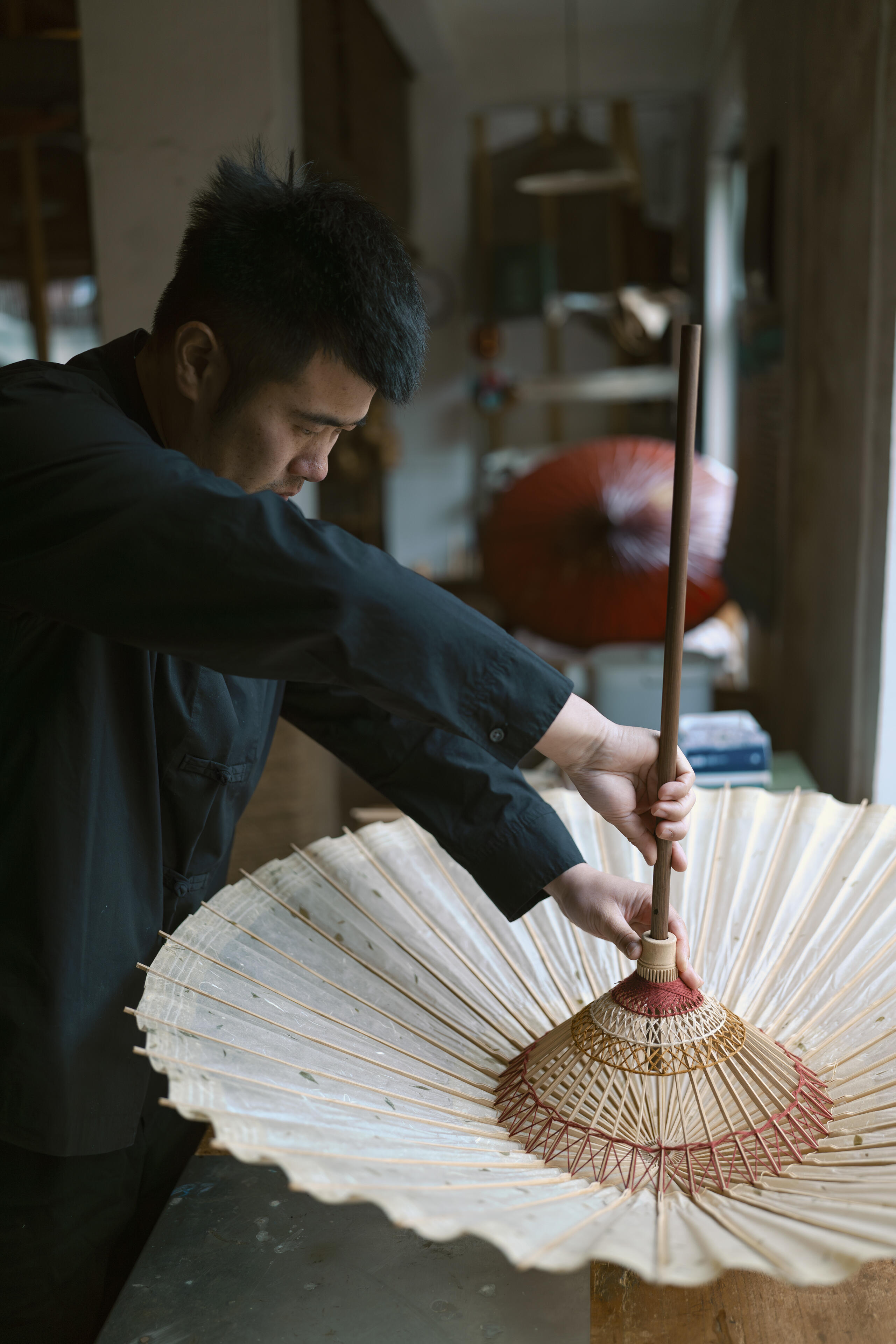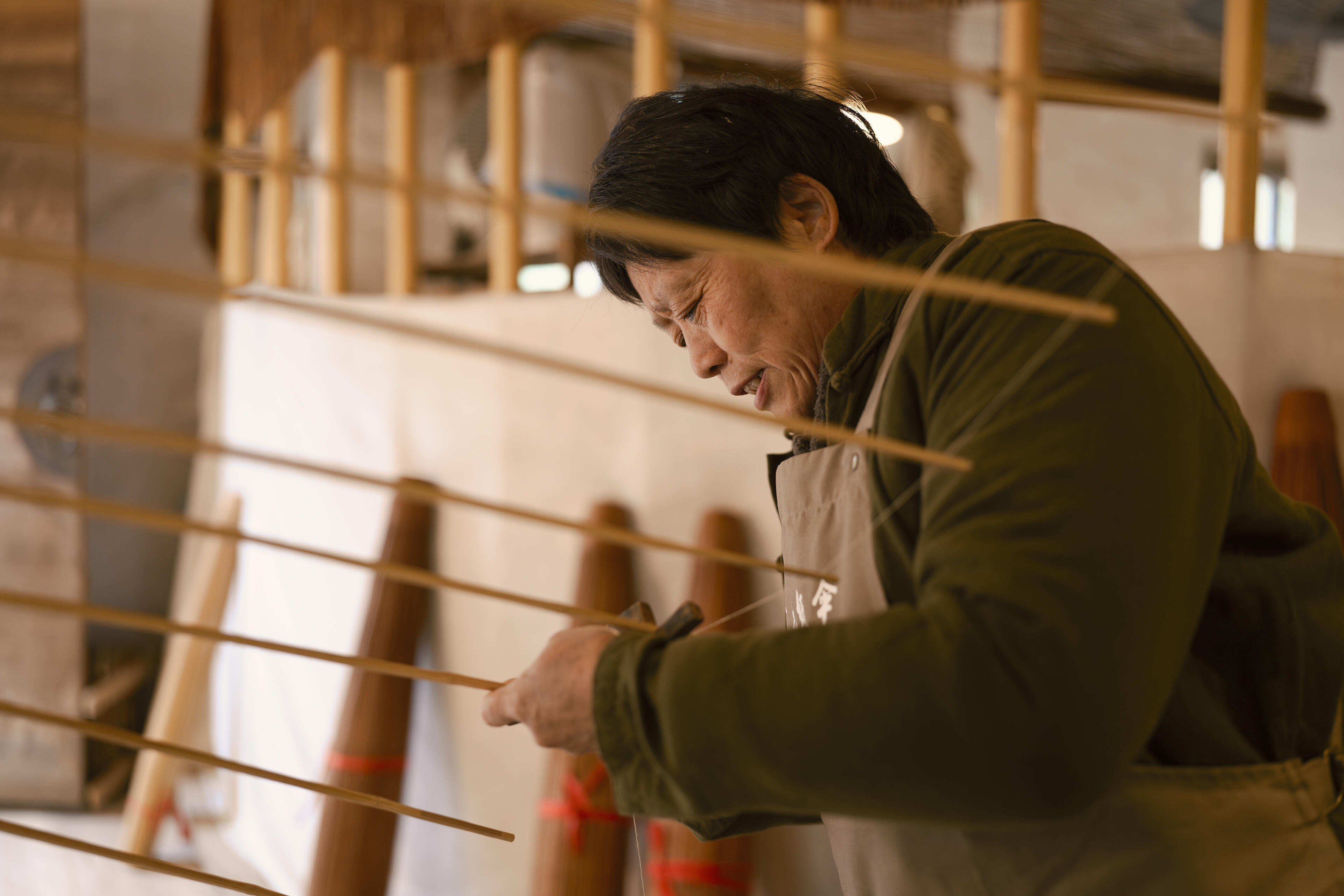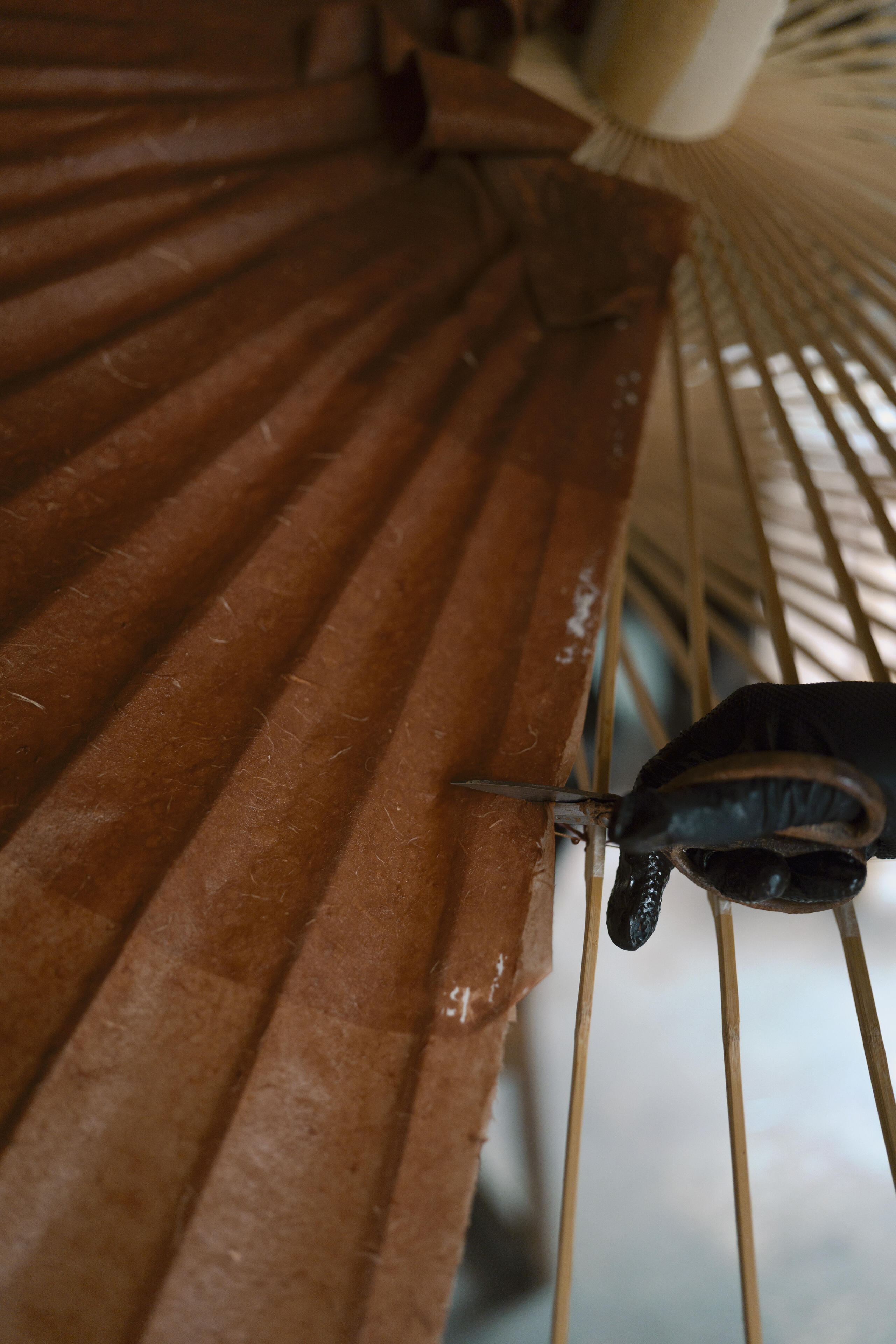工房はやや雑然としていたため、私は主に絞り開放で撮影を行いました。そうすることで、職人の指先の繊細な動きや、傘の骨組みの緻密な構造を際立たせることができました。