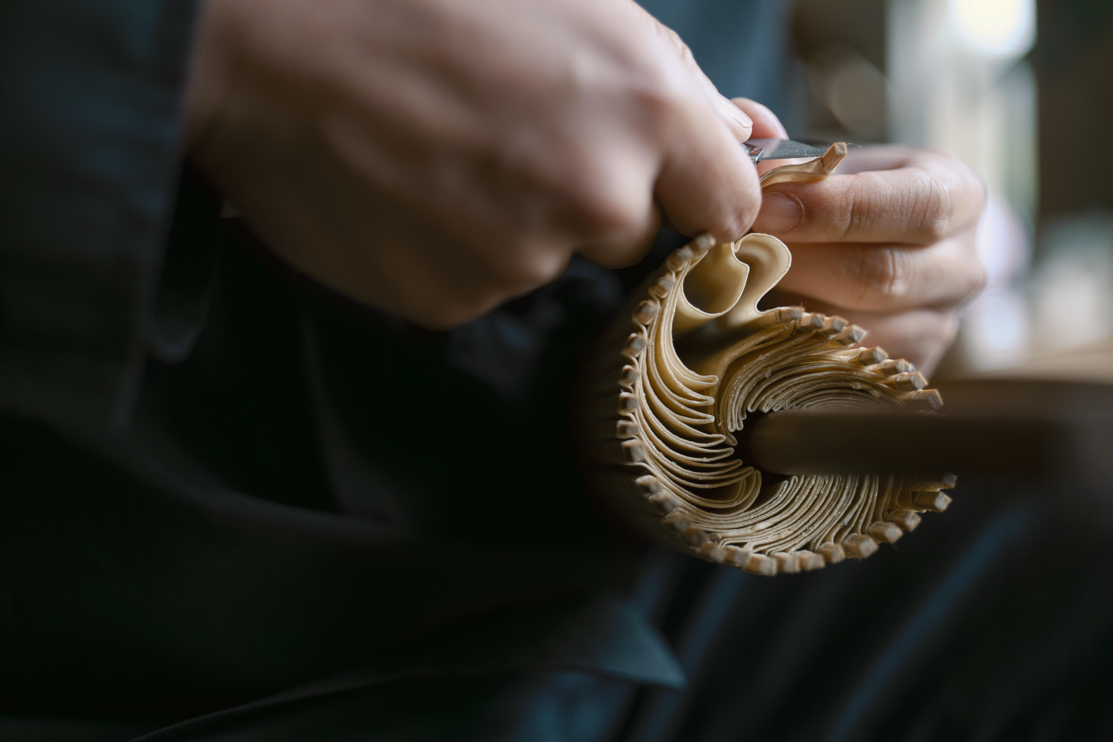 伝統工芸である油紙傘の製作には長時間の工程が伴う一方で、要となる動作の多くは一瞬のうちに行われます。竹を細く裂いて傘の骨を作る工程や、その竹に細い糸を巻き付けて骨組みを作る作業、あるいはハサミで傘の縁を正確に切りそろえていく所作。
