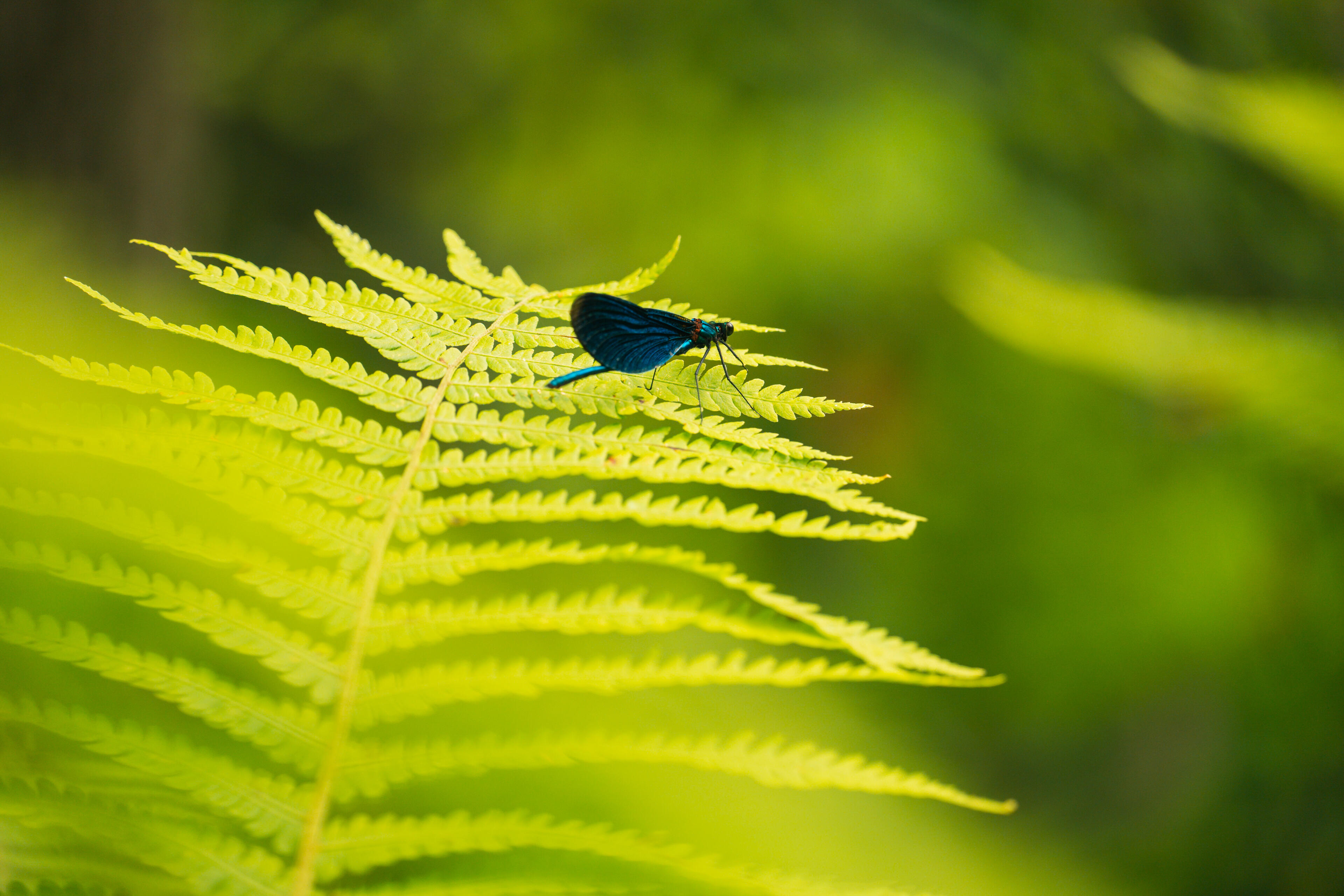 シダ植物が生い茂る森には穏やかな小川が流れ、鳥たちがさえずり、青色の美しいイトトンボが川面を飛び交っています。