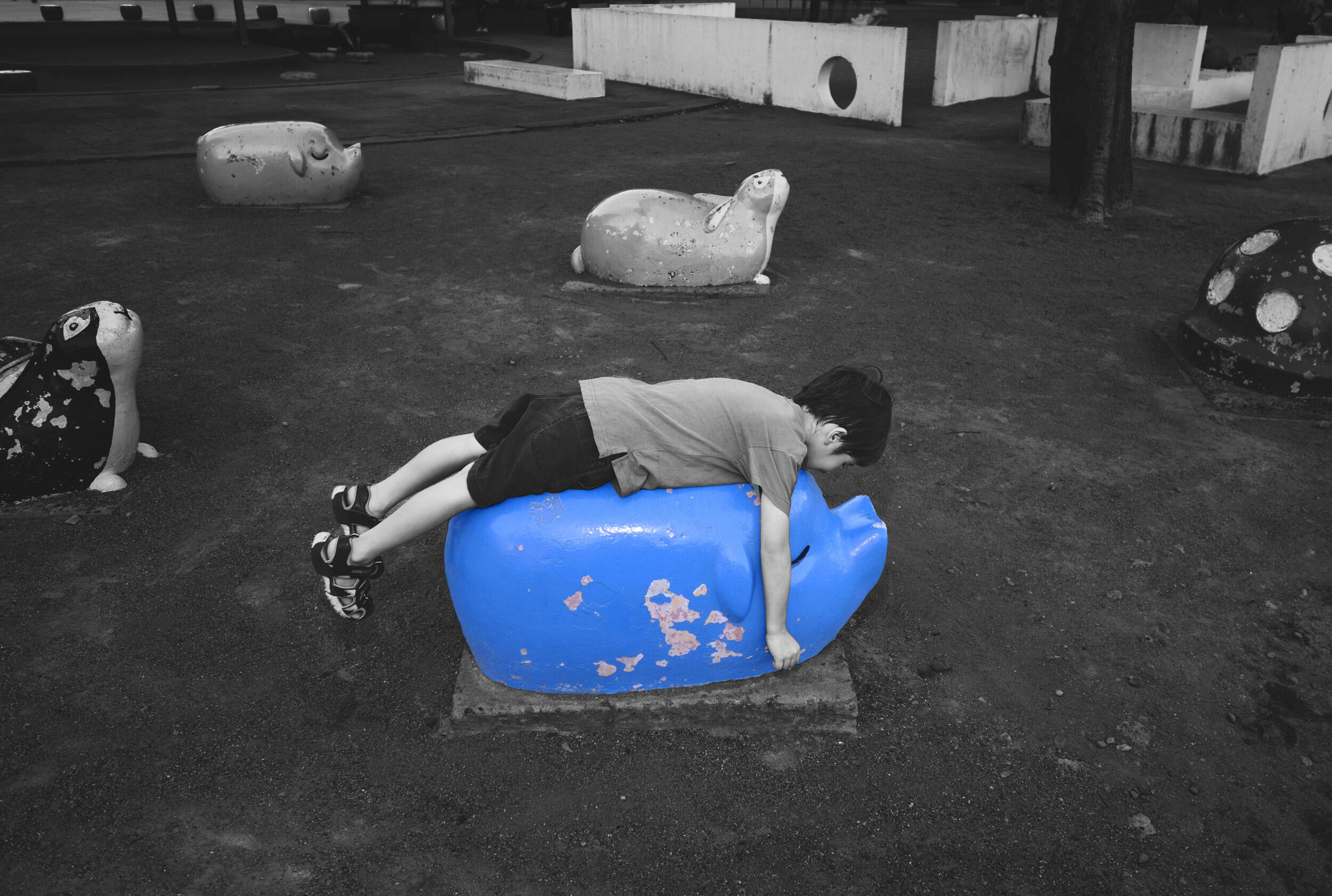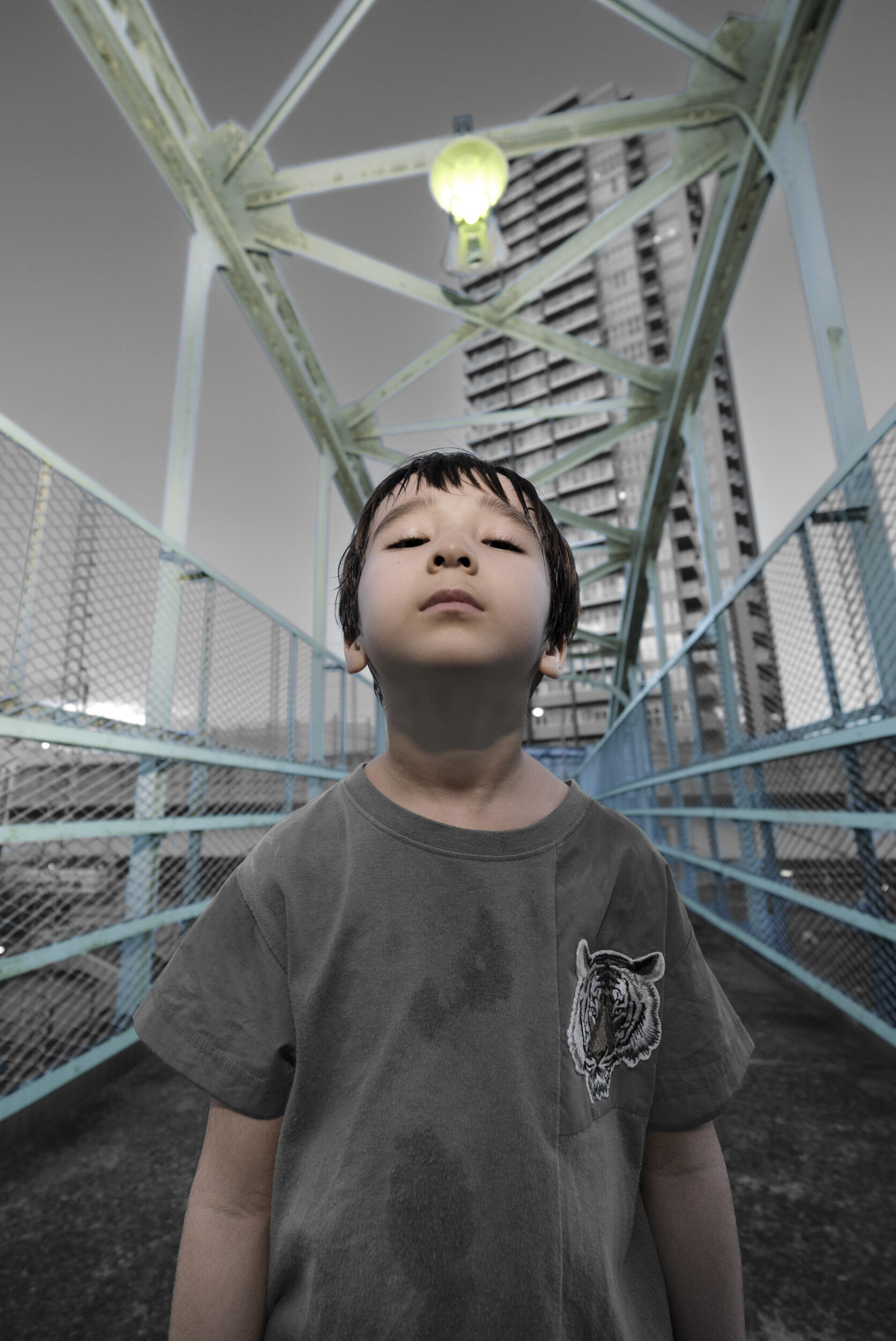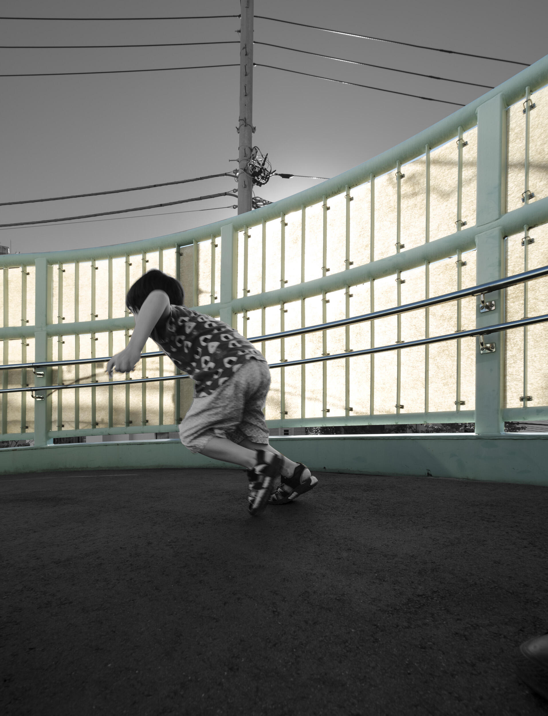 今回の撮影のために、家の中を歩き回りながら末っ子の飛び跳ねるような遊びのリズムについていくのは新鮮な経験でした。私が最近手がけた多くの作品と同じように、今回の写真たちも、こうした日常の瞬間や出会った人々、空間からのインスピレーションに基づいています。写真に施した半カラーと半モノクロームの手法は、私の絵画やスケッチの延長線上で生まれたものです。モノクロームによるグラフィカルな視点と、色の弾けるような鮮やかさの統合を意図しました。息子が遊ぶのに合わせて、形や光、色を使った私の遊びも続きます。今回は特に、感覚、遊び心、子供時代の記憶の呼び起こすものに着目し、特定の色を残すことで写真の中で重要な部分の強調を試みています。