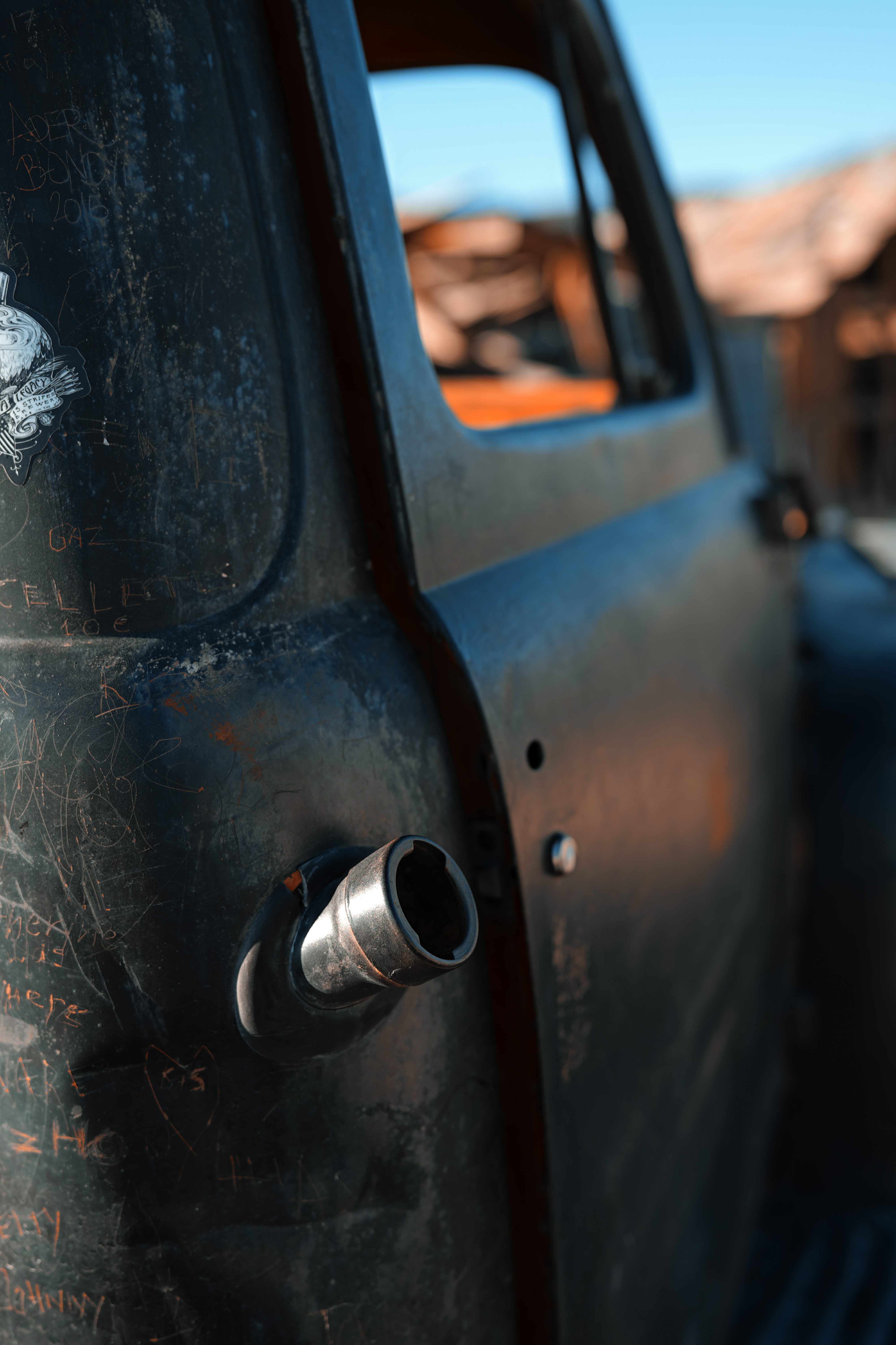 ピックアップトラック越しにShorty Harrisに捧げた彫刻を見る。