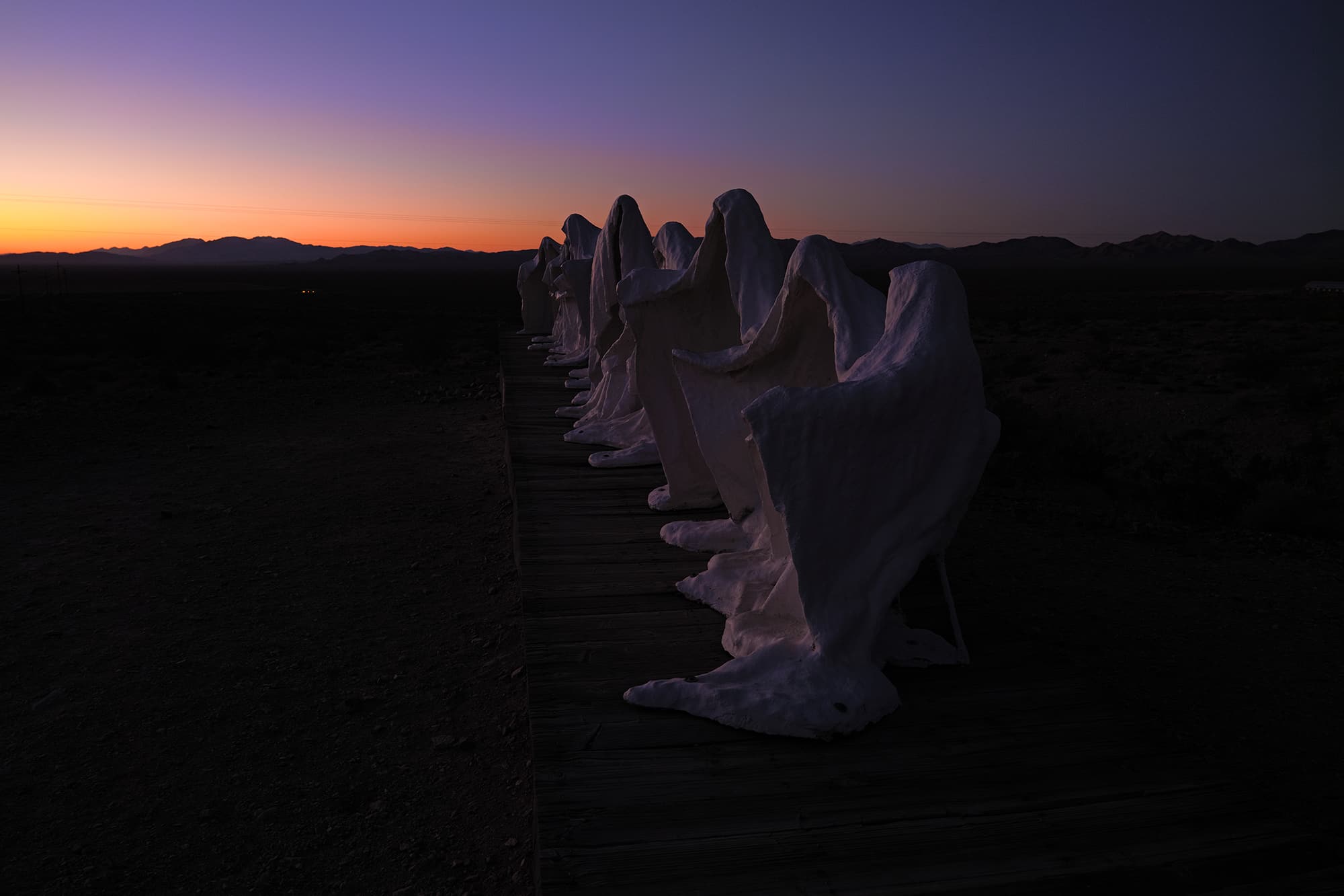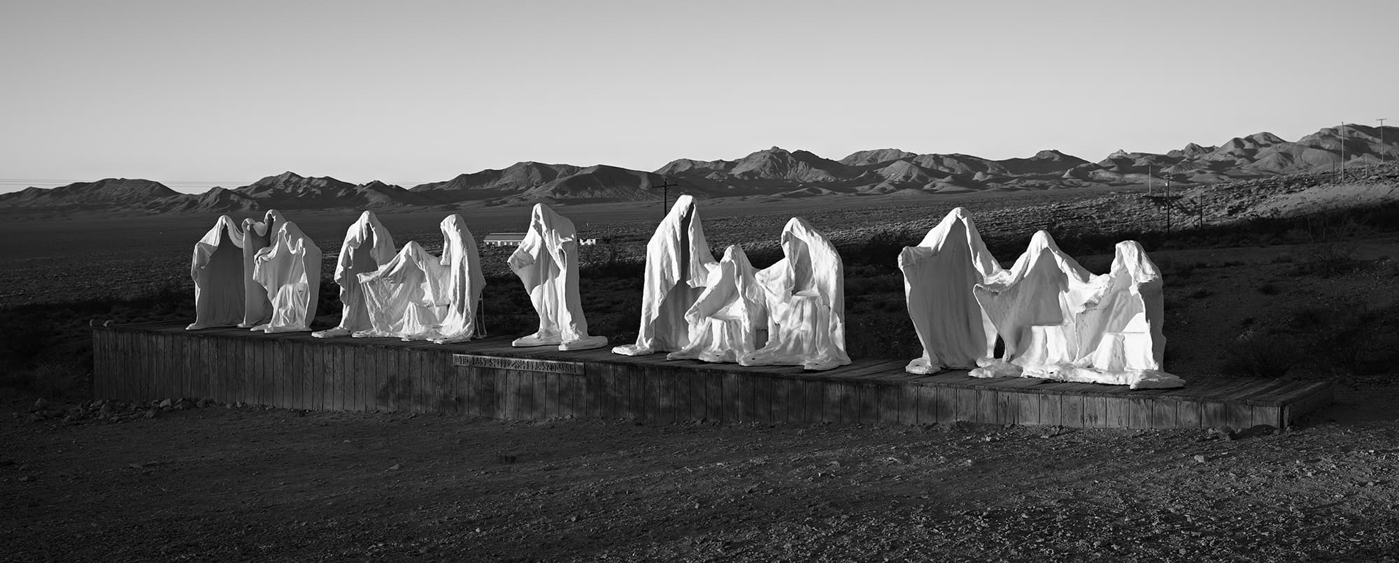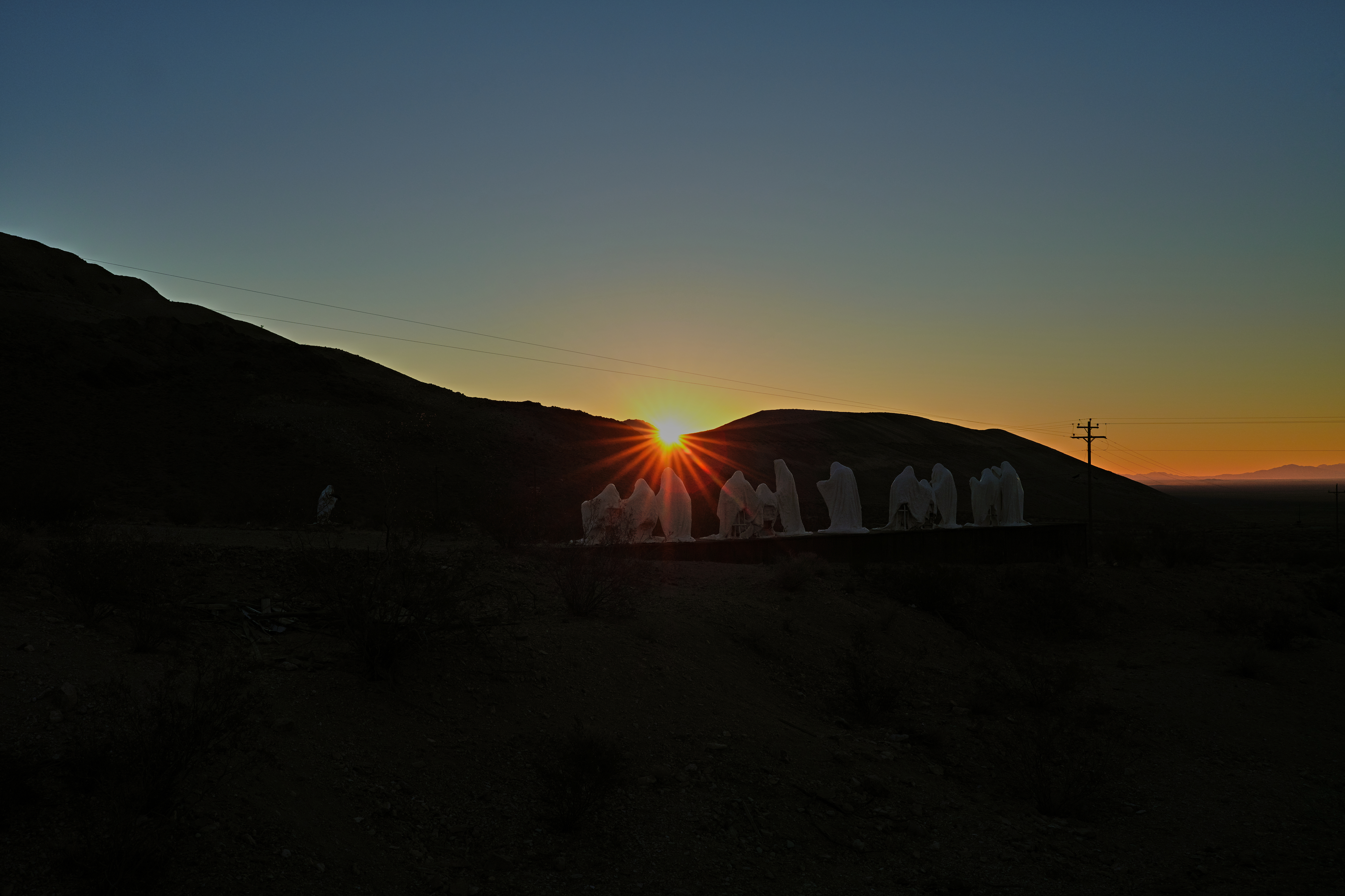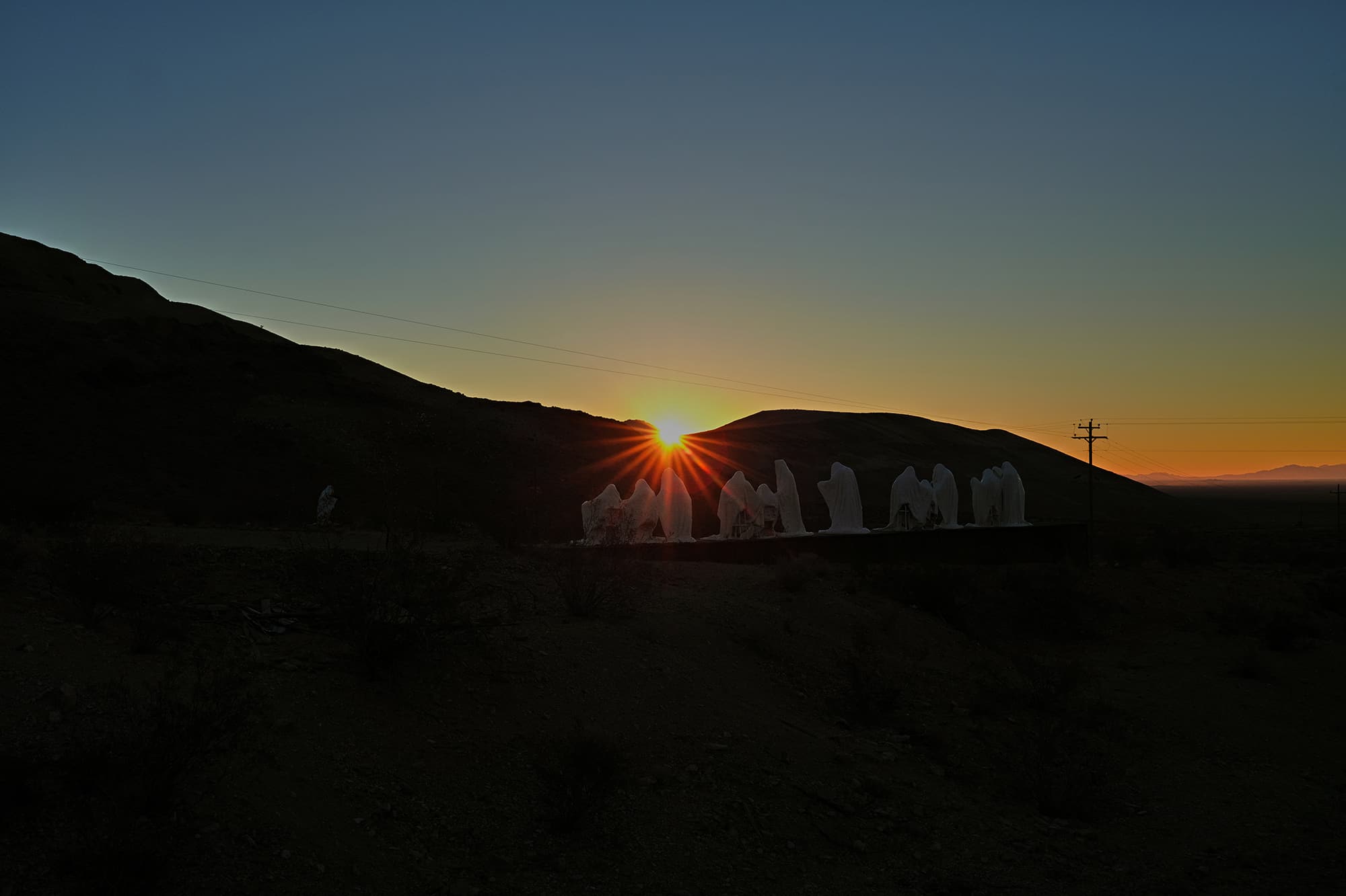 冷え込んだ朝、「最後の晩餐」と題された等身大の白い彫刻は朝陽を浴び、その存在感を増していた。ネバダ州のアマゴサバレー北端に位置するゴーストタウン、ライオライト(Rhyolite)の南にあるGoldwell Open Air Museumには、様々な彫刻が展示されている。