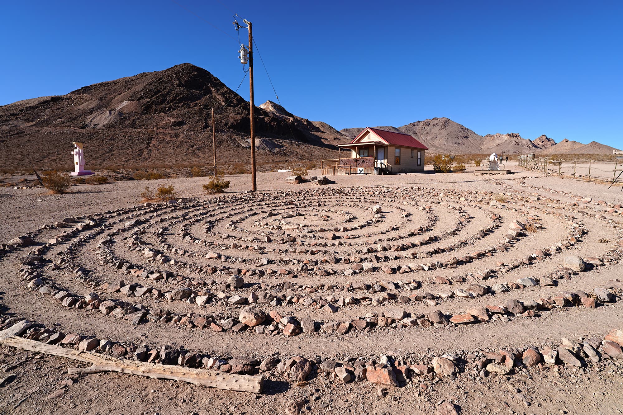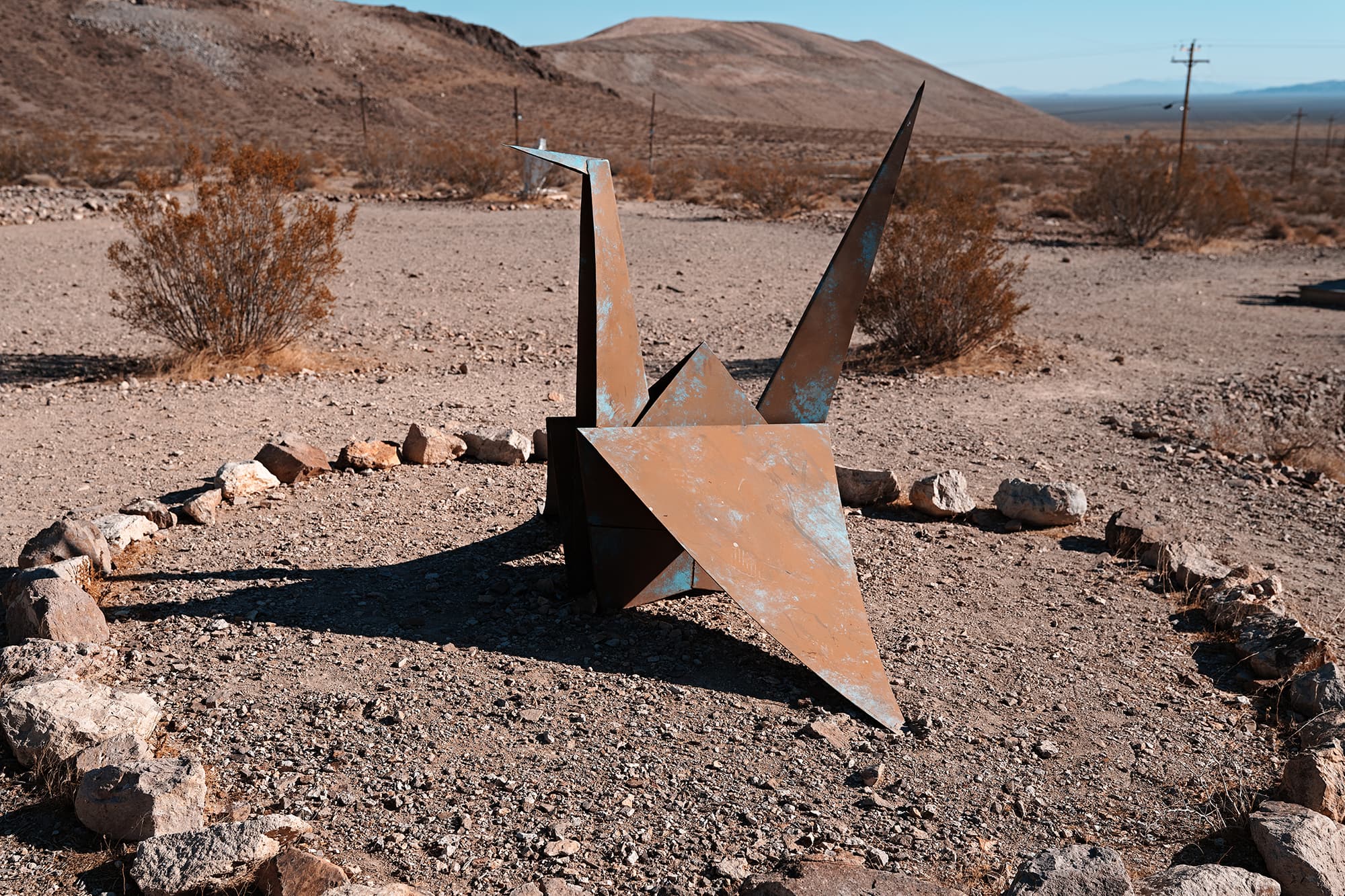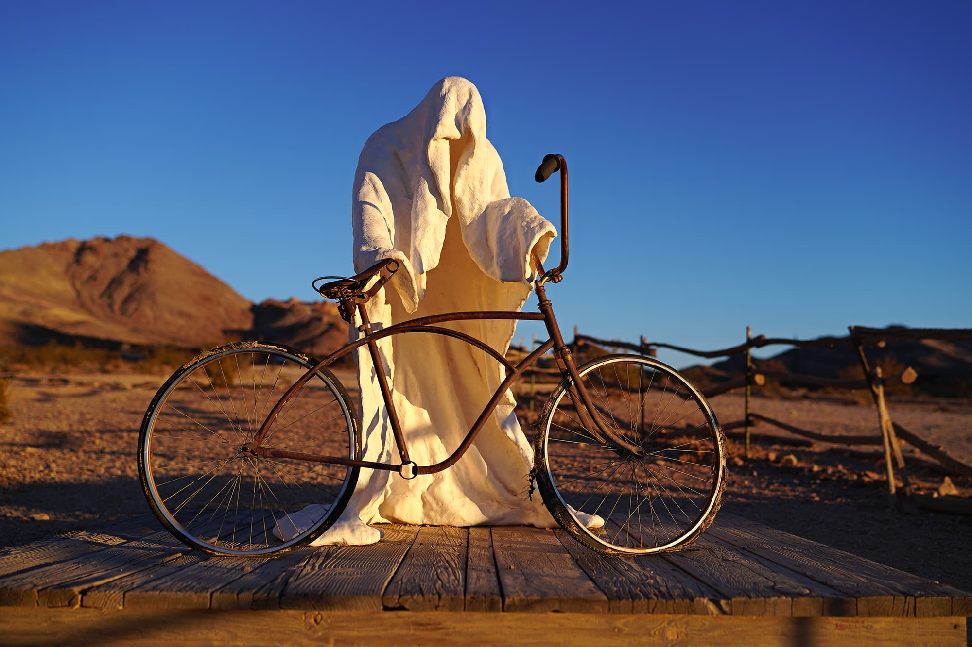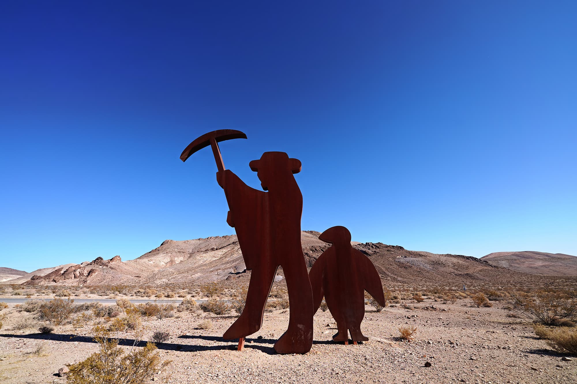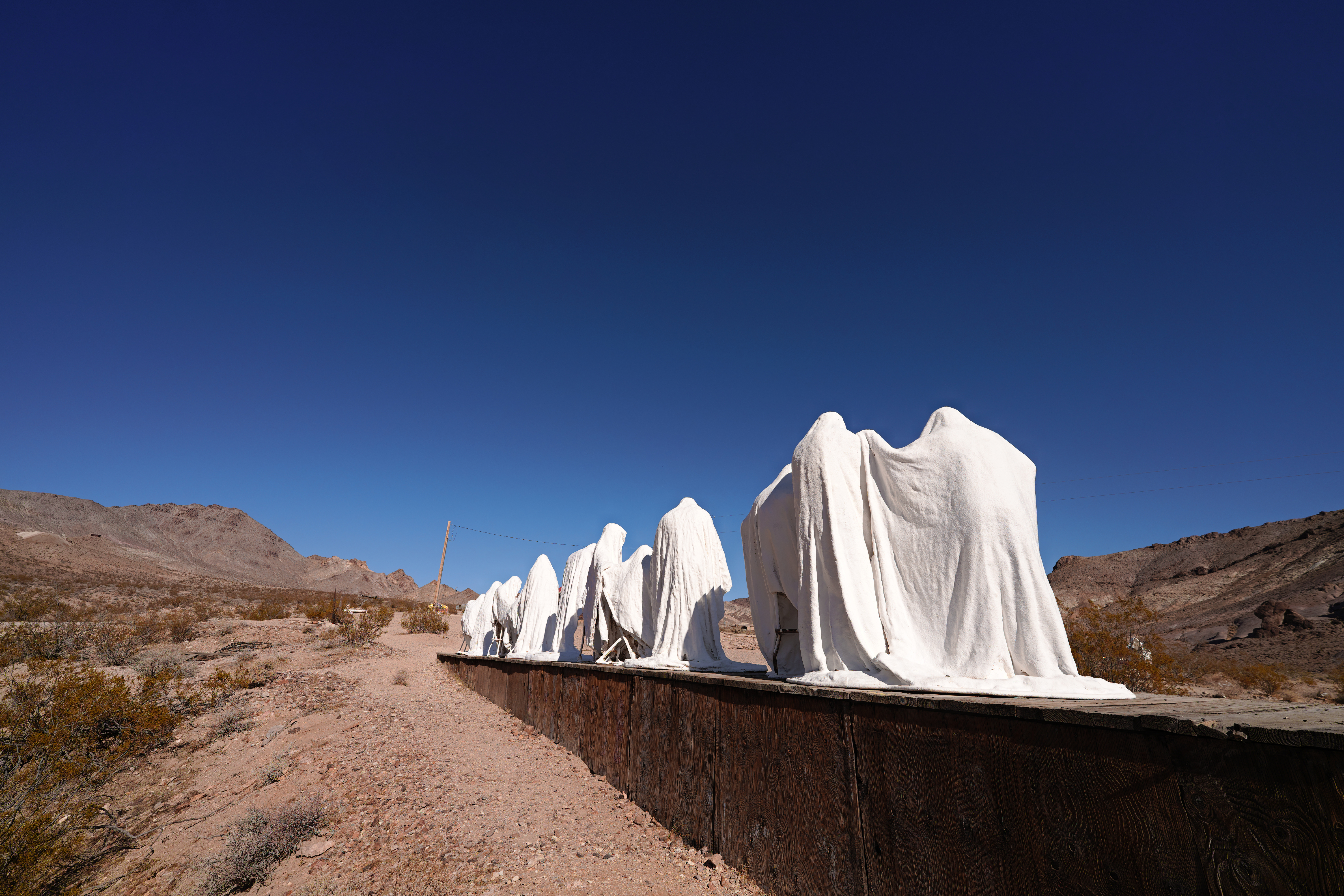 冷え込んだ朝、「最後の晩餐」と題された等身大の白い彫刻は朝陽を浴び、その存在感を増していた。ネバダ州のアマゴサバレー北端に位置するゴーストタウン、ライオライト(Rhyolite)の南にあるGoldwell Open Air Museumには、様々な彫刻が展示されている。