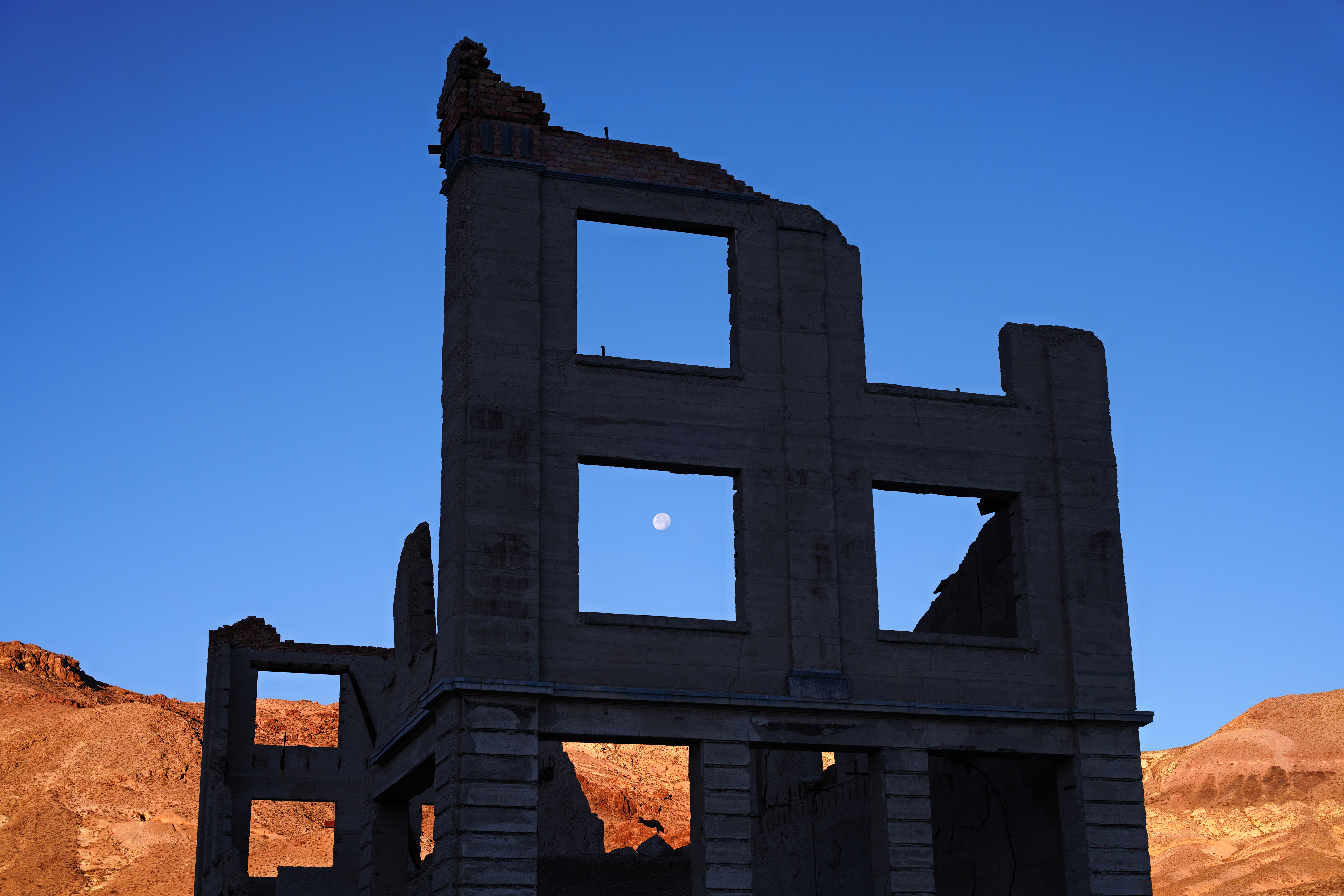 銀行だった建物にはまだ陽の光が届かず、後方の山が朝陽に染まり、雲ひとつない青い空に月が浮かんでいた。
