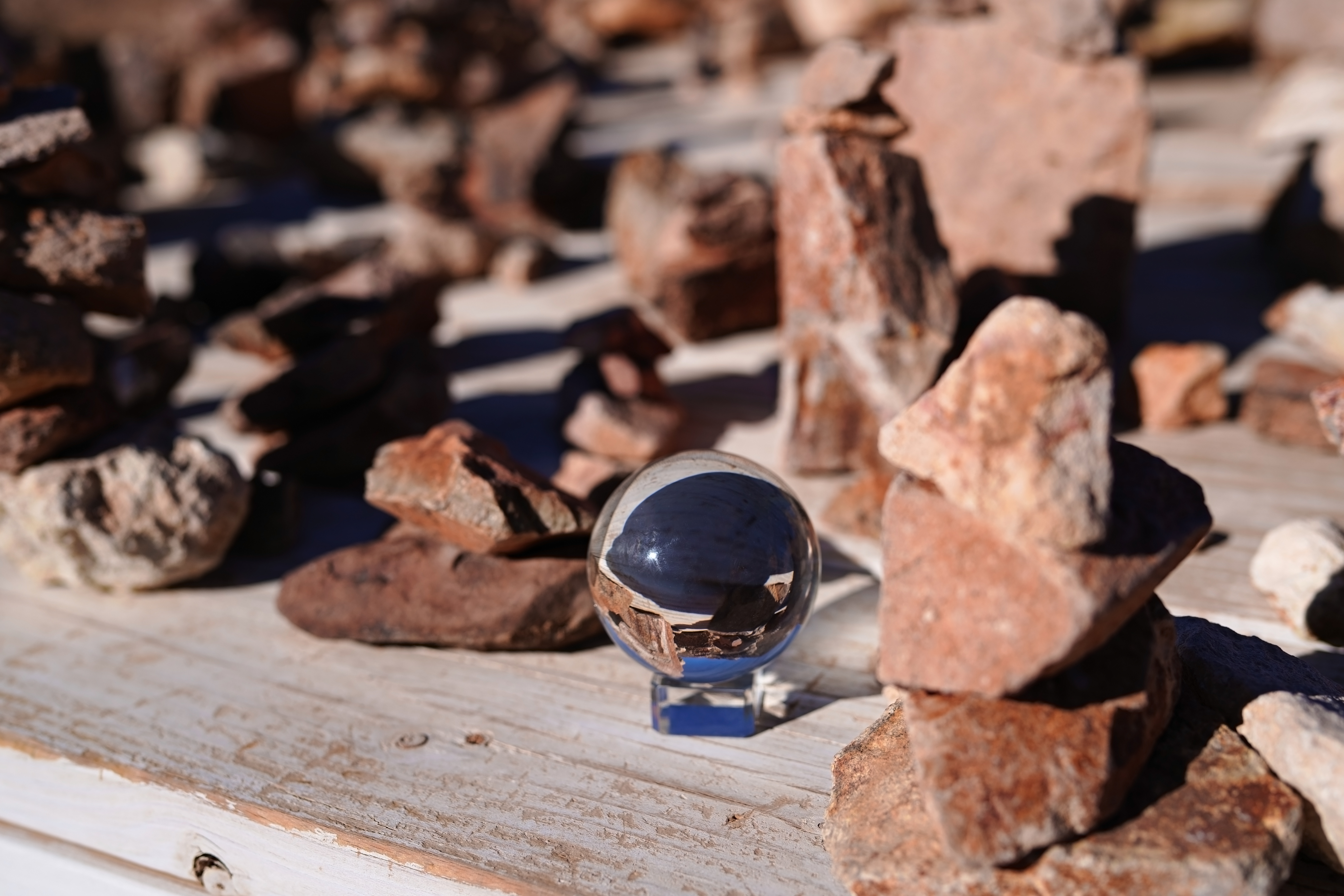 木の台に小さな石が積み上げられ、そこにガラスの球体が置かれている。