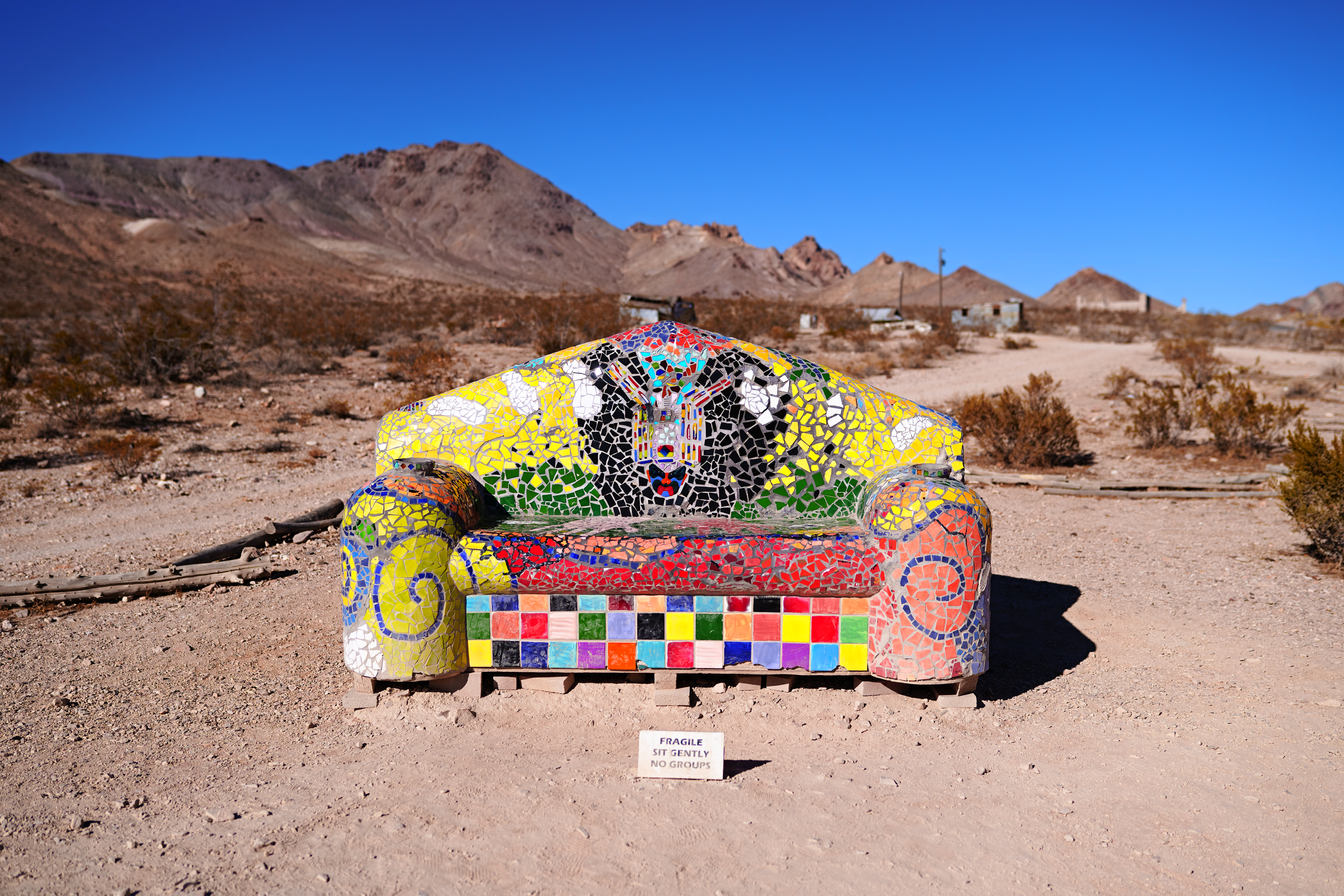 風景色鮮やかなタイル張りの椅子が荒野に置かれている。