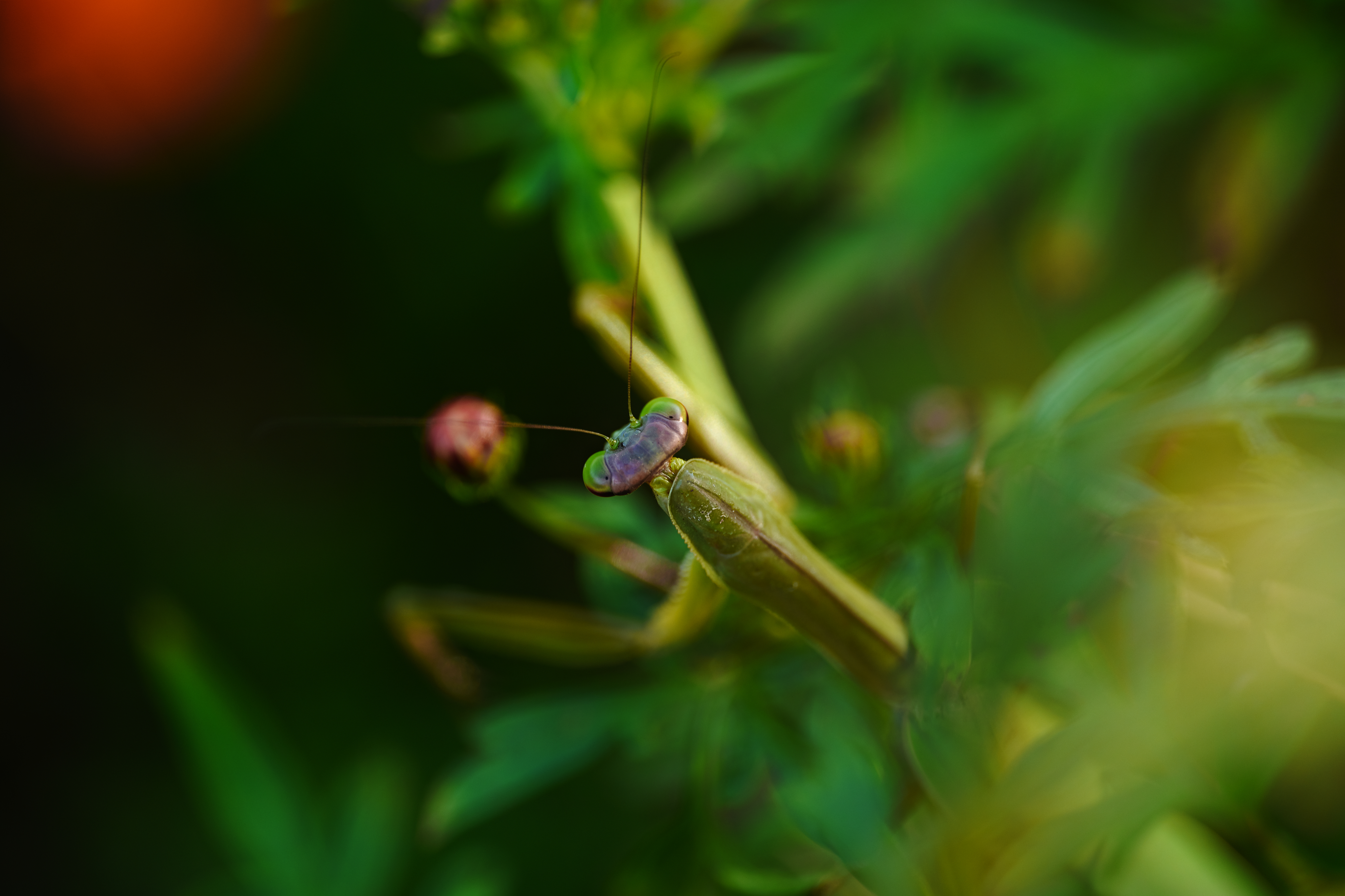 公園の茂みを観察して回る。秋の昆虫と言えばやはりカマキリである。いたるところで獲物を待ち構えて潜んでいるを発見できるはずだ。あまり動かないのでマクロレンズを構えて接近しても撮りやすい。三角の頭を人間のように動かしてこちらを見る姿がかわいらしい。