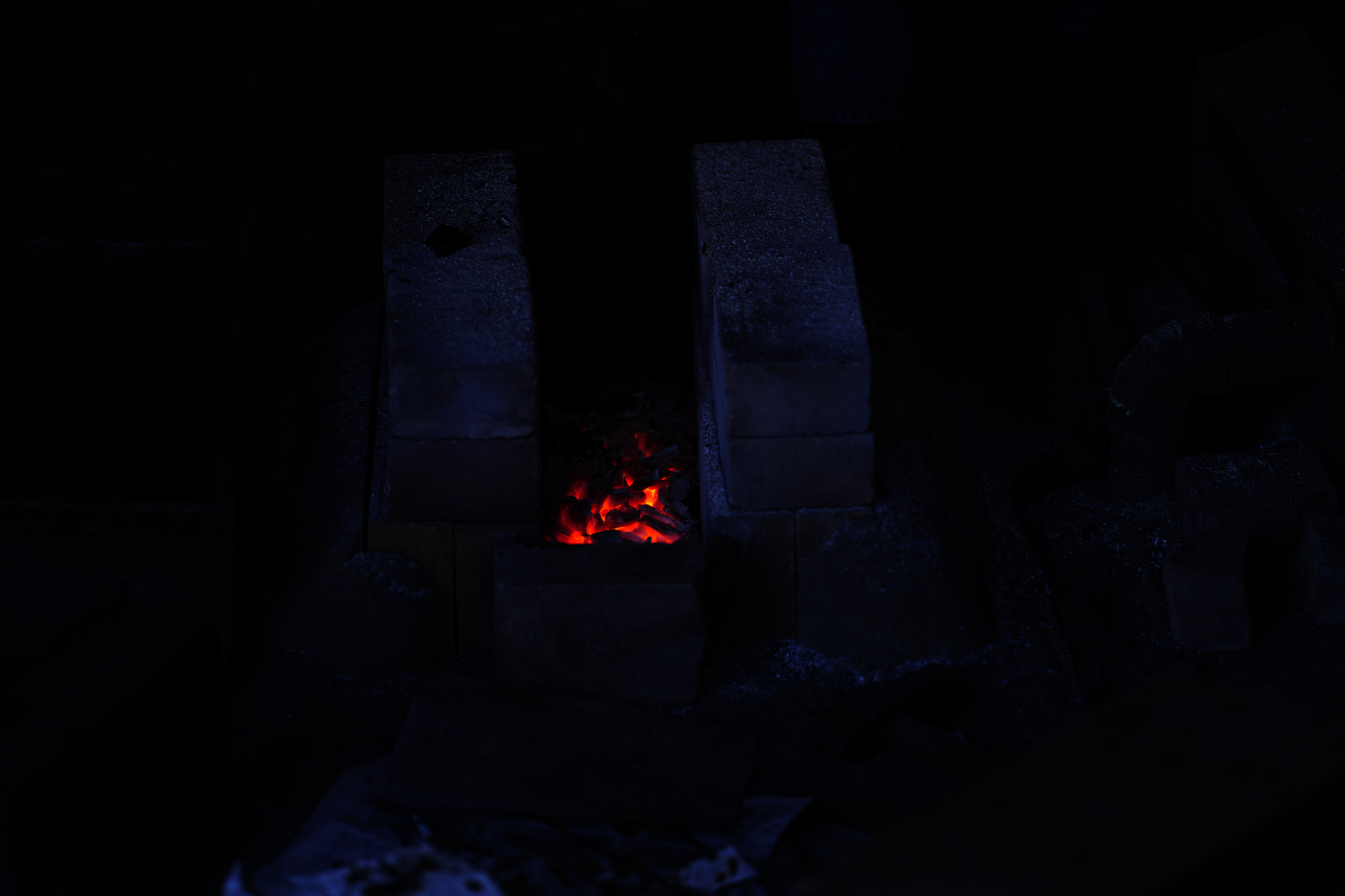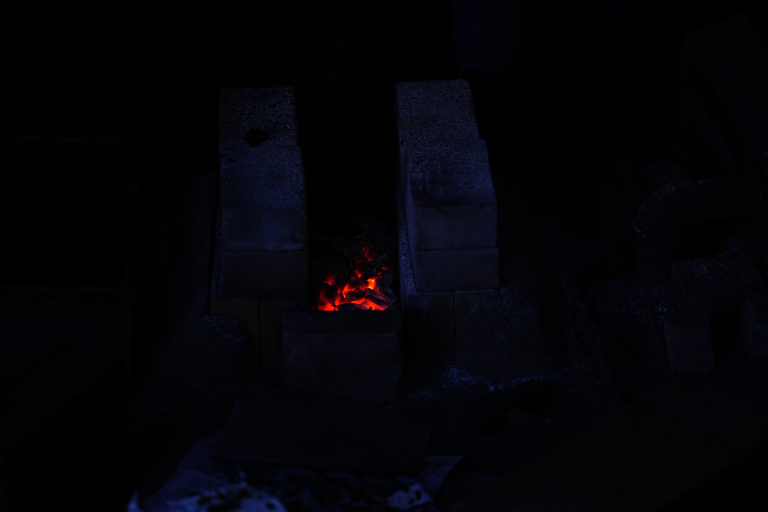 古民家では伝統技術(藍染め、綿、鍛冶、そば、木挽き)などを実演する場所がある。この日は鍛冶をやっていた。鍛冶小屋の火炉(ホド)で小刀(だろうか)を作っていた。