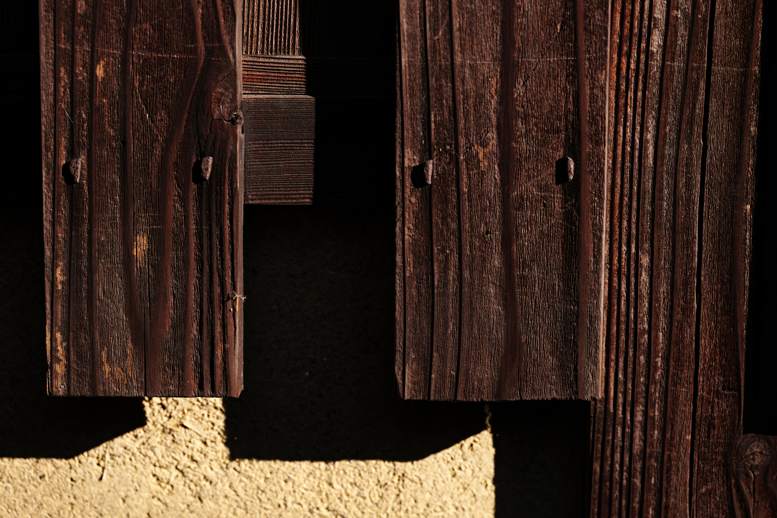 古民家に来た。今日は「SIGMA 105mm F2.8 DG DN MACRO | Art」とテレコンバーターしか携行していないので、古い建物のディテールをググッと寄って探って回る。これが楽しい。板塀と漆喰の境界や、釘と合わせの様子をキャプチャーする。解像感豊かな描写が快感である。